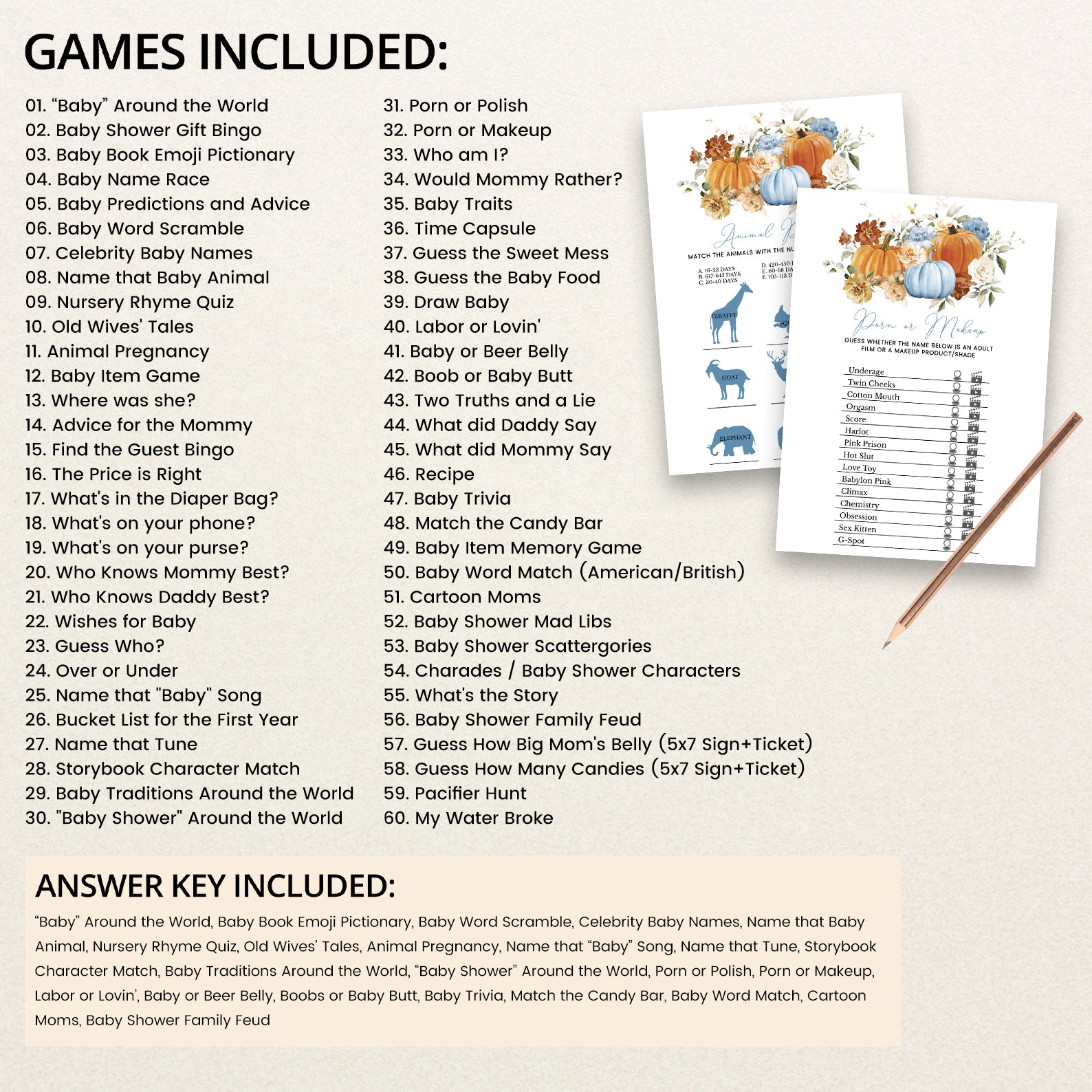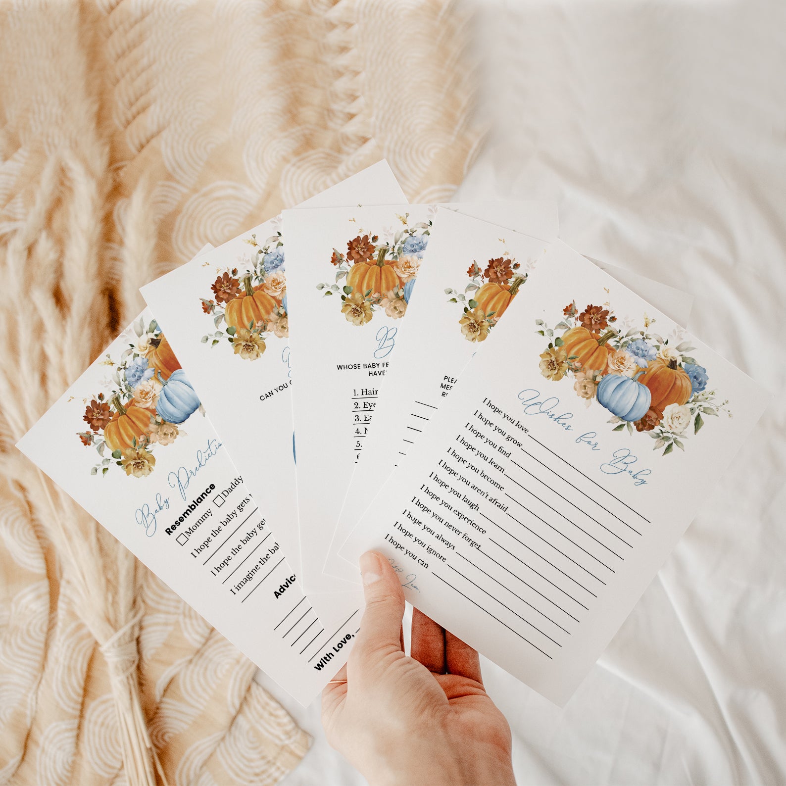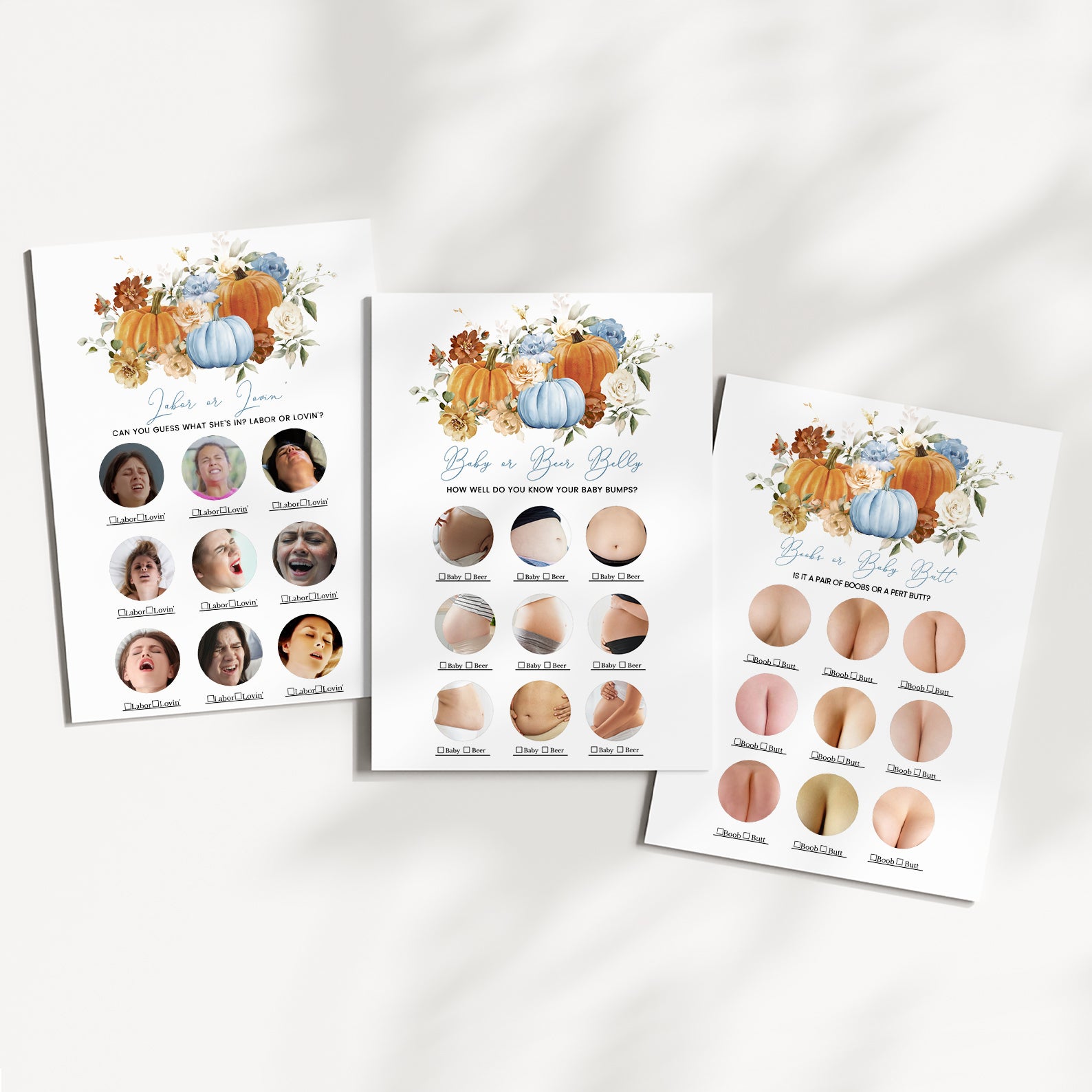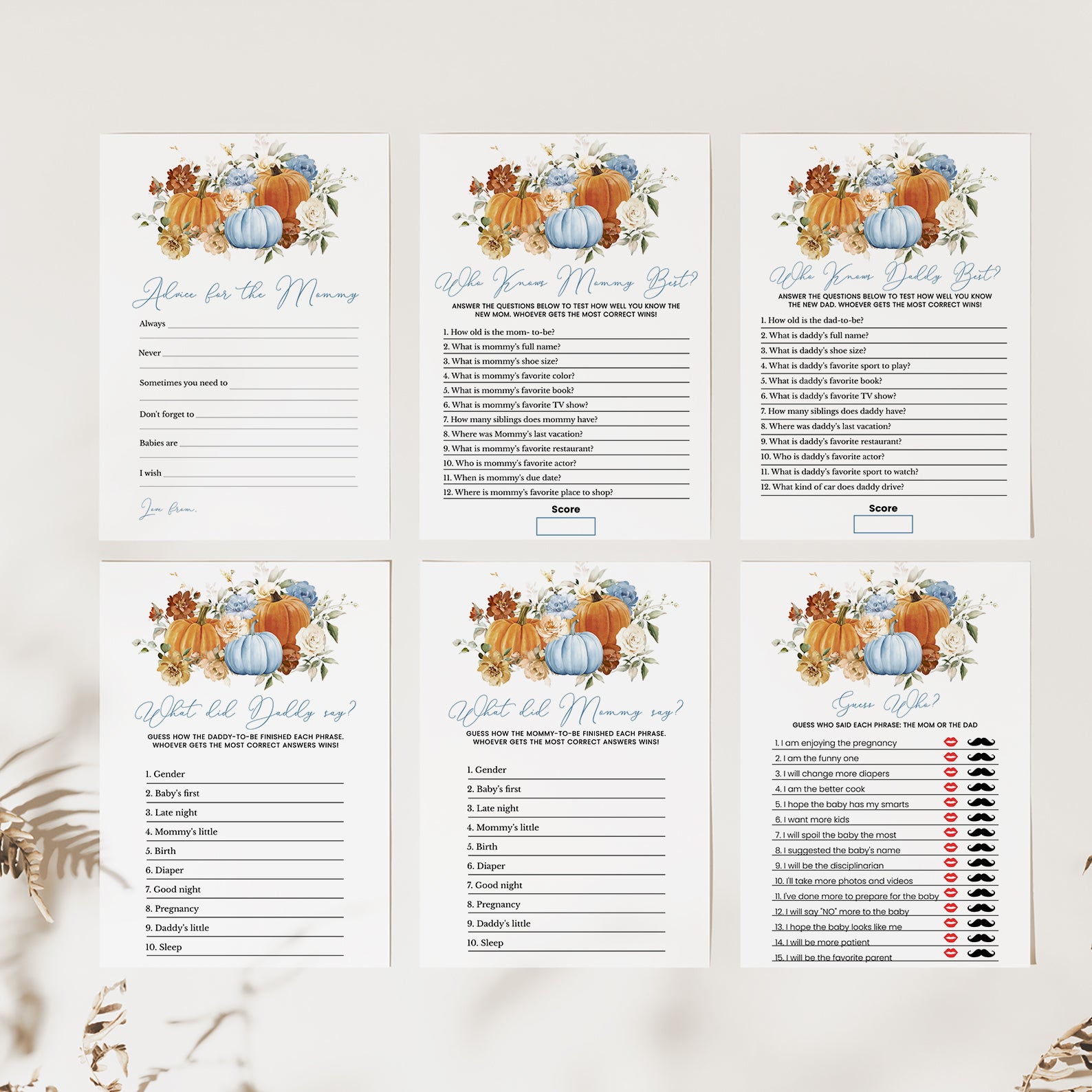 Make your fall baby shower unforgettable with our beautifully designed bundle of 60 editable baby shower games! Featuring a cozy autumn theme with vibrant orange and blue pumpkins, soft florals, and seasonal charm, this collection offers a wide variety of fun and engaging activities for your guests. From classics like Bingo and Word Scramble to unique games like Guess the Baby Food, each printable is easy to customize and perfect for celebrating your little pumpkin’s arrival!