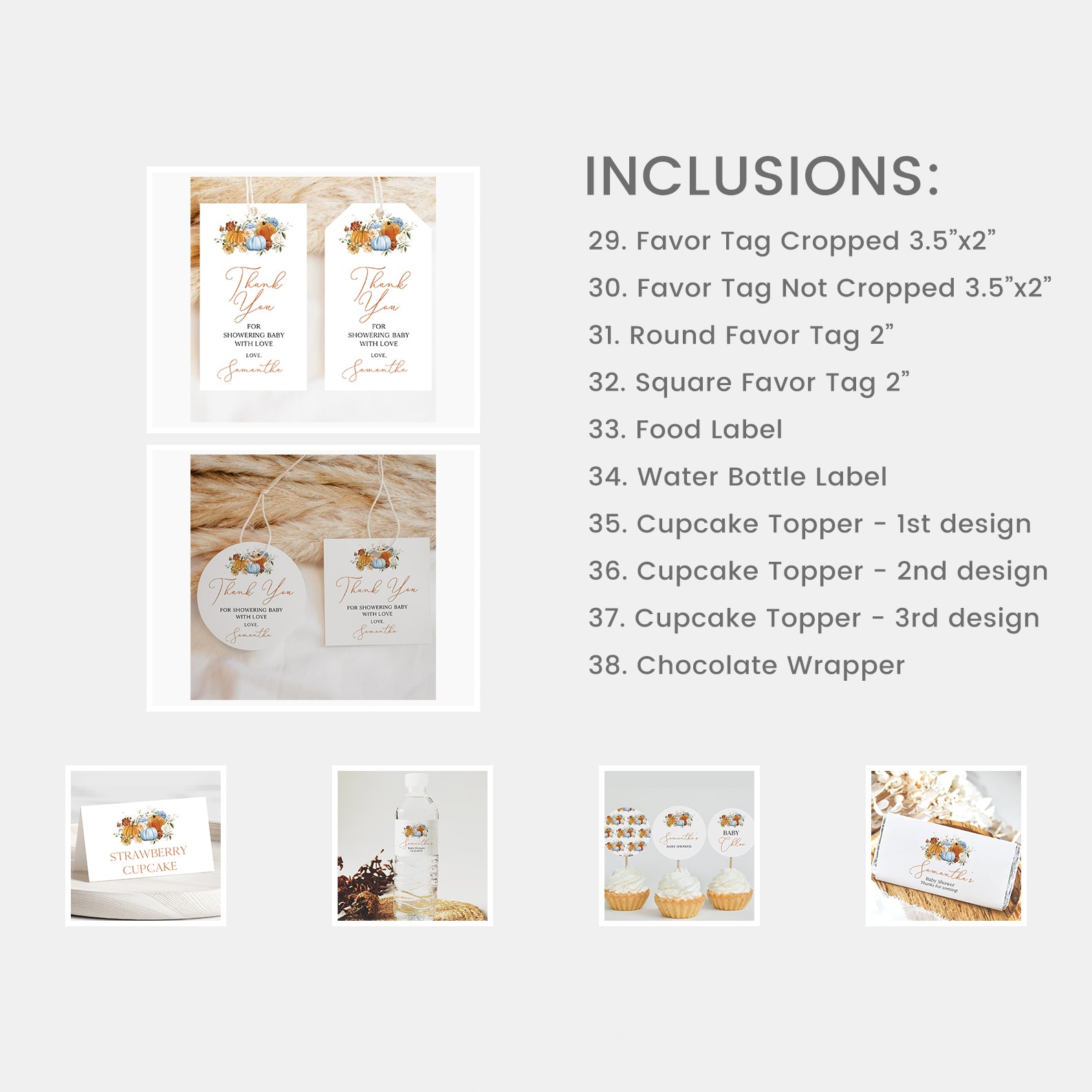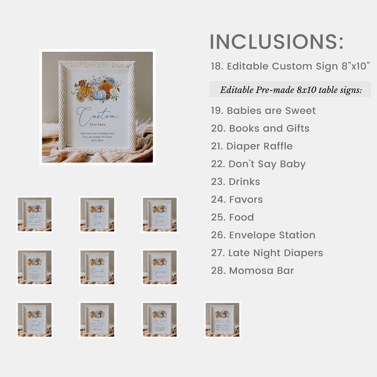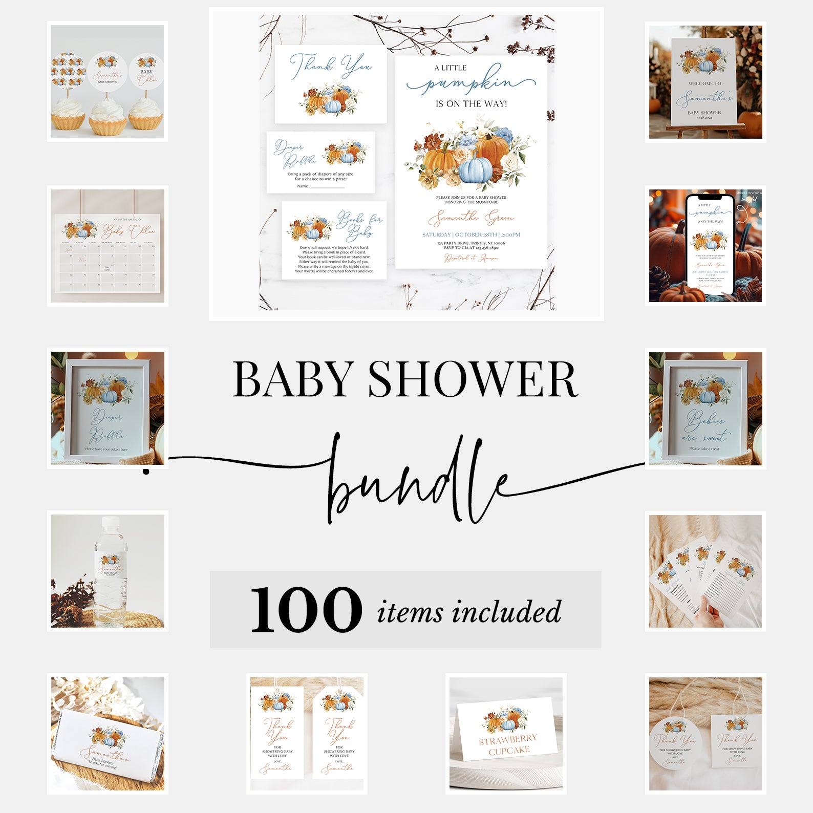 Celebrate your little pumpkin in style with our ultimate Fall Baby Shower Mega Bundle! This all-in-one digital set includes 100 editable items from invitations (front and back), mobile invites, and thank you cards to diaper raffle tickets, games, favor tags, table signs, food labels, water bottle wraps, cupcake toppers, chocolate wrappers, and more. Designed with charming orange and blue pumpkins, soft florals, and warm autumn hues, it’s everything you need for a beautifully coordinated and memorable fall celebration.