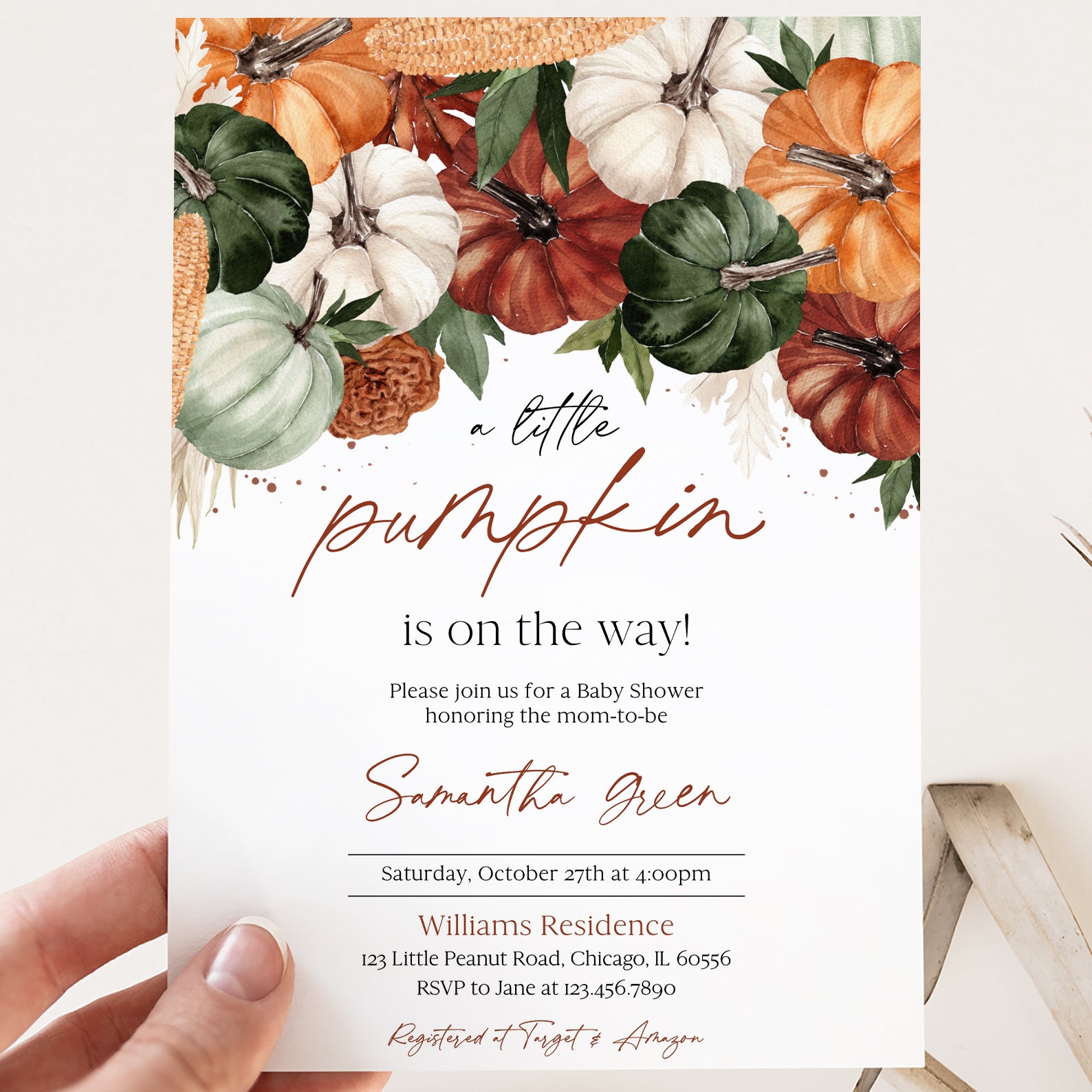 - Purchase this Harvest Charm: Watercolor Pumpkin Baby Shower Invitation template