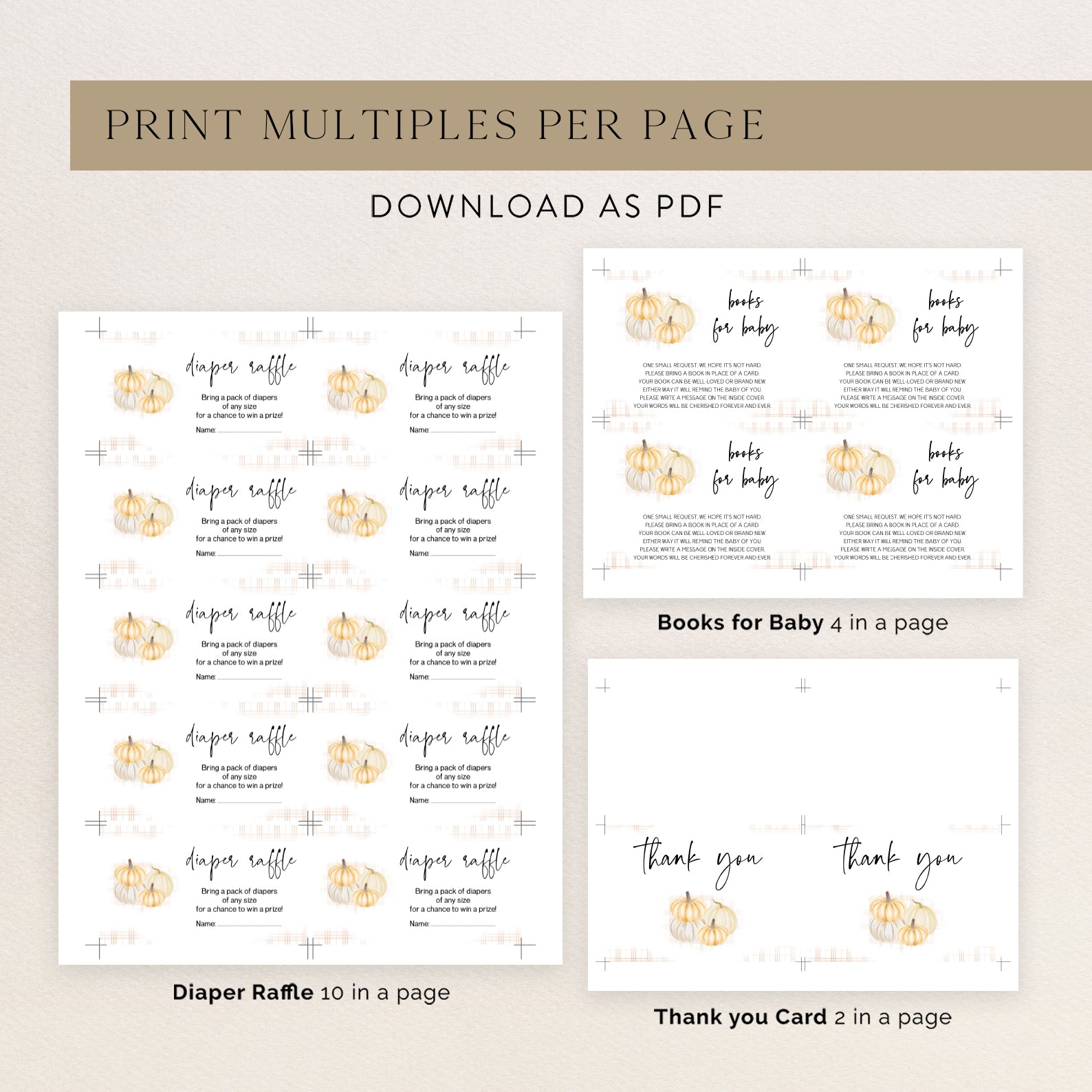 Celebrate your little pumpkin’s arrival with our Fall Baby Shower Invitation Bundle. This set includes a digital invitation, mobile invite, diaper raffle, books for baby card, and thank you card, all featuring charming orange and light green pumpkins with a faded checkered background. It’s perfect for adding a touch of autumn warmth to your cozy gathering.