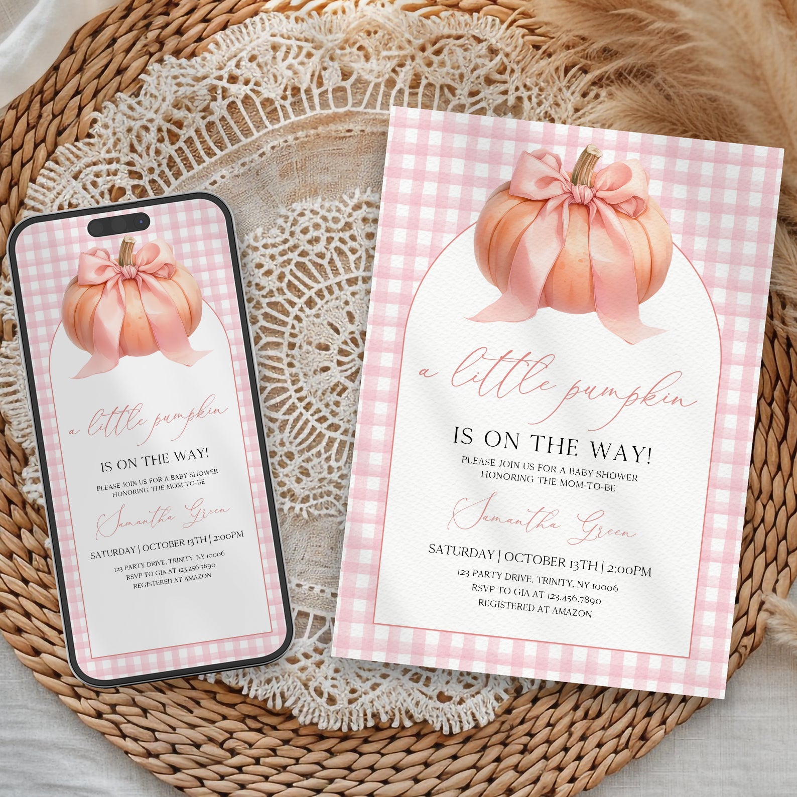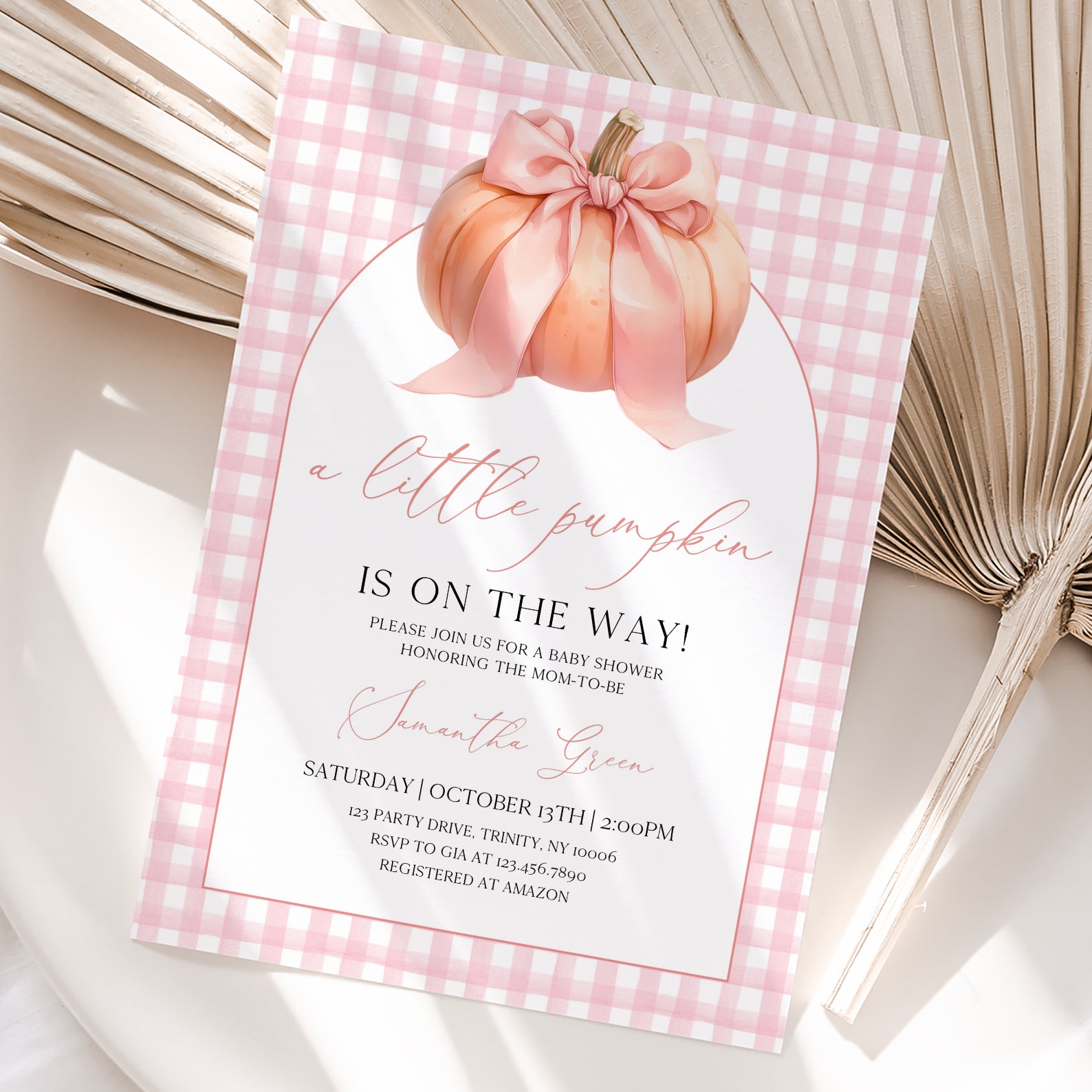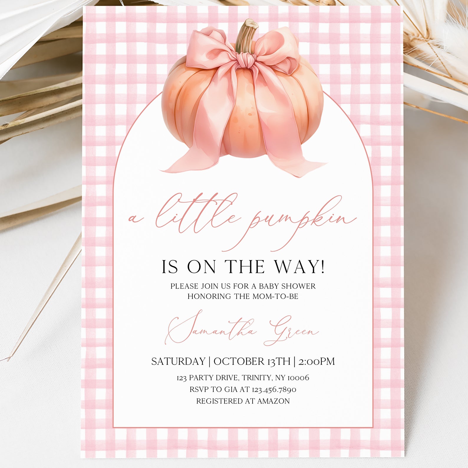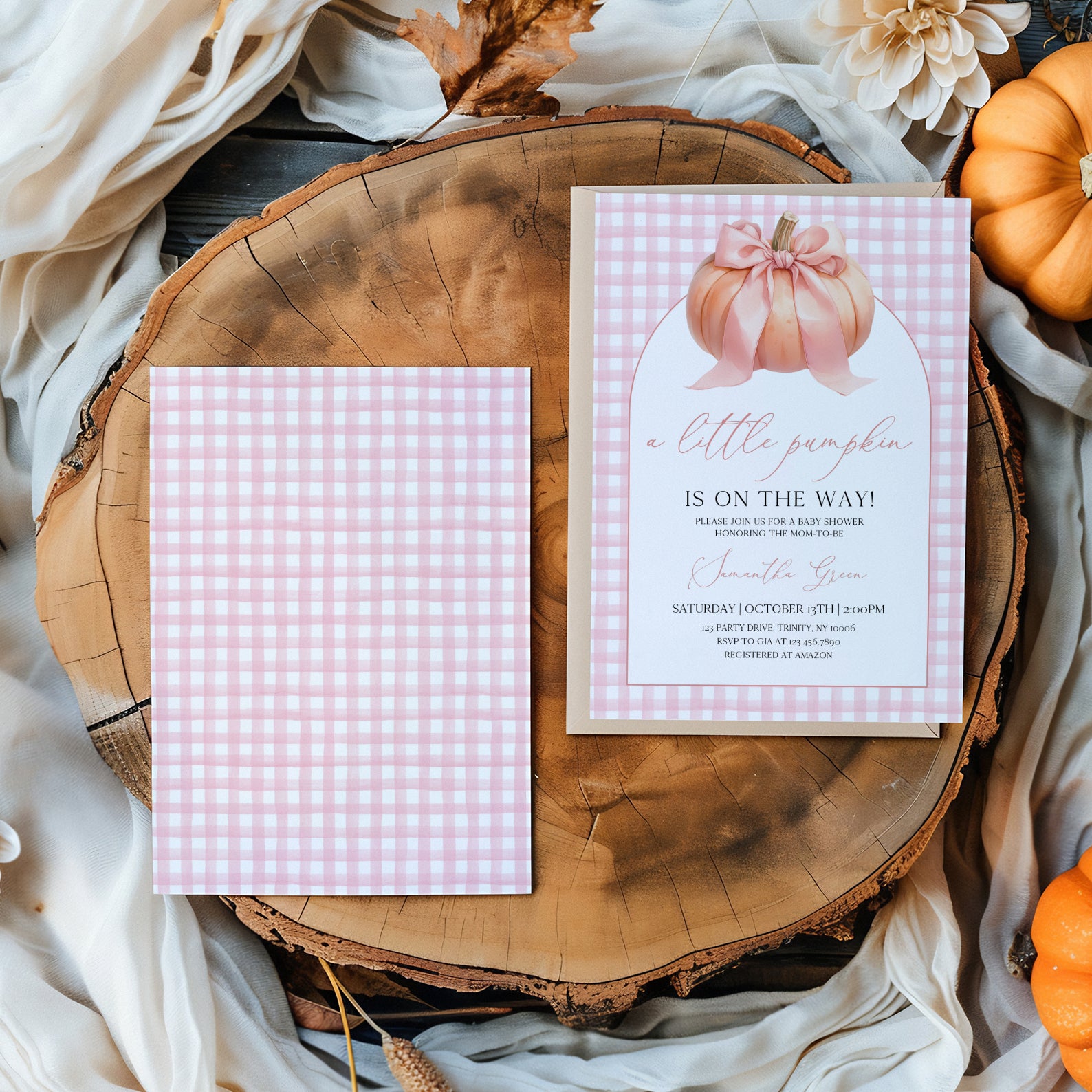 - Purchase this Little Pumpkin Baby Shower Invite: Pink Plaid & Peach Theme template