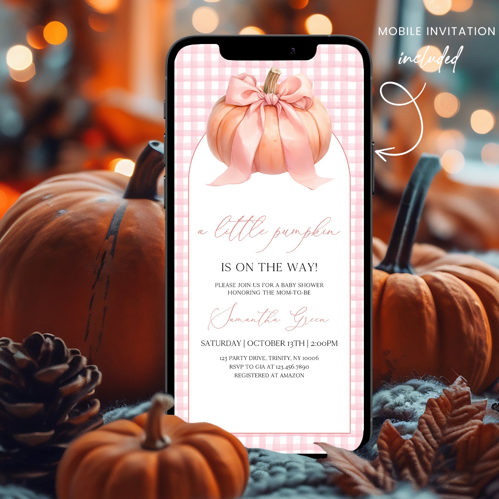 Celebrate the upcoming arrival of your little one with our charming Fall Baby Shower Digital Invitation! Featuring an adorable pink plaid background, this invitation showcases a delightful white arch that elegantly displays all the essential details of your event. At the top, a whimsical peach pumpkin adorned with a sweet pink ribbon adds a touch of seasonal charm, perfectly capturing the spirit of autumn. Easy to customize and share, this invitation sets the tone for a cozy and memorable celebration. Make your baby shower unforgettable with this enchanting design!