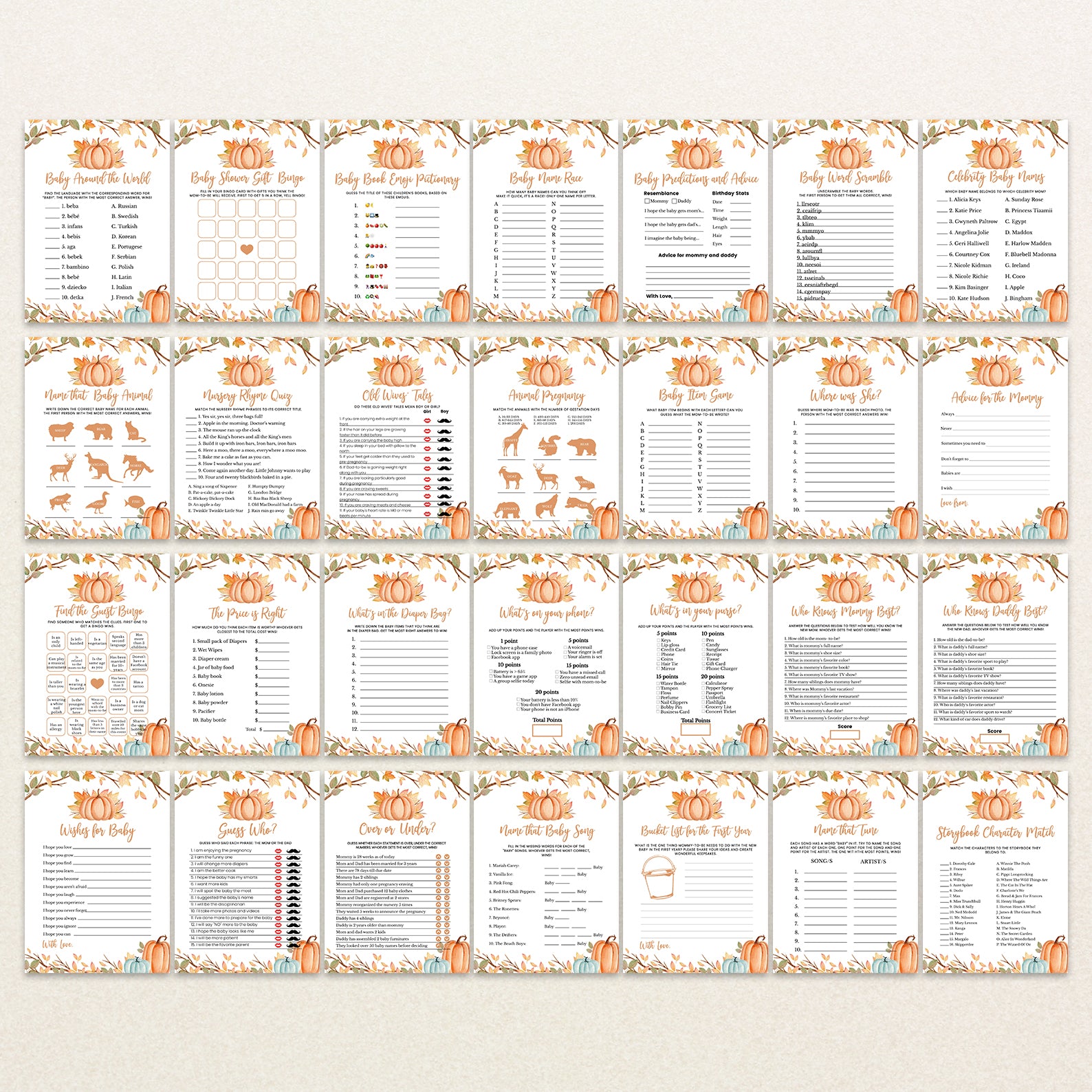 Keep guests entertained with this fall-inspired baby shower game bundle! Featuring 60 editable games, each design includes playful pumpkins, vibrant leaves, and cozy autumn tones. From icebreakers to classics like “Baby Bingo,” this bundle adds fun to your festivities while matching your seasonal theme. Designed for easy customization, it’s a perfect way to engage guests while celebrating your little pumpkin on the way.