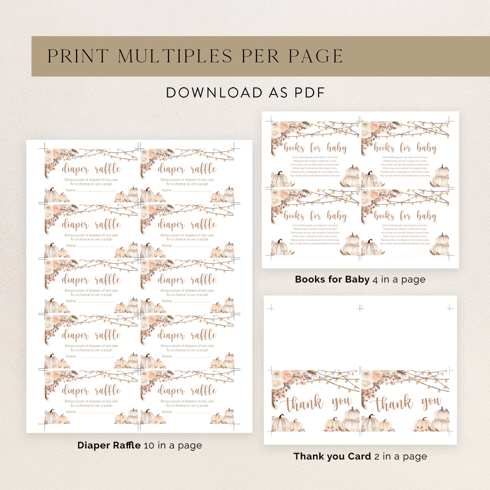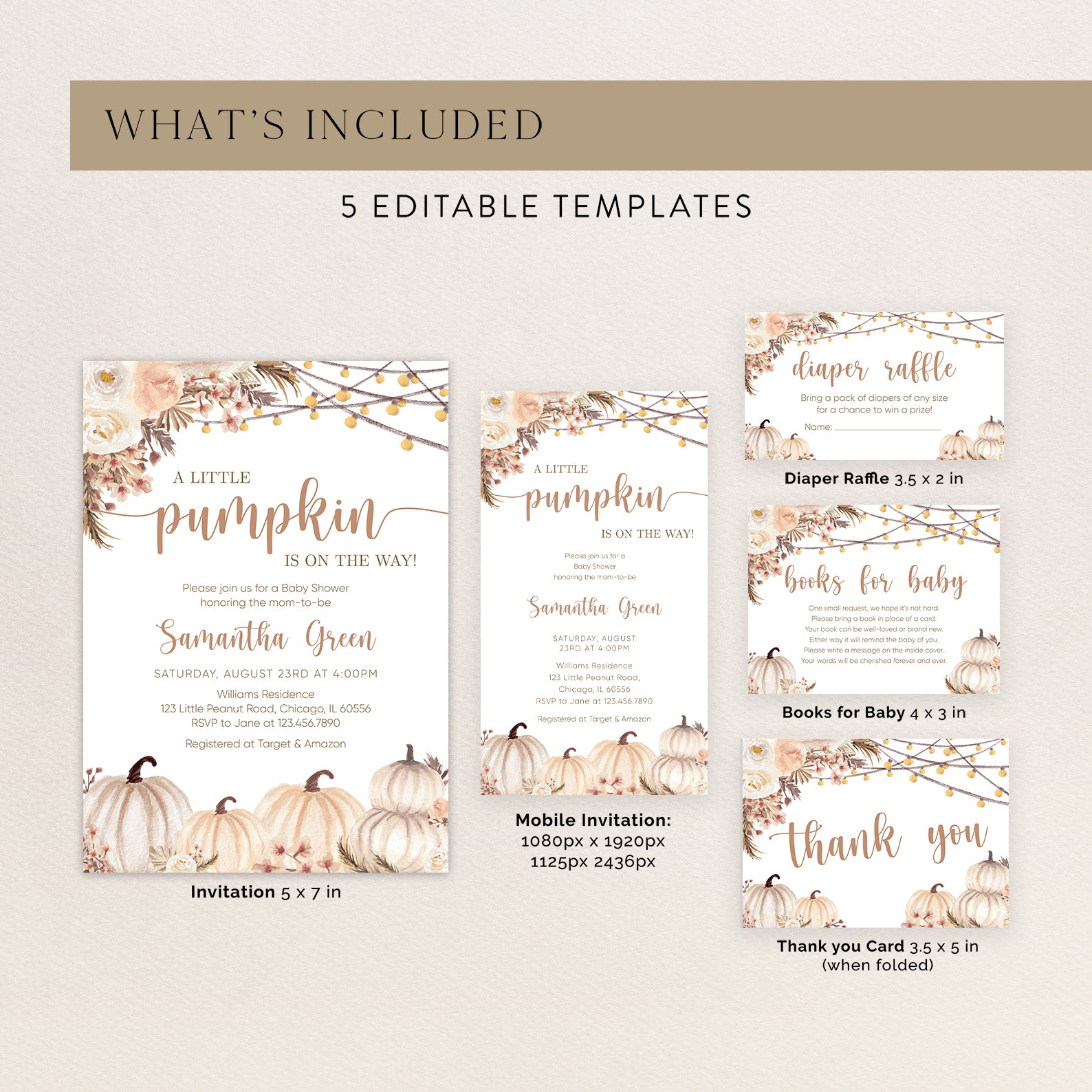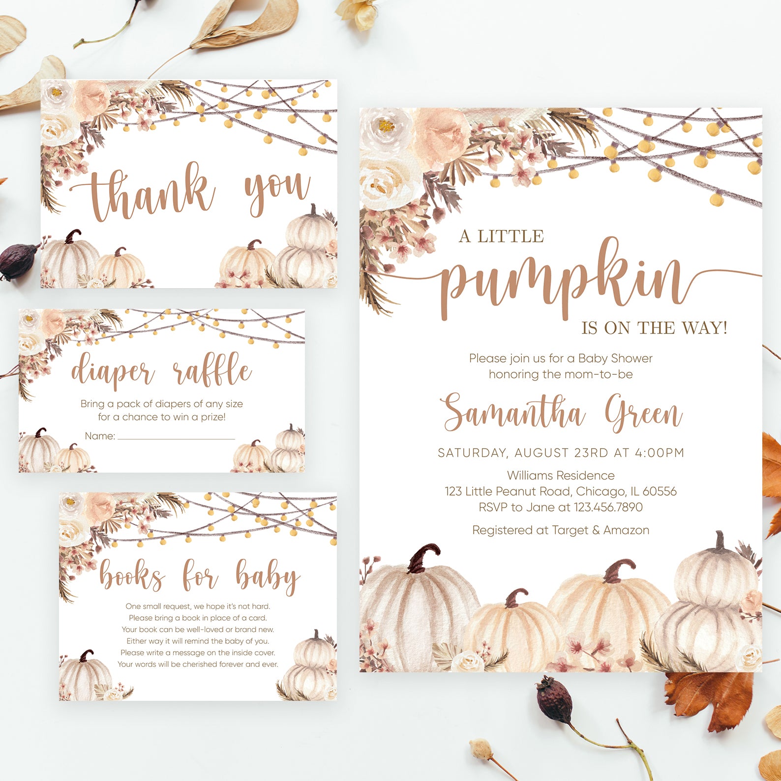 Announce your little pumpkin with our Fall Baby Shower Bundle. This set includes an invitation, mobile invite, diaper raffle, books for baby, and thank you card, all featuring boho roses, pampas grass, twinkling lights, and playful pumpkins. Perfect for a cozy and elegant autumn celebration.