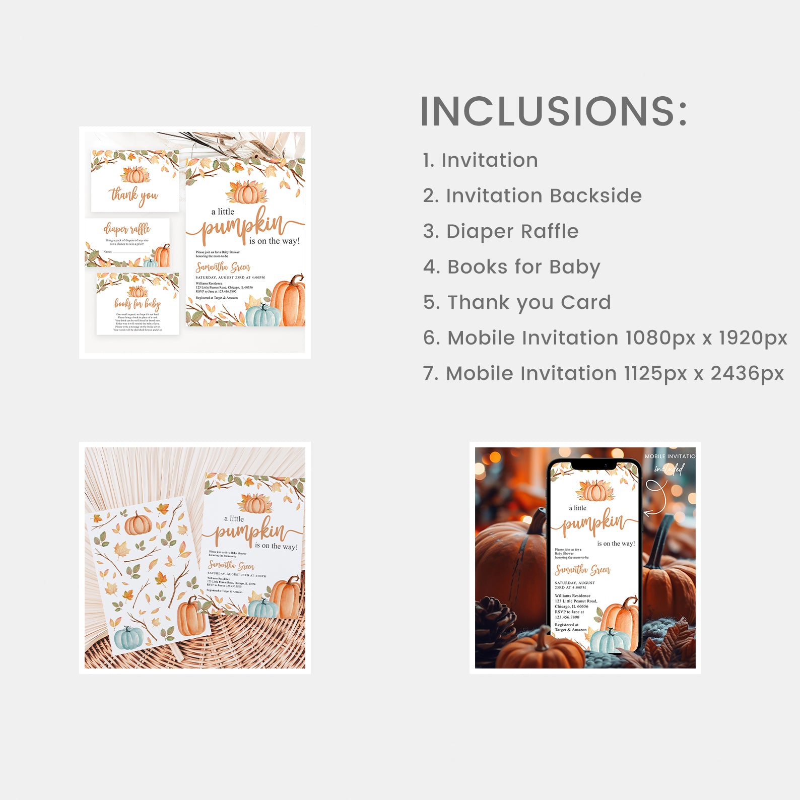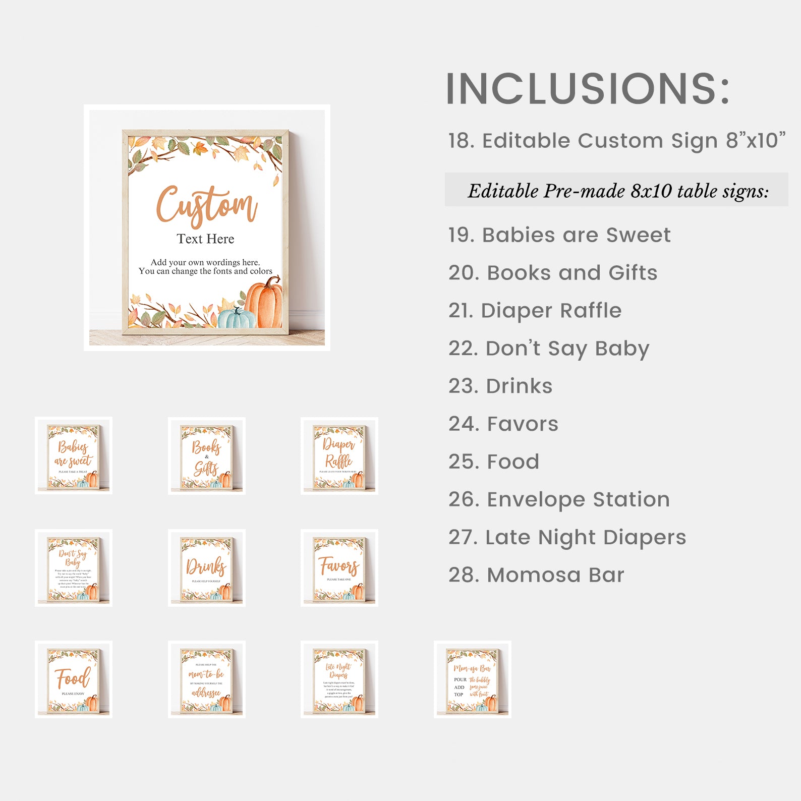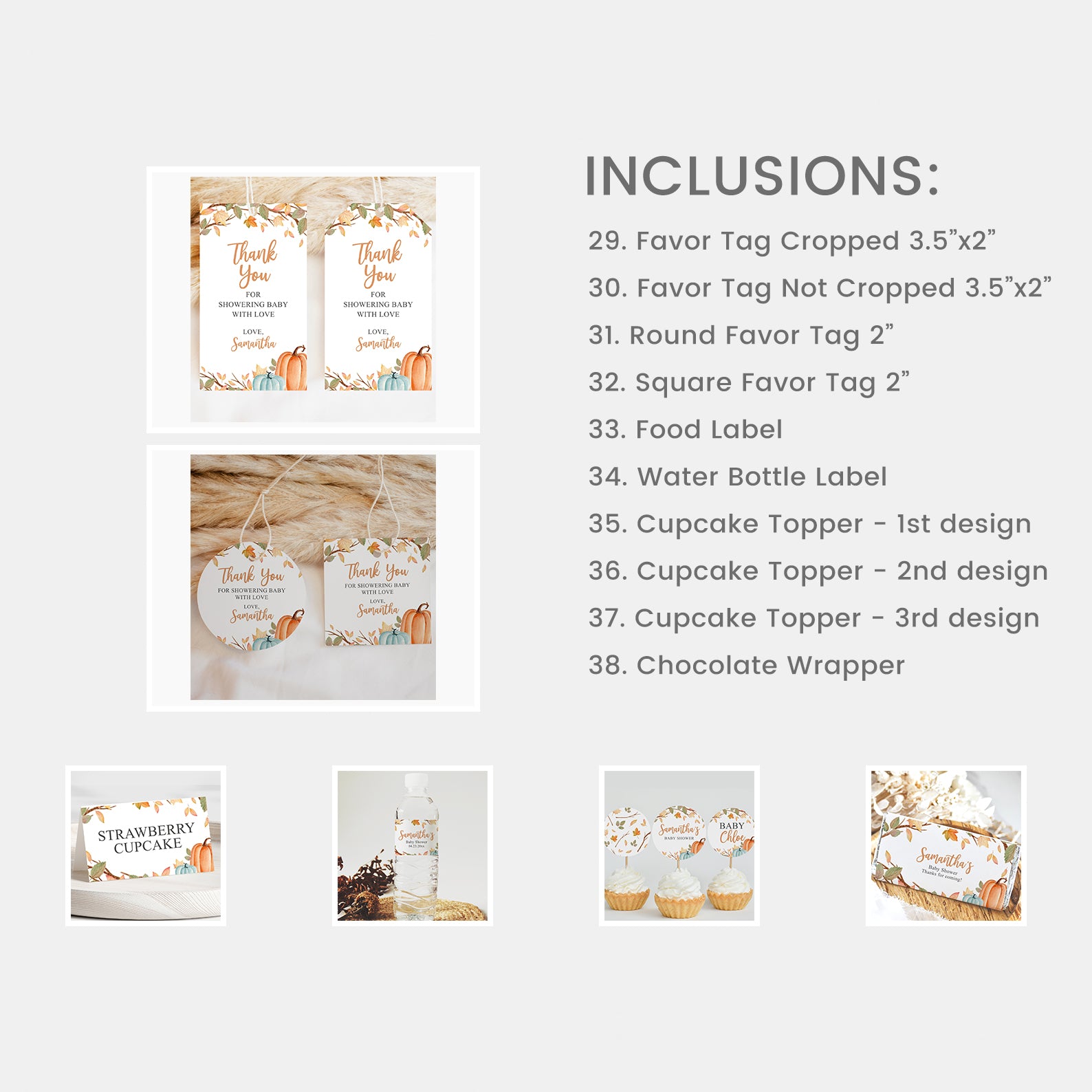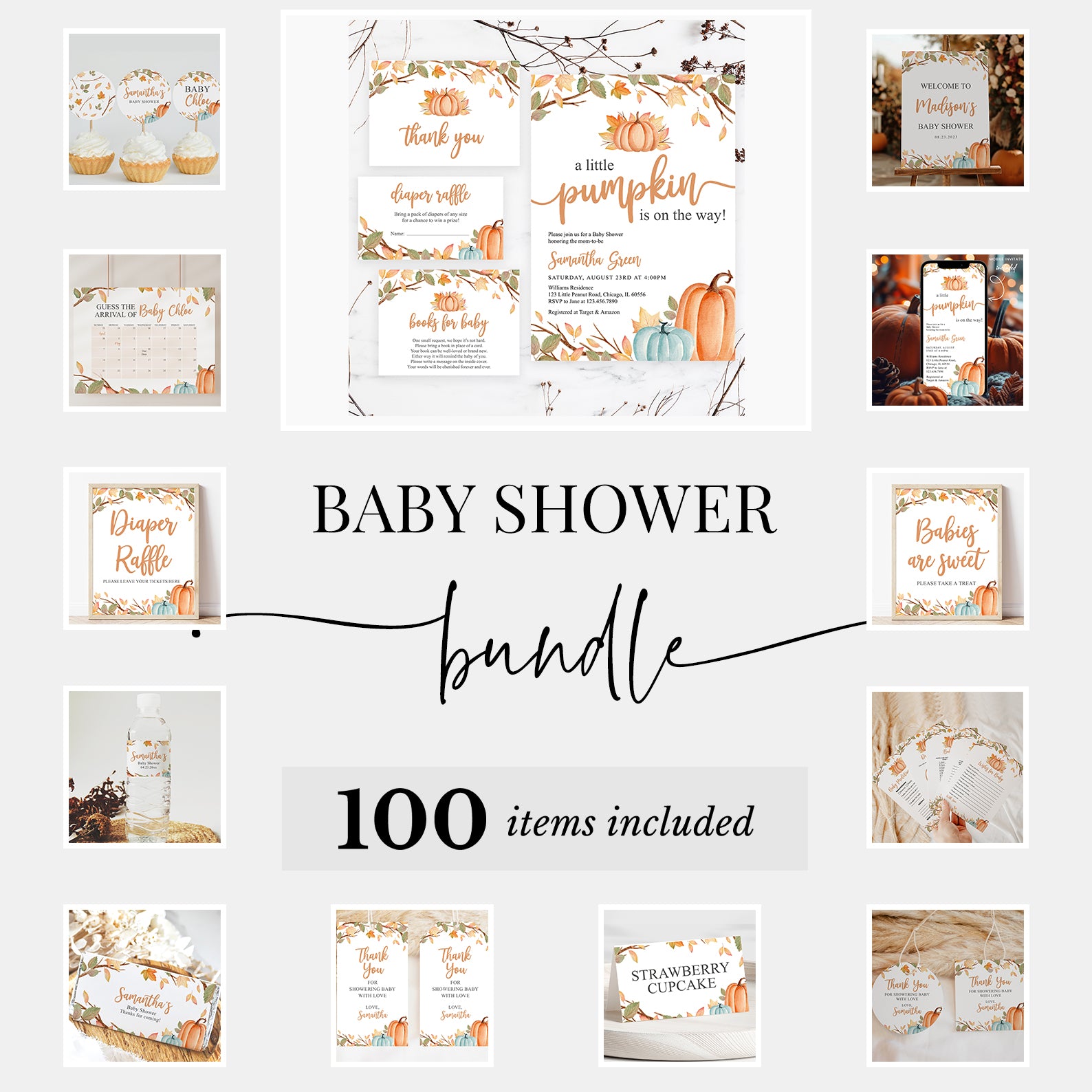 Make party planning effortless with this 100-piece fall baby shower mega bundle! Every item from invitations to cupcake toppers features charming pumpkins, draping autumn leaves, and rustic colors. Designed to match from start to finish, this editable bundle includes everything you need for a warm, cohesive celebration. Perfect for honoring your little pumpkin with style, ease, and festive fall flair.