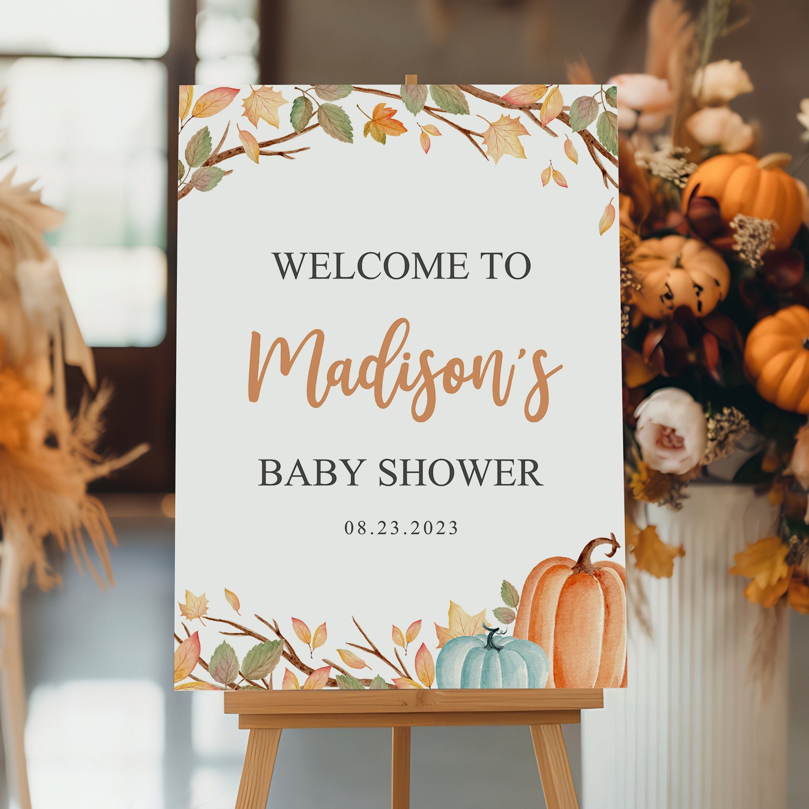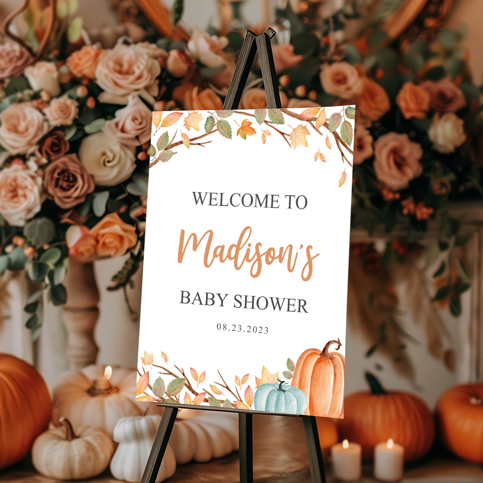 Welcome guests with our Fall Baby Shower Sign, featuring vibrant autumn leaves and playful pumpkins. Ideal for adding a warm and festive touch to your celebration.