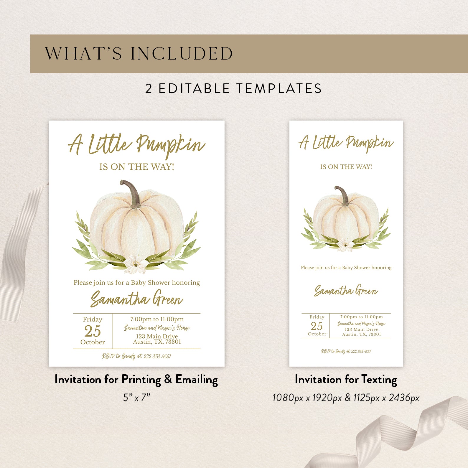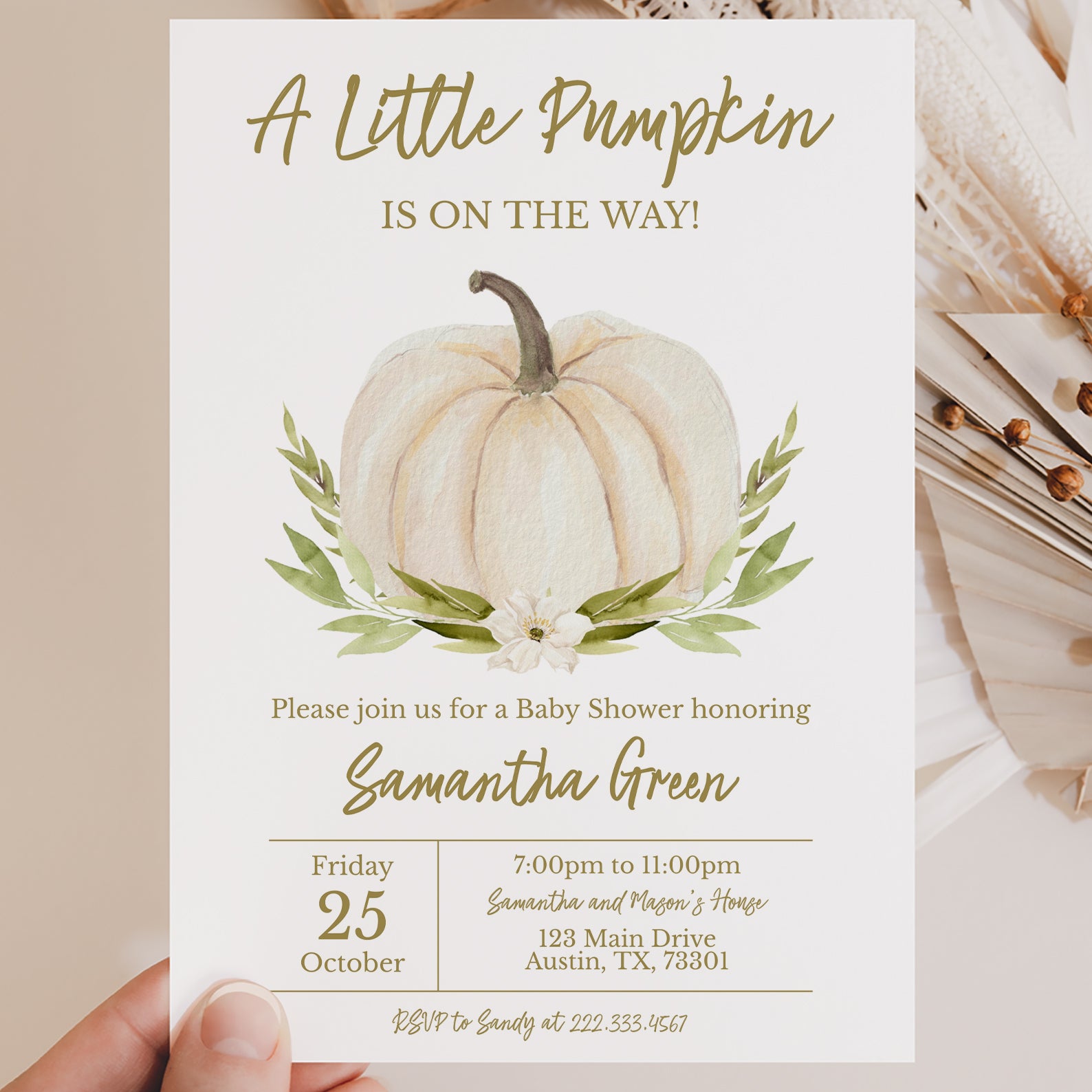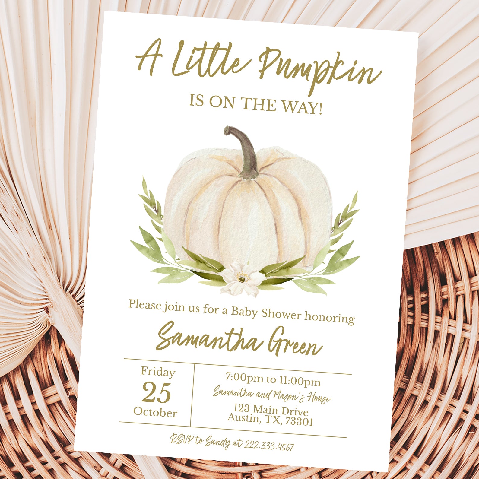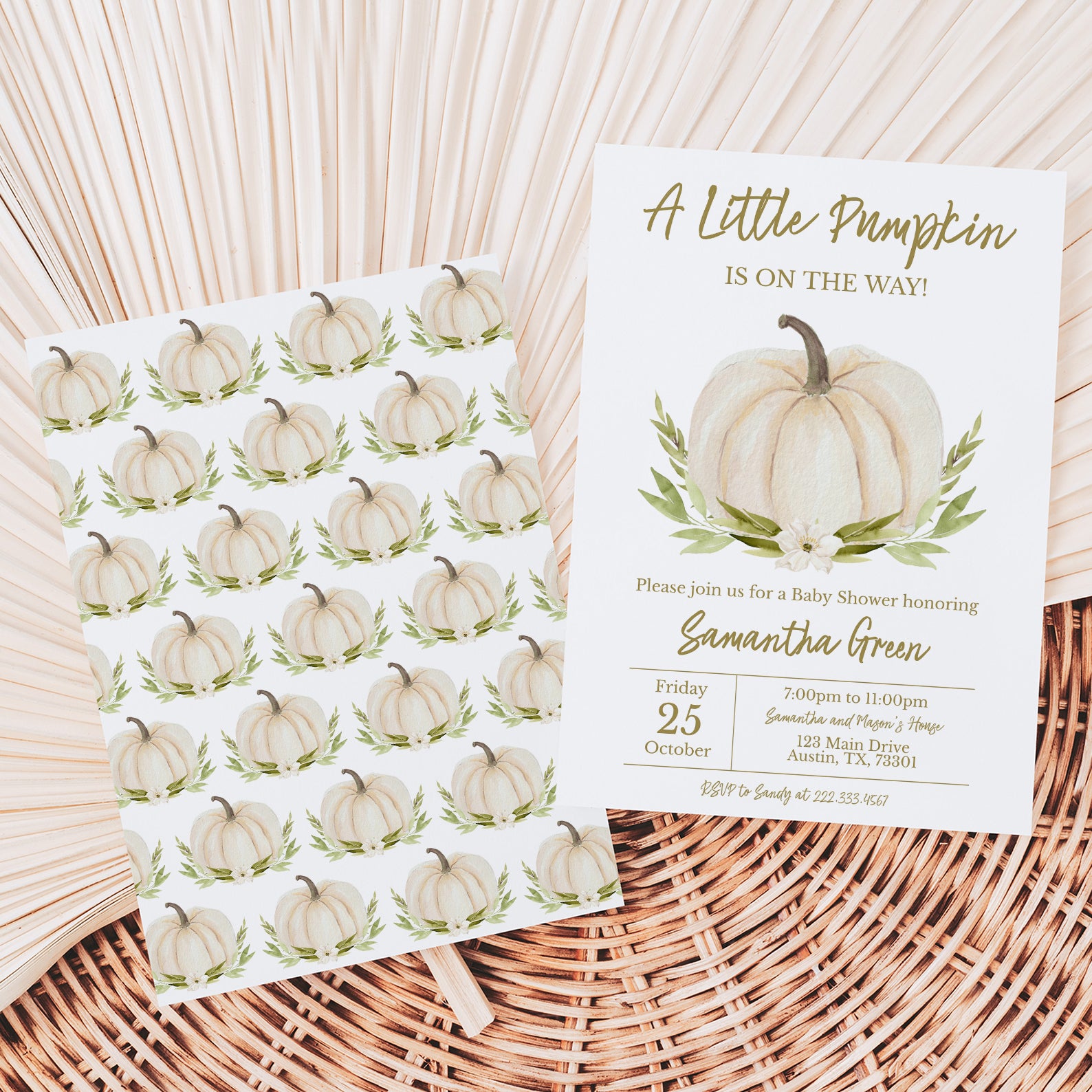 - Purchase this Little Pumpkin on the Way Baby Shower Invite: White Pumpkin template