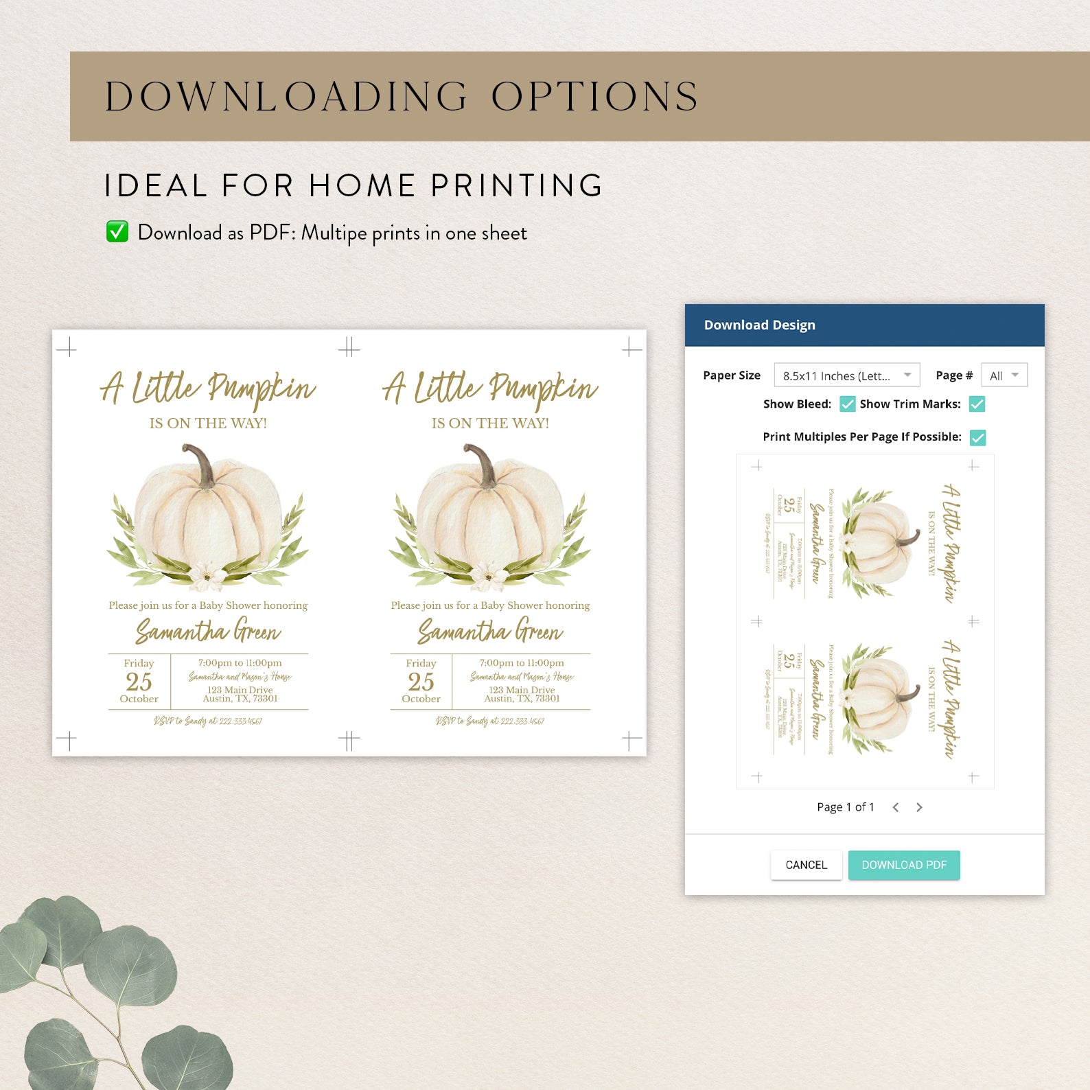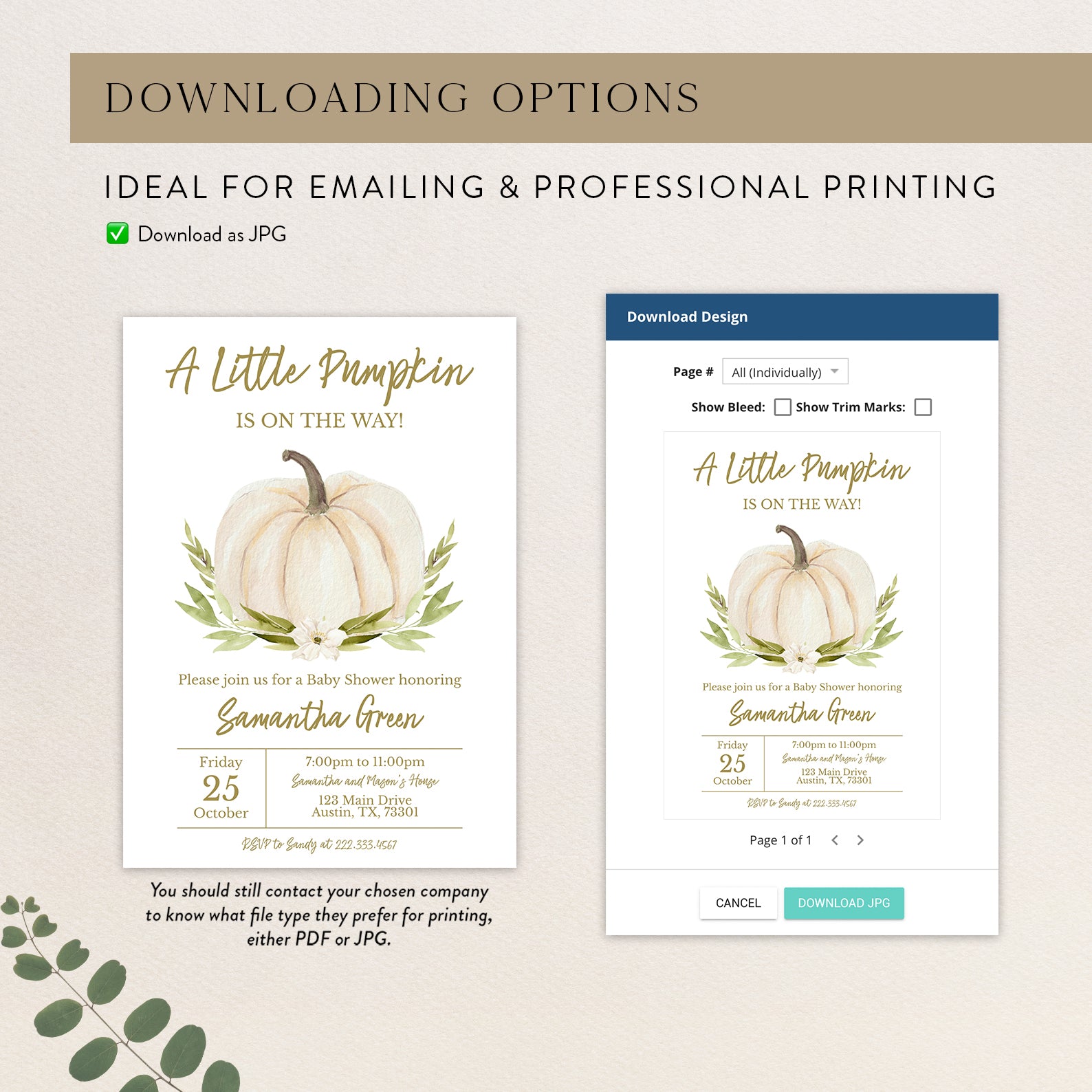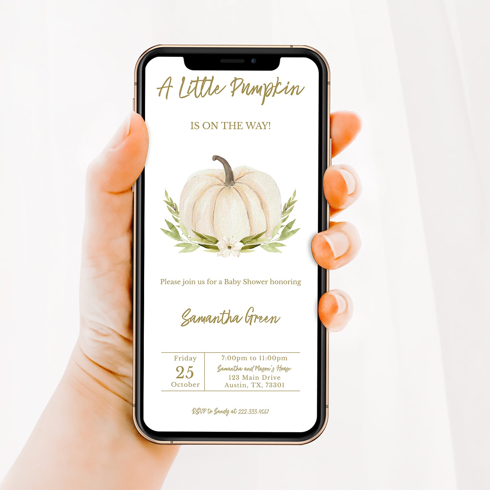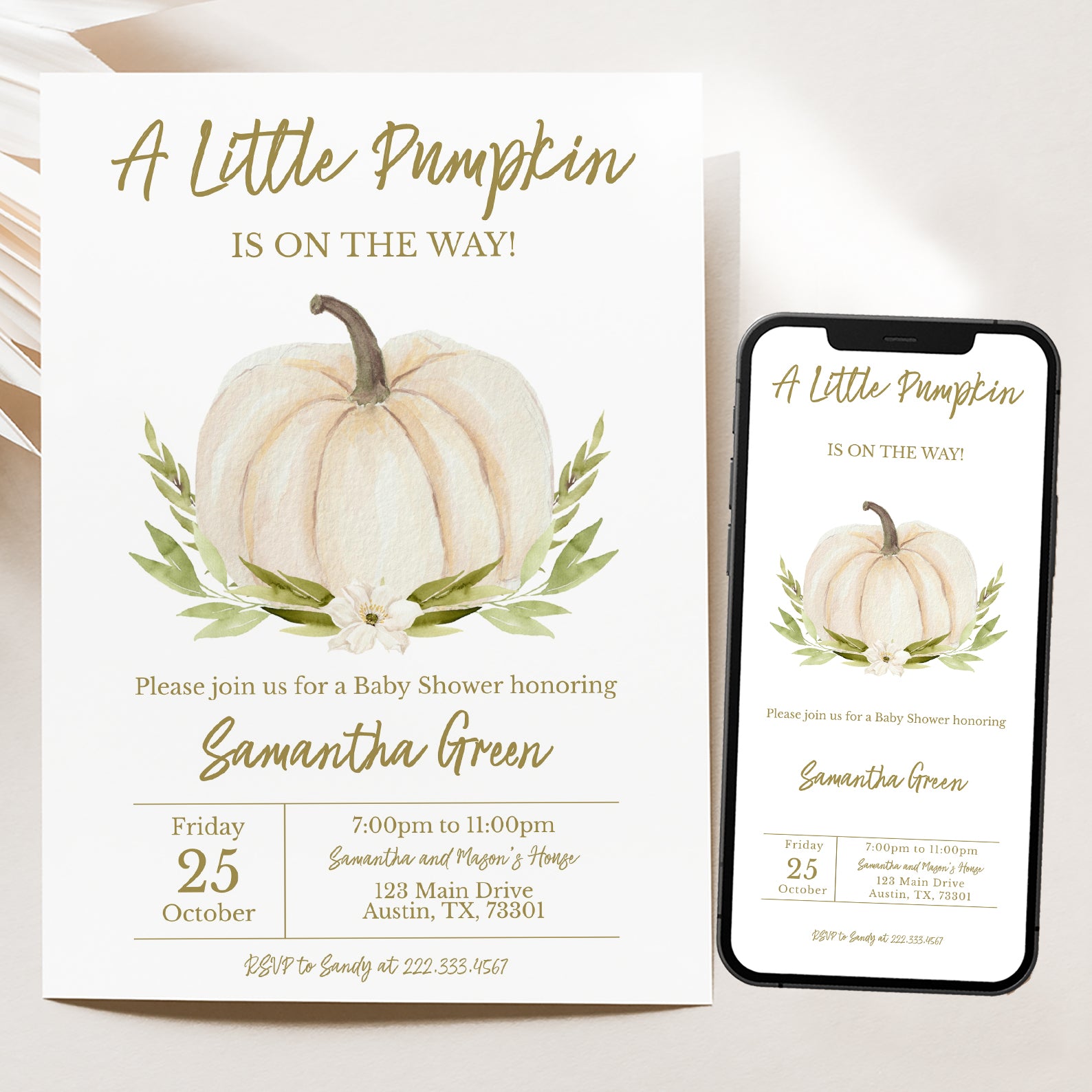 - Purchase this Little Pumpkin on the Way Baby Shower Invite: White Pumpkin template