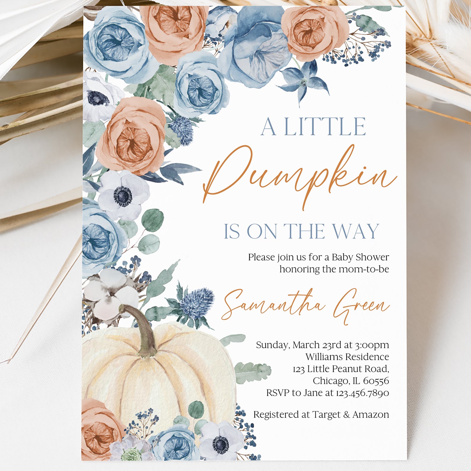 1. Purchase this Little Pumpkin on the Way Fall Invite with Blue & Orange Roses template