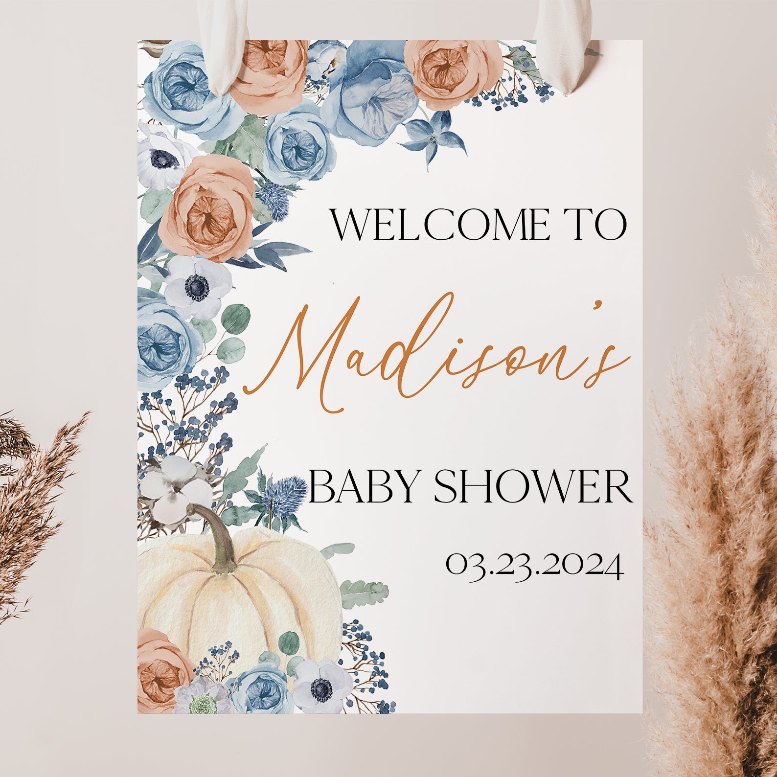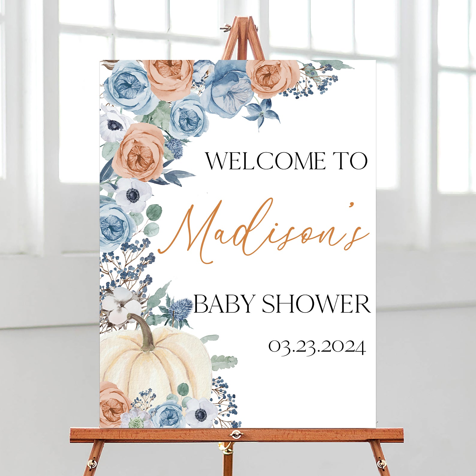 Welcome your little pumpkin with our charming fall baby shower welcome sign! Featuring a delightful design of blue and orange roses surrounding a cute pumpkin at the bottom, this sign captures the warmth and beauty of autumn. It's the perfect touch to greet your guests and set the tone for a cozy and memorable celebration.