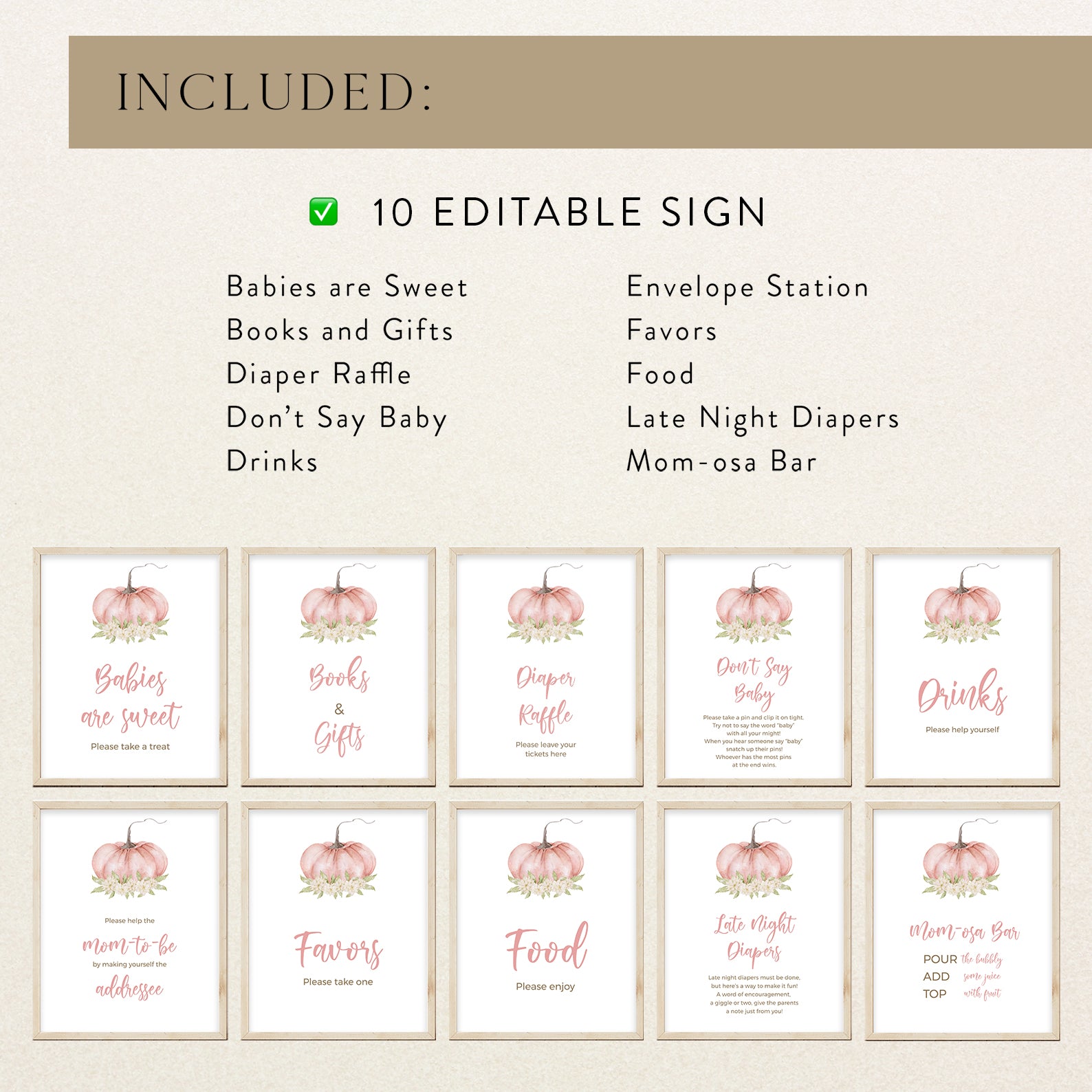 Add a sweet touch to your fall baby shower with this set of 10 editable table signs, each designed with soft pumpkins in blue or pink, leafy accents, and a dainty white bloom. With labels like “Babies Are Sweet” and “Mom-osa Bar,” these signs bring charm and coordination to your setup while tying in beautifully with your pumpkin-themed celebration.