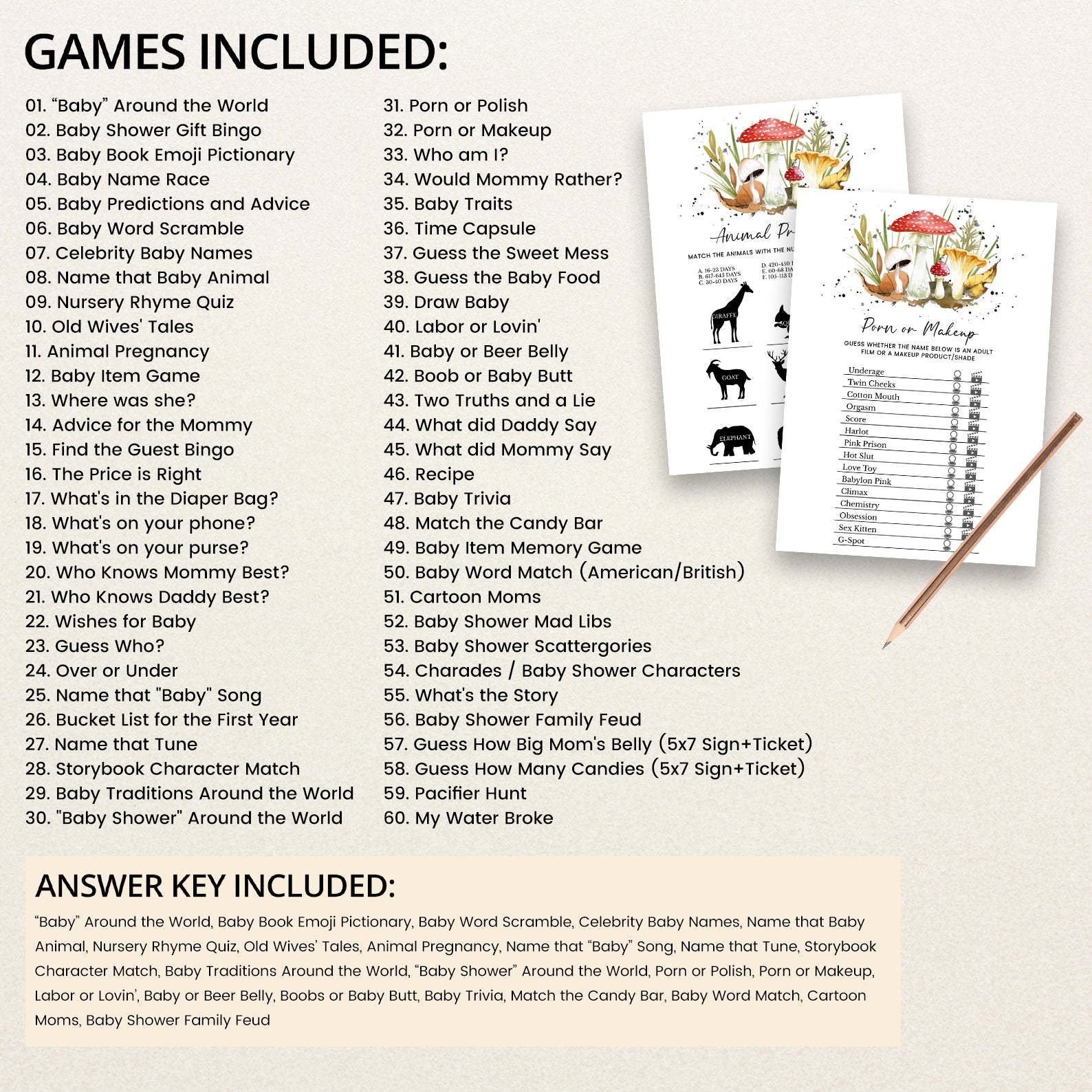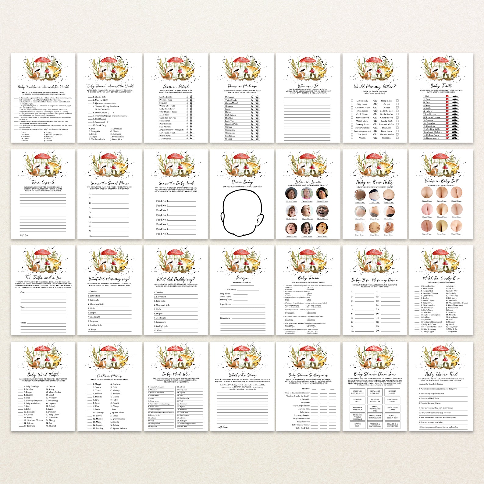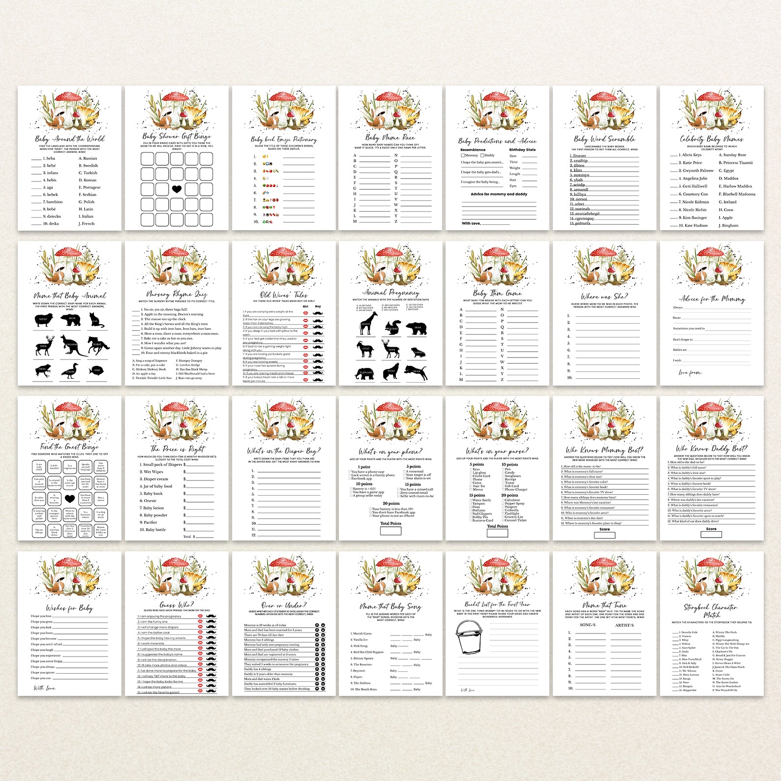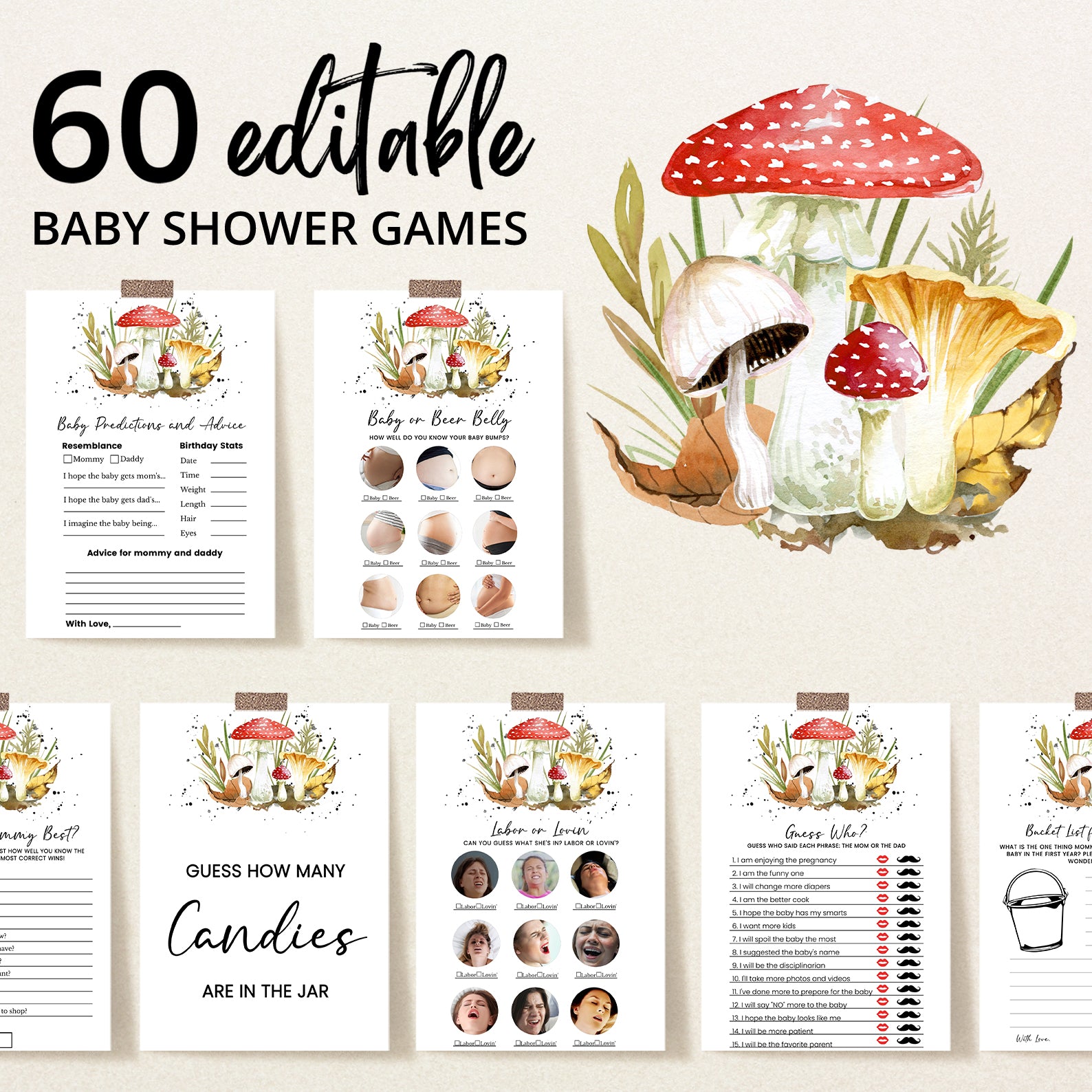 Make your baby shower extra fun with our 60-piece editable game bundle, designed to match your cozy fall theme. Each game features soft autumn colors and charming mushroom illustrations, creating a playful yet elegant woodland vibe. With classics like Baby Bingo and Word Scramble to unique guessing games, this bundle keeps guests entertained while tying beautifully into your seasonal decor. Perfect for creating laughter and memories at your special gathering!