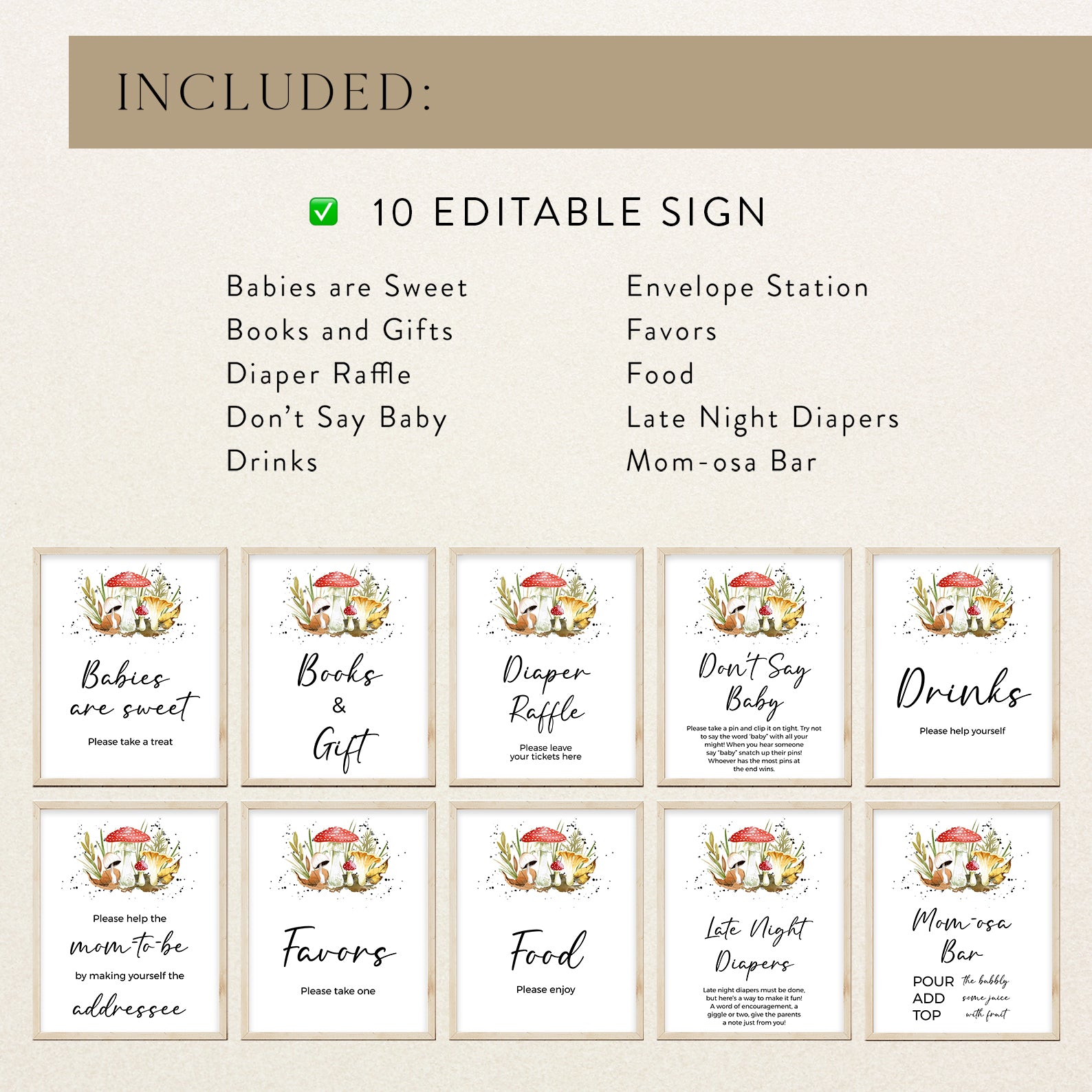Add a whimsical woodland touch to your baby shower with this set of ten editable table signs. Each sign features a minimalist fall design with dainty mushrooms, scattered autumn leaves, and soft earthy tones that bring cozy seasonal charm to your setup. From “Babies Are Sweet” to “Mom-osa Bar,” these beautifully coordinated signs guide guests while elevating your party decor with a cohesive, nature-inspired look that perfectly complements a rustic fall celebration.