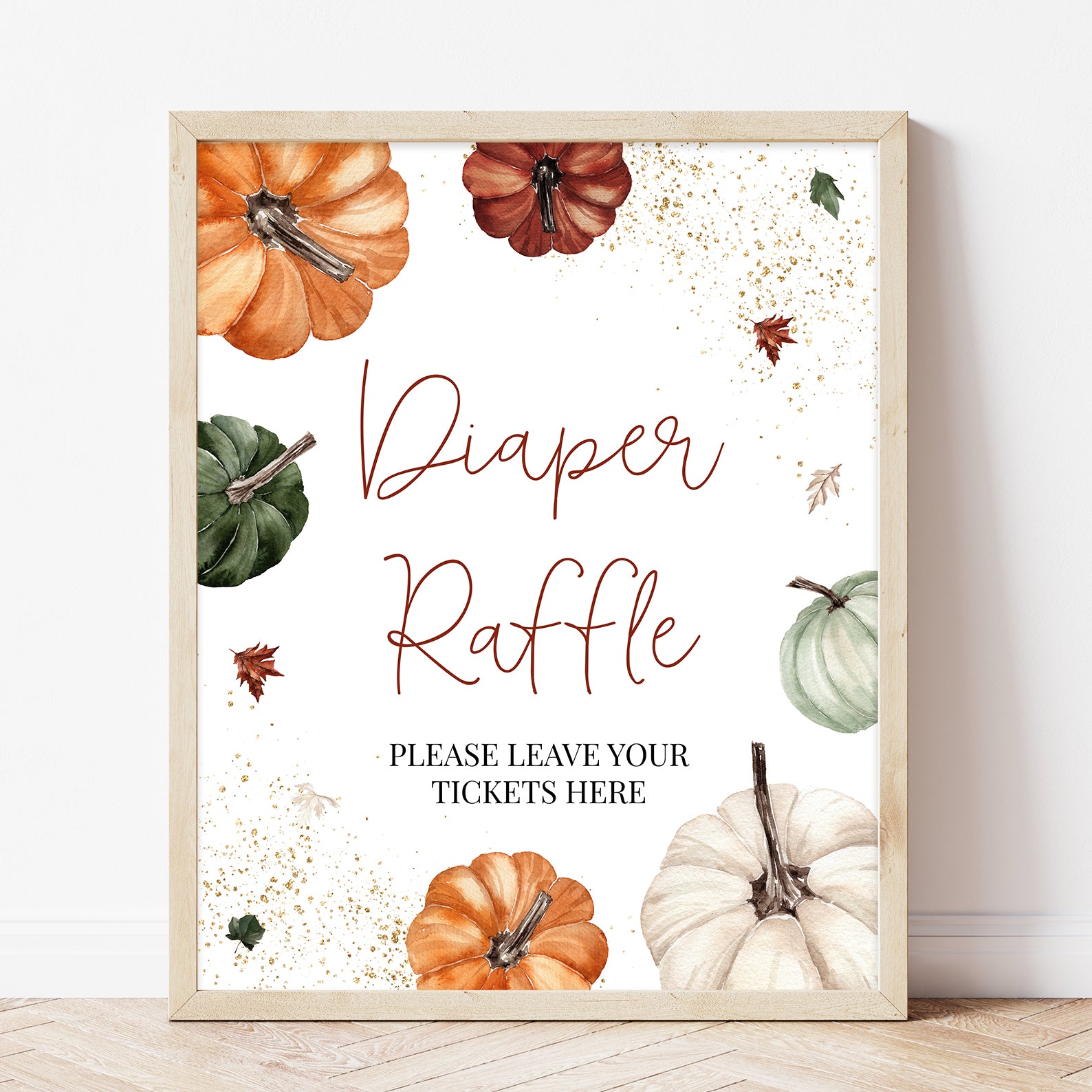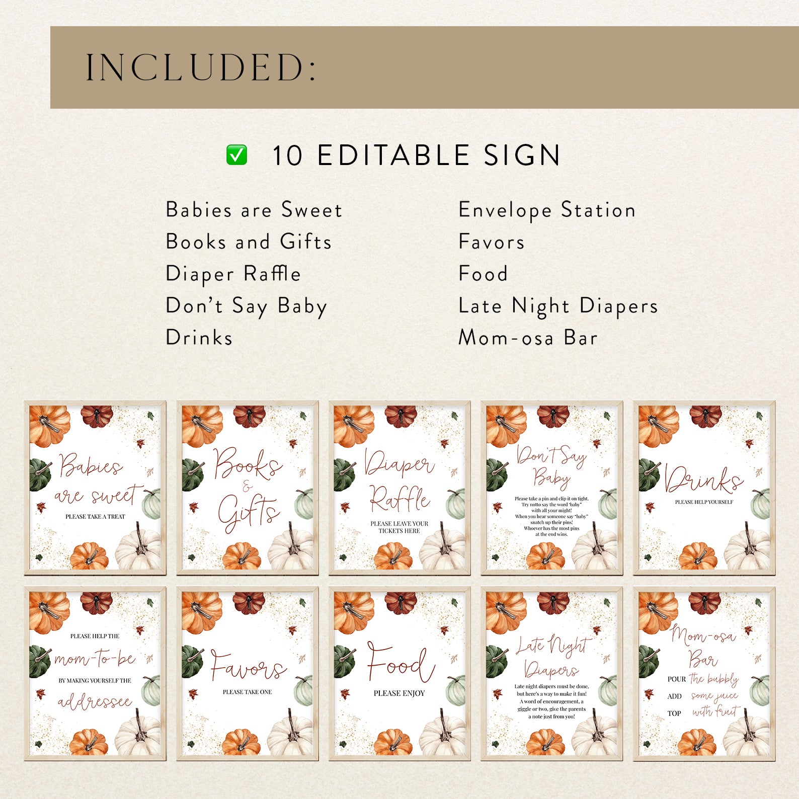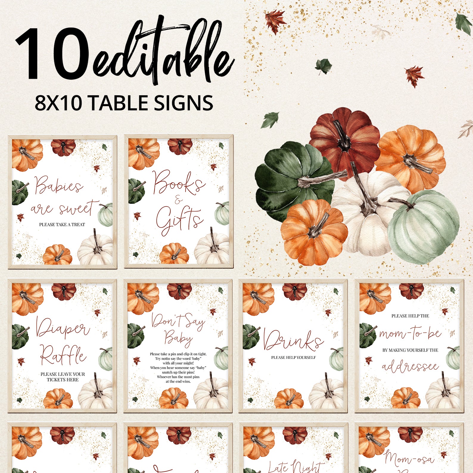 Add a festive touch to your baby shower setup with this set of 10 editable table signs, each featuring a warm fall palette and soft watercolor pumpkins. The design includes subtle gold accents, scattered autumn leaves, and clean modern fonts for a polished, seasonal look. Whether directing guests to the Mom-osa Bar or the Diaper Raffle, these signs bring cohesive charm and elegance to every corner of your celebration.