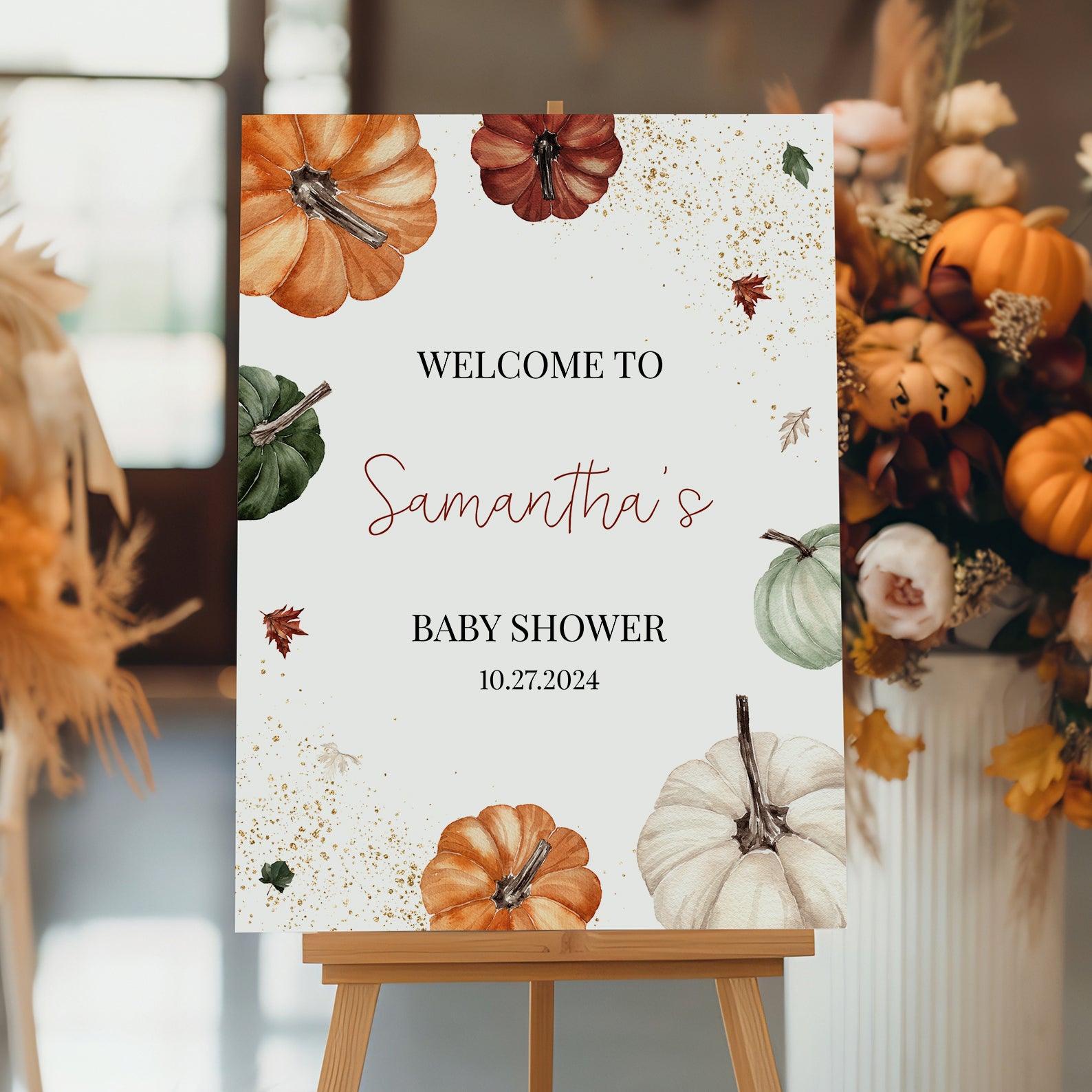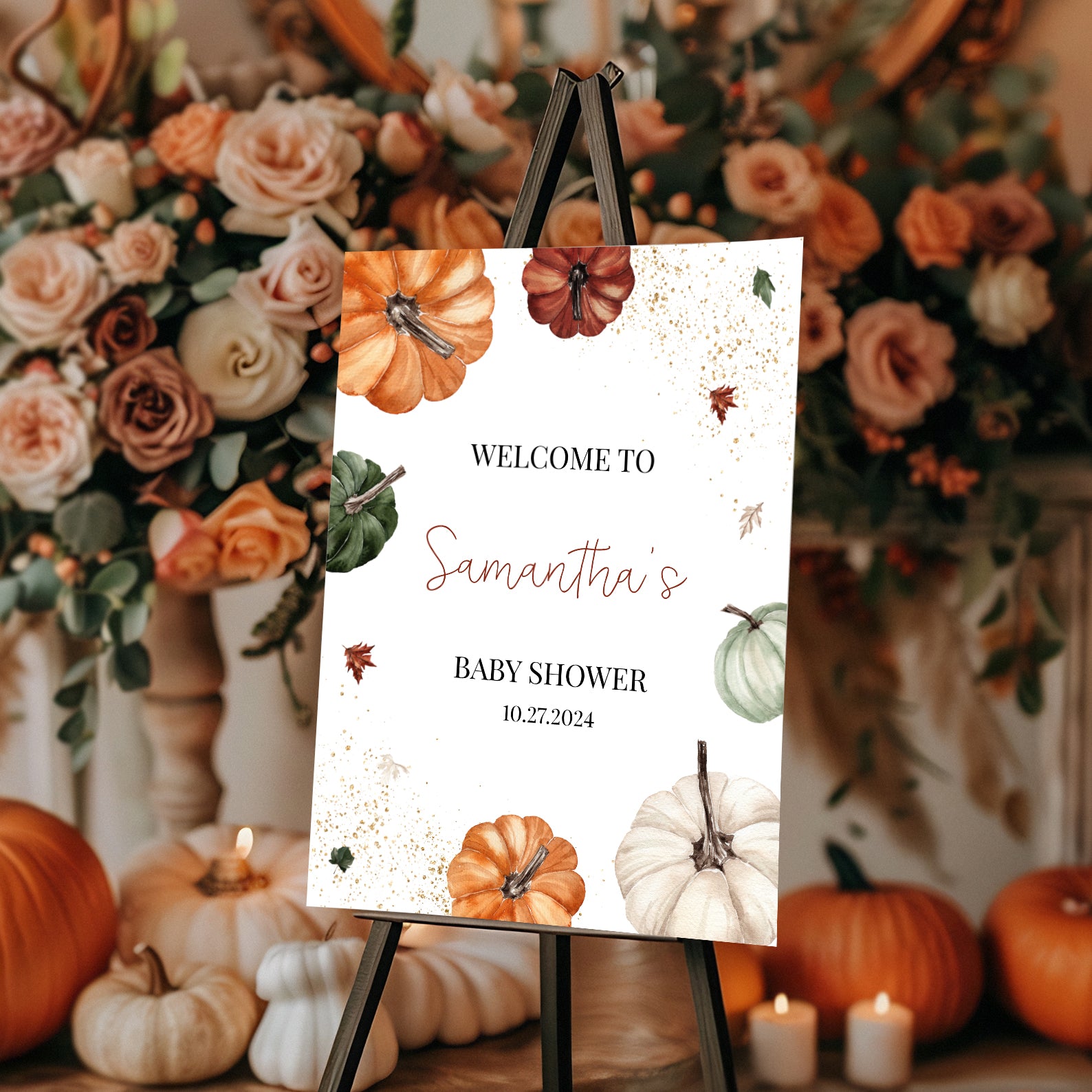 - Purchase this Minimalist Fall Pumpkin Baby Shower Digital Welcome Sign template