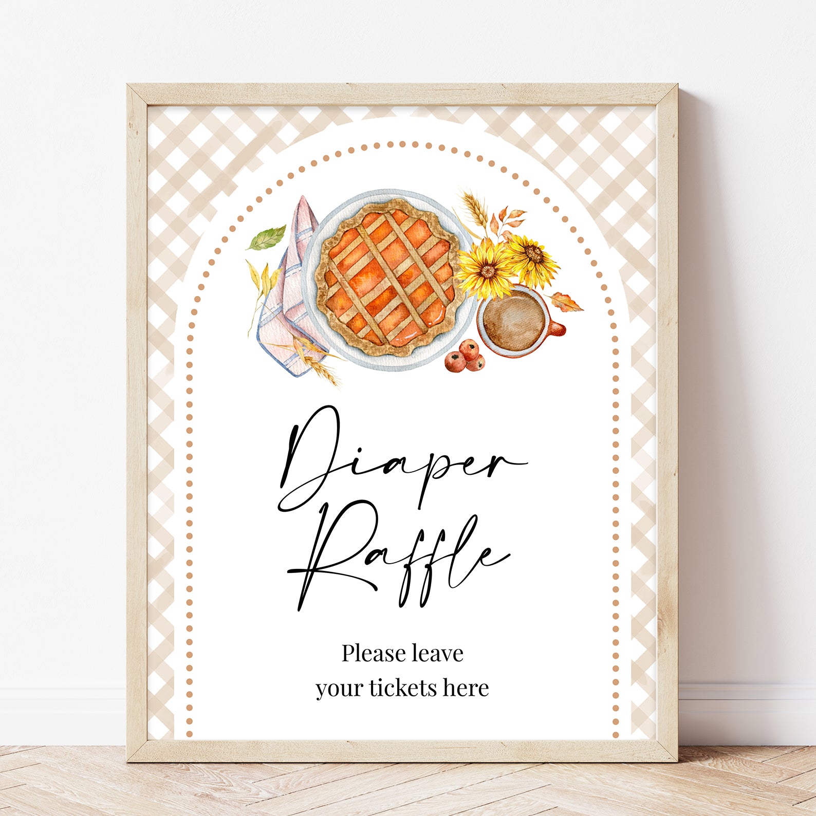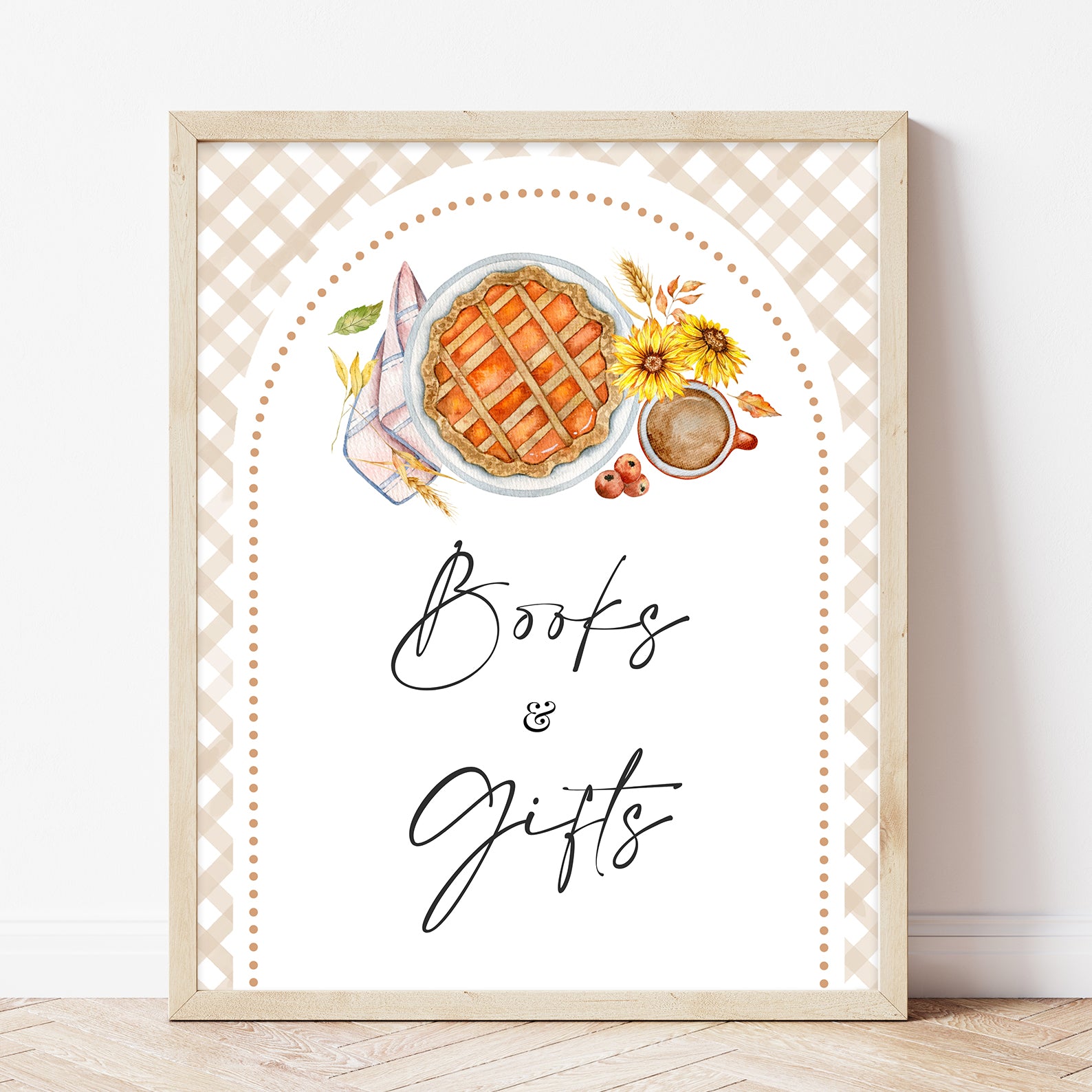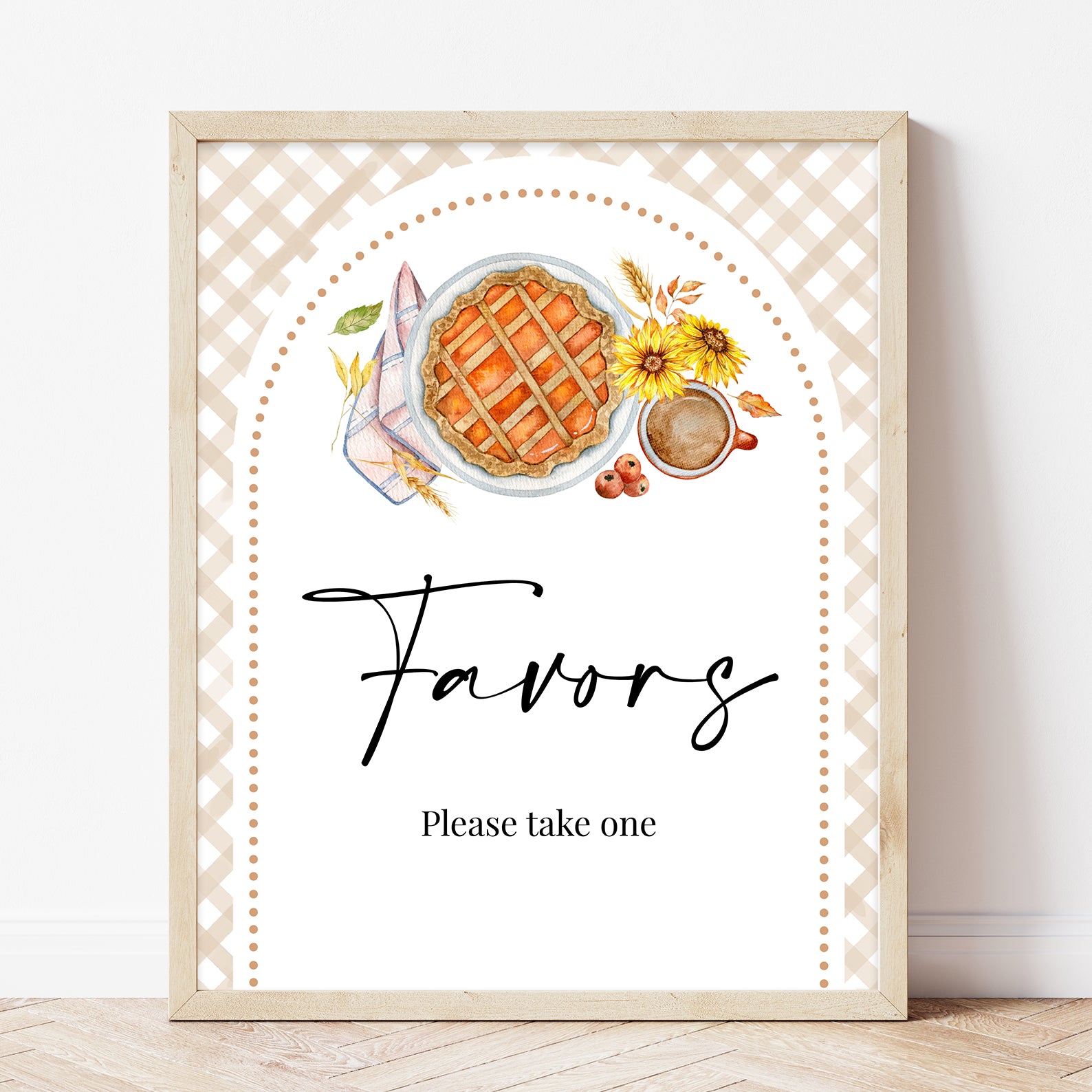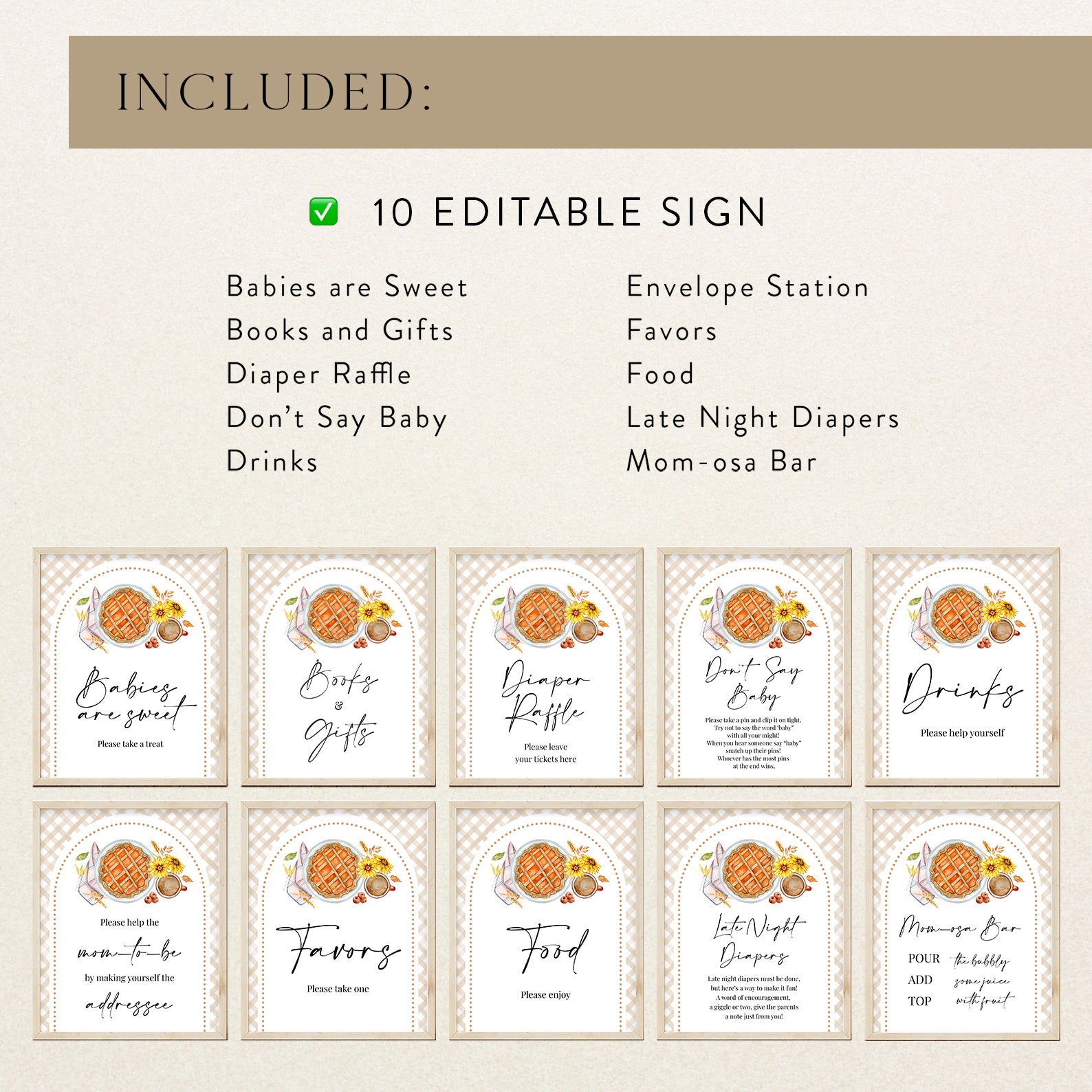 Add cozy charm to your fall baby shower with this set of 10 editable table signs, designed to match a warm “cutie pie” autumn theme. Each sign features a soft white arch layered over a brown plaid background, with sweet illustrations of pumpkin pie, steaming coffee, and delicate florals. This inviting design brings rustic elegance to your setup and includes: Babies Are Sweet, Books and Gifts, Diaper Raffle, Don’t Say Baby, Drinks, Envelope Station, Favors, Food, Late Night Diapers, and Mom-osa Bar.