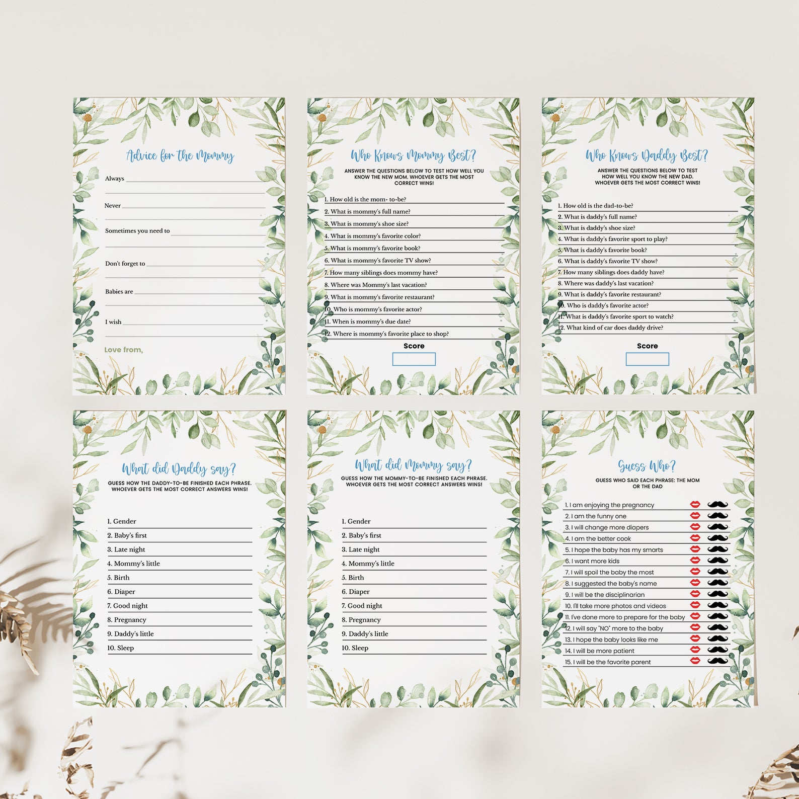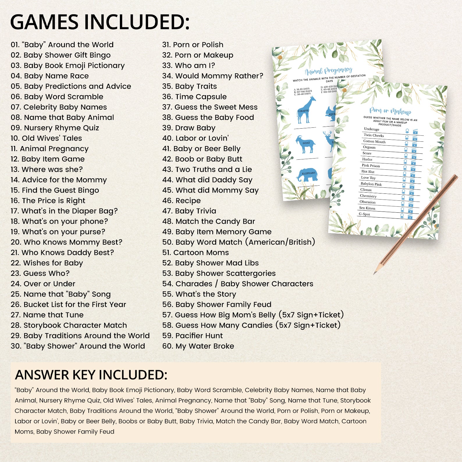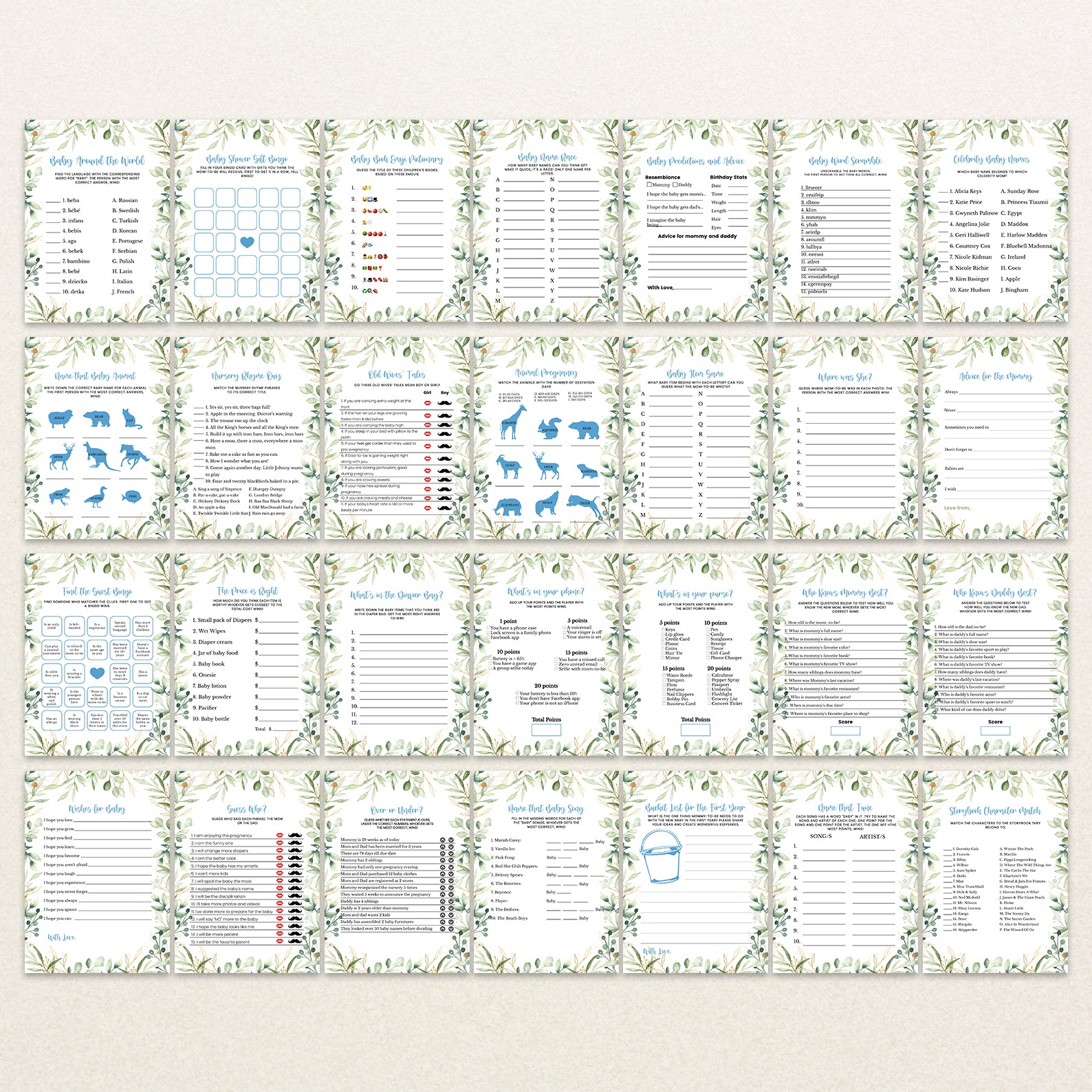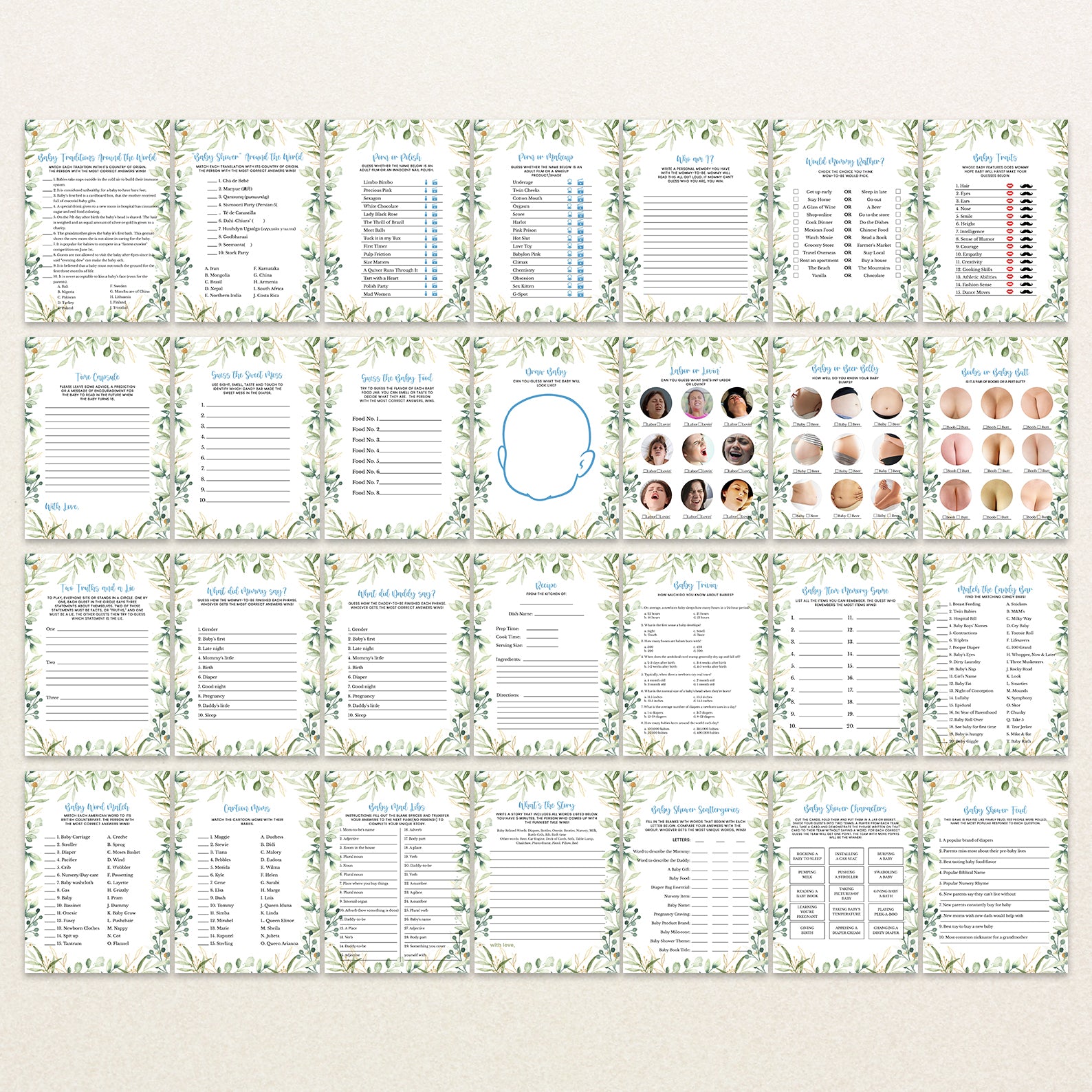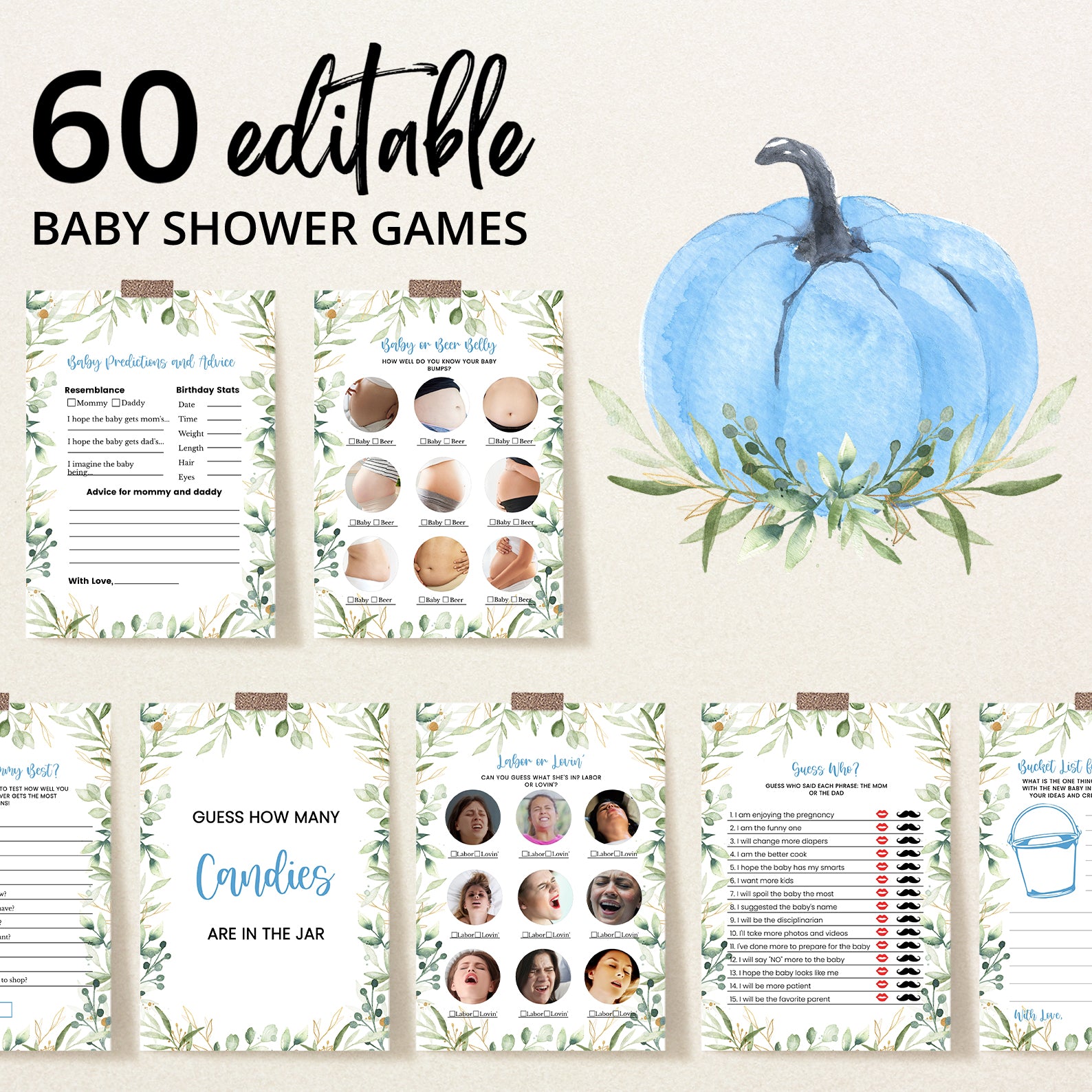 Keep guests entertained with our beautifully designed fall game bundle, featuring 60 editable baby shower games. Each game is framed with graceful green leaves and highlighted by a charming blue pumpkin motif, creating a playful yet polished feel. From “Who Knows Mommy Best” to “Baby Word Scramble,” this set adds joy and interaction to your autumn celebration while tying into your seasonal theme.