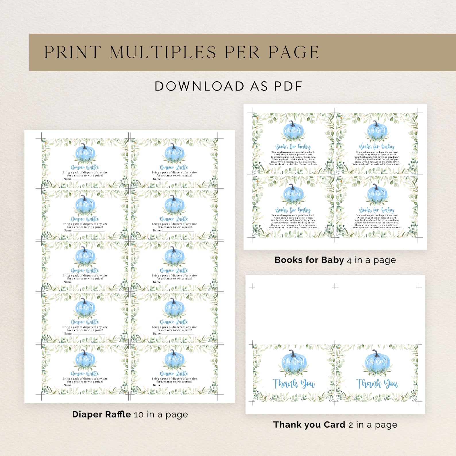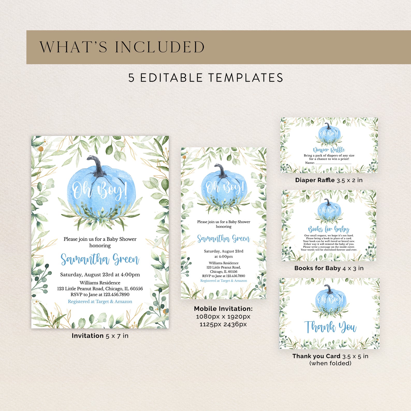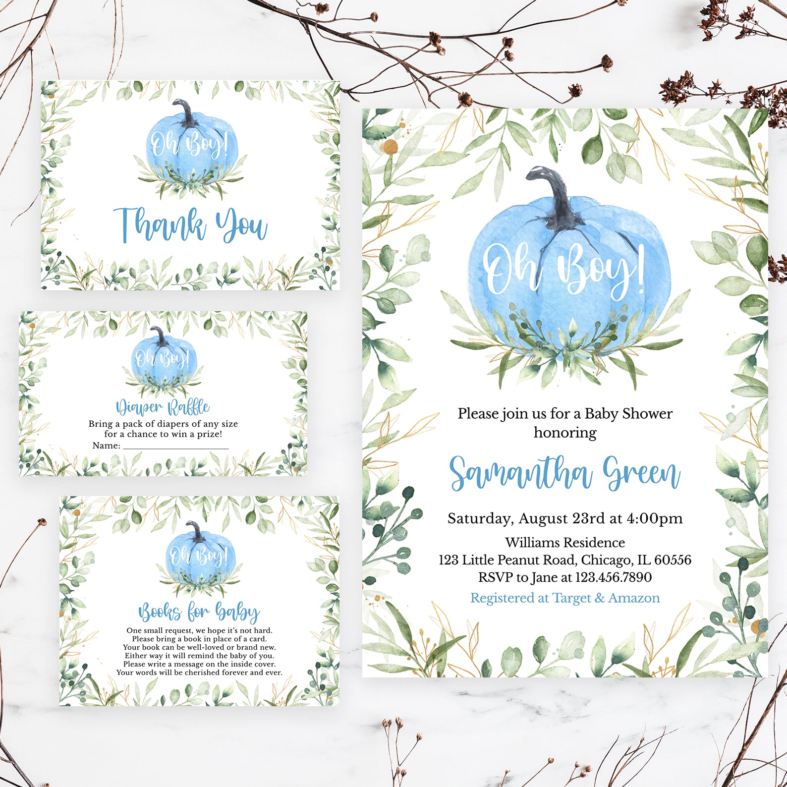 Get ready for your little one with our "Oh Boy" Fall Baby Shower Invitation Bundle. This set includes a digital invitation, mobile invite, diaper raffle, books for baby, and thank you card. Featuring a charming blue pumpkin with green leaves and a sophisticated green watercolor leaves border, it adds an elegant autumn touch to your celebration. Perfect for inviting loved ones to share in the joy of your upcoming arrival.