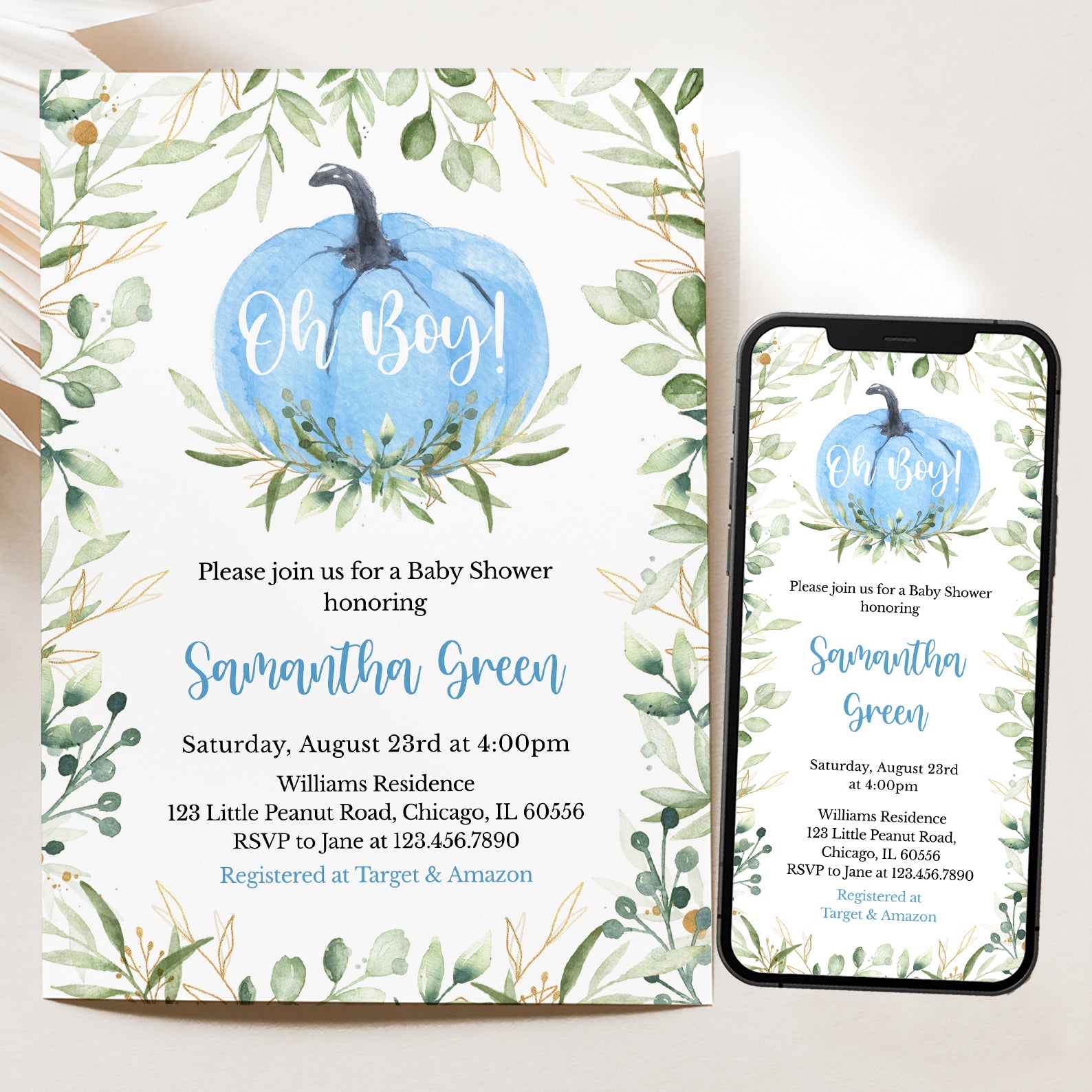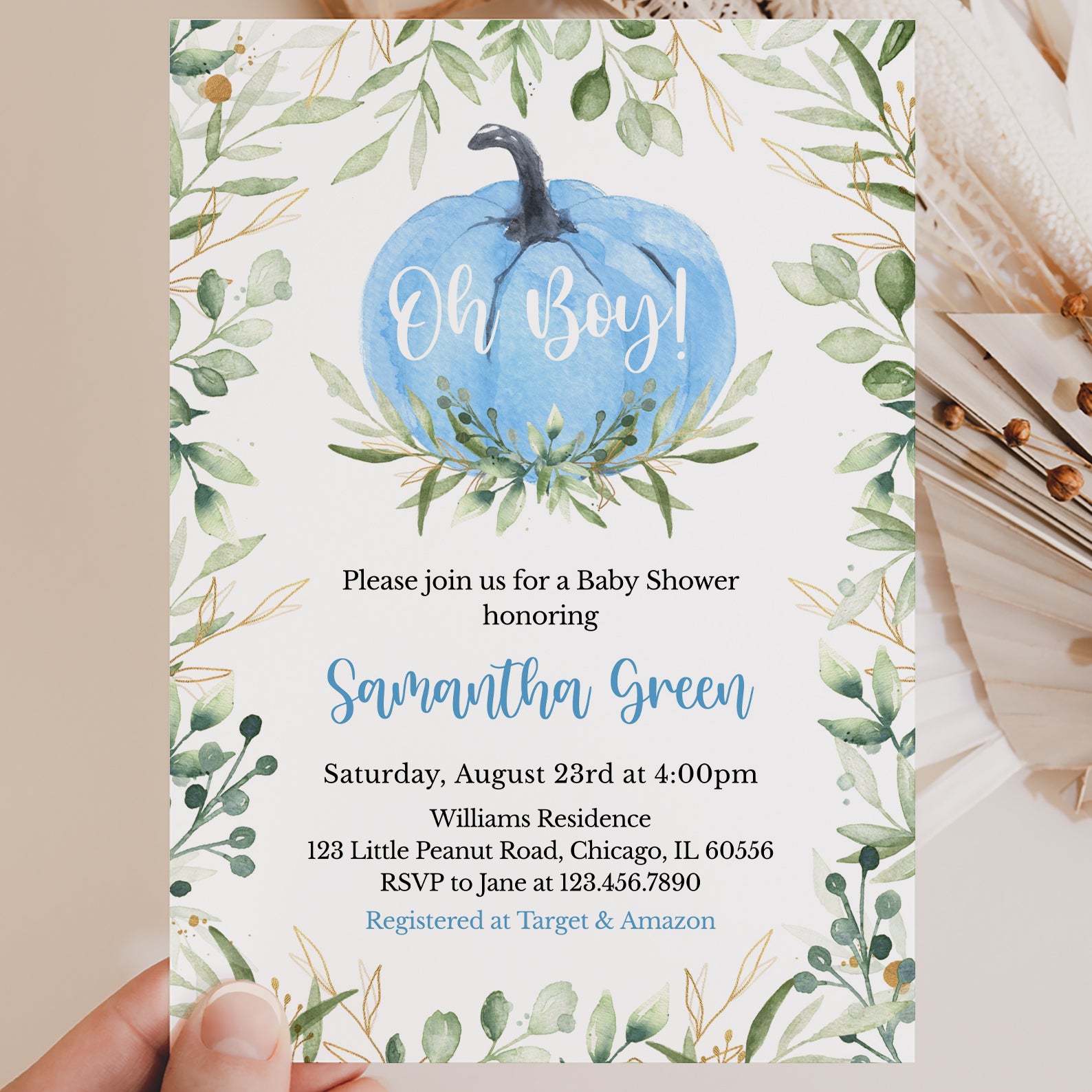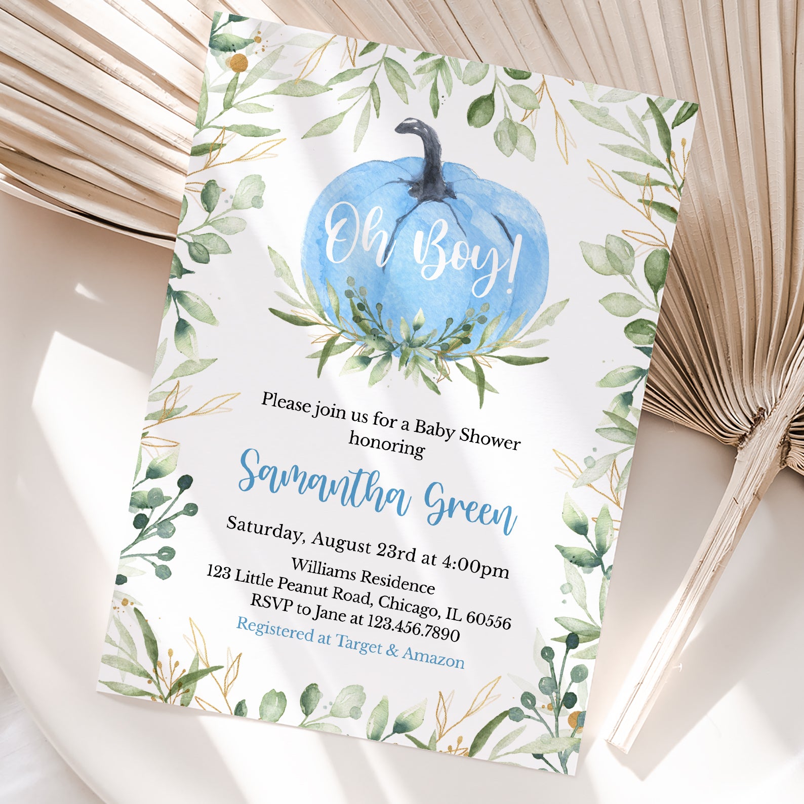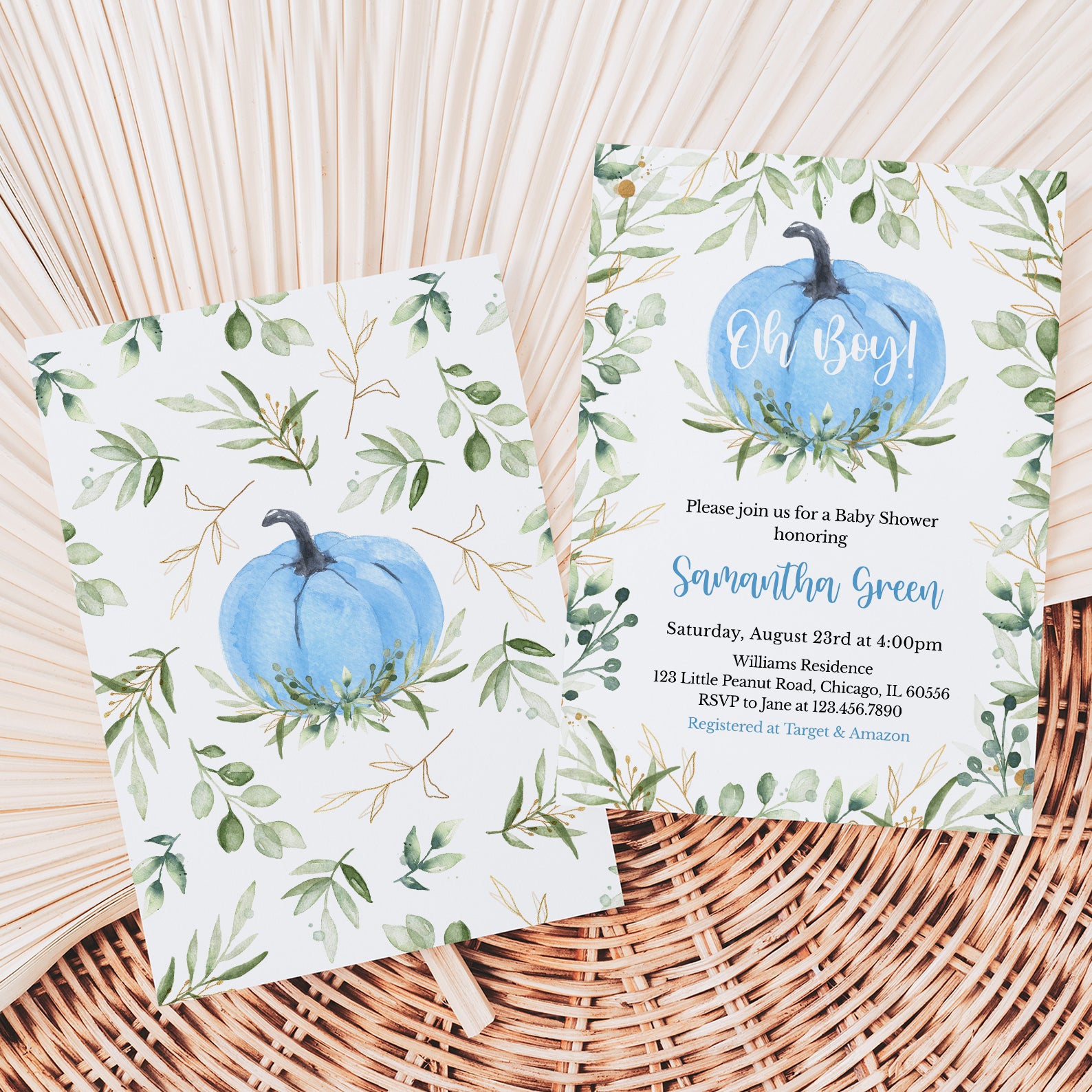 - Purchase this Oh Boy Baby Shower Invitation with Blue Pumpkin & Green Border template