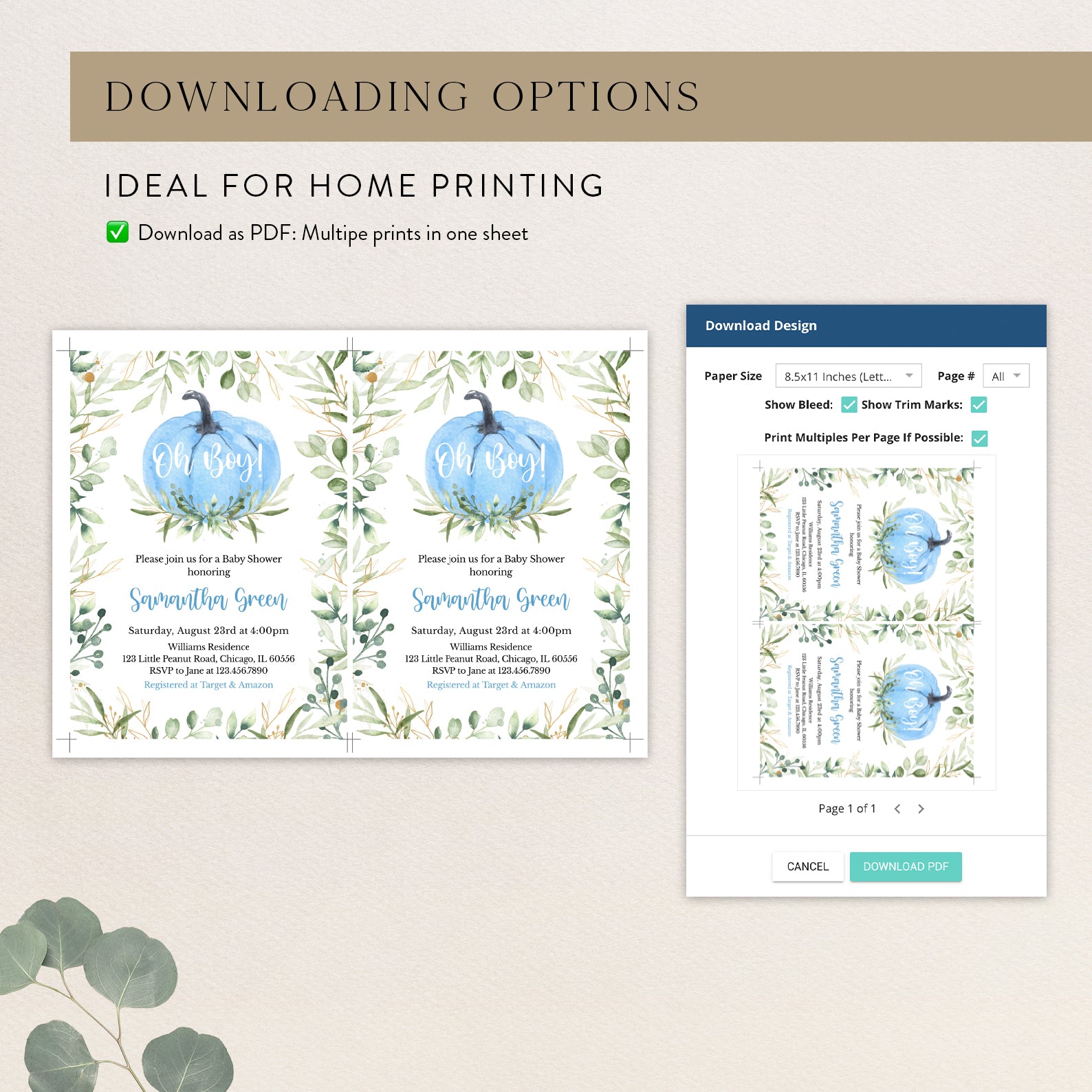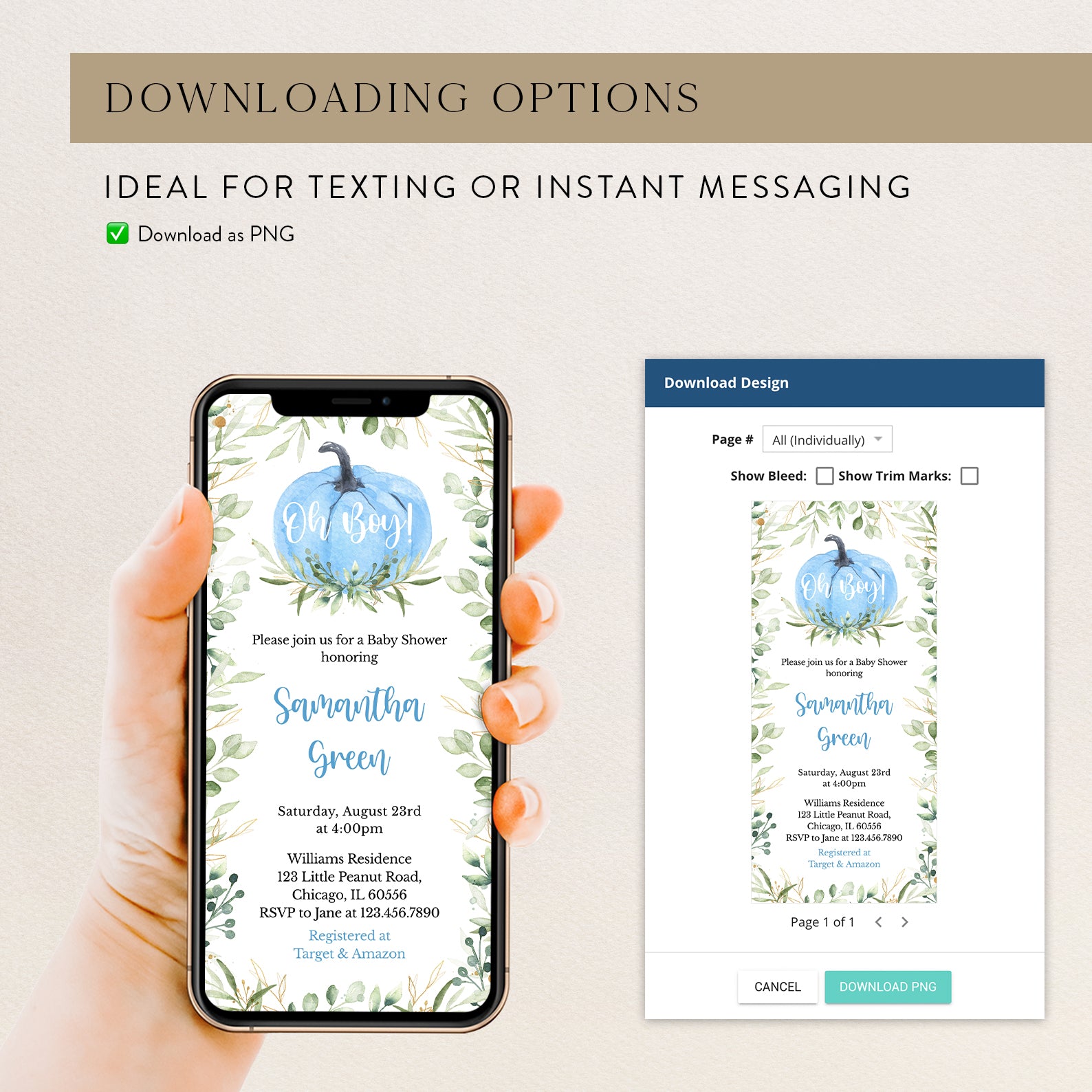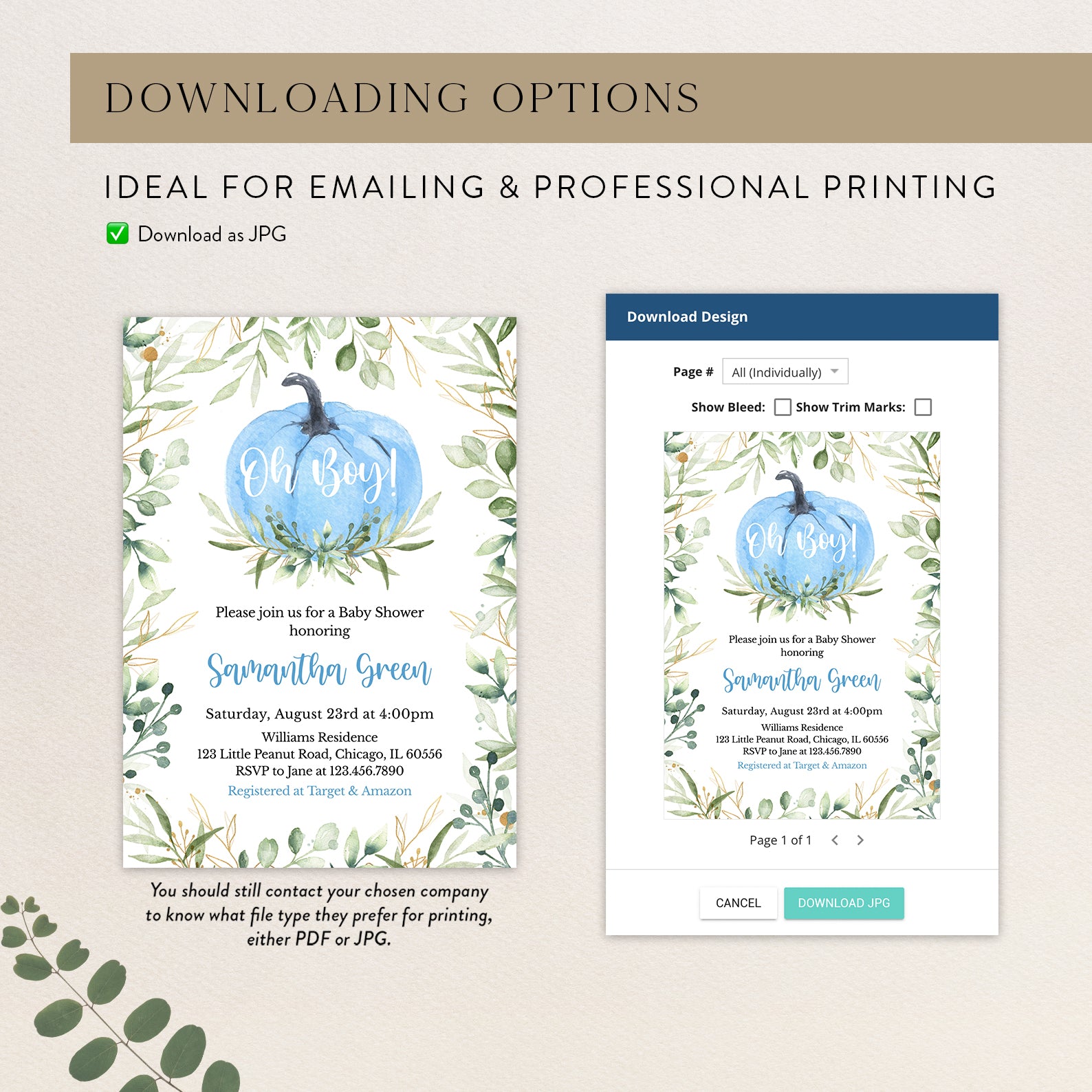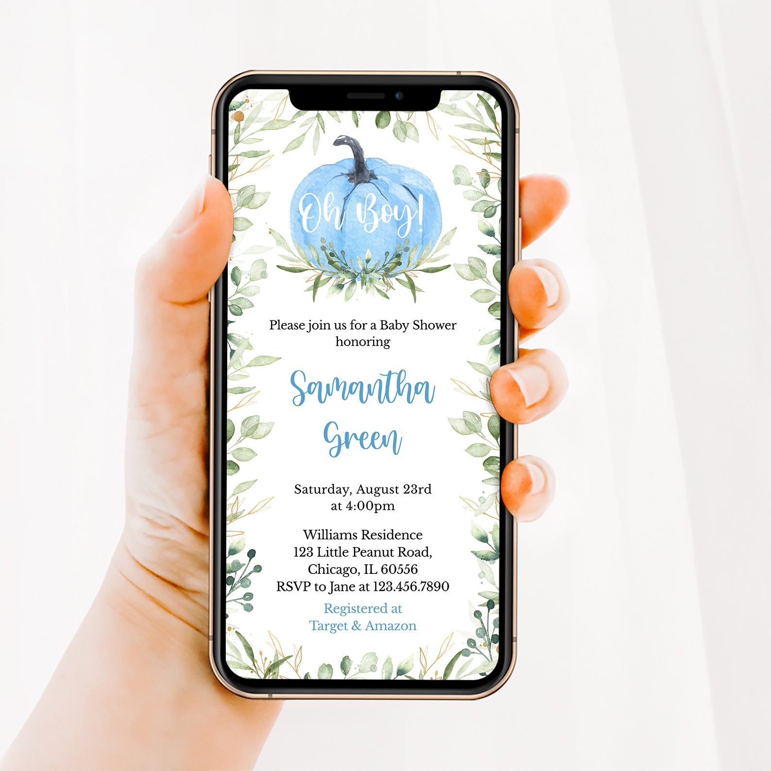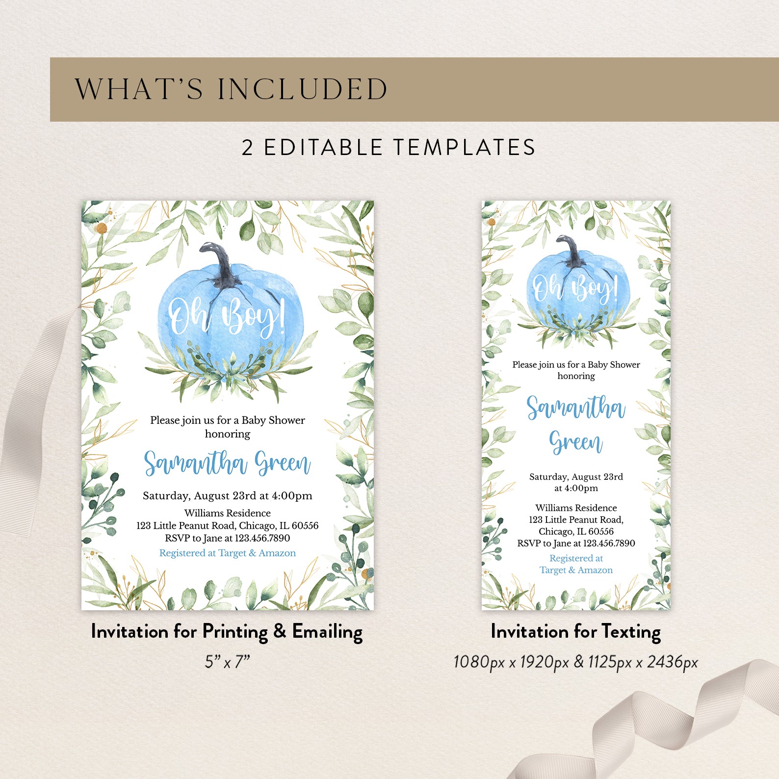 - Purchase this Oh Boy Baby Shower Invitation with Blue Pumpkin & Green Border template