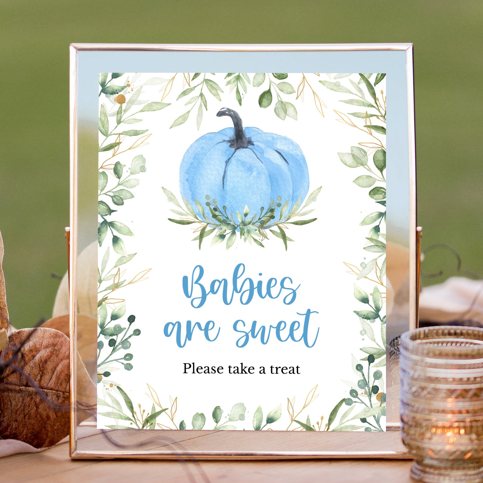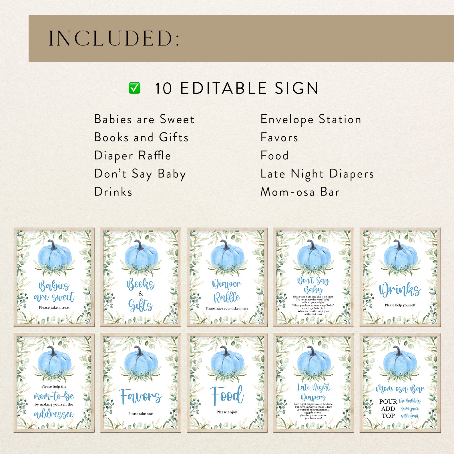 Add elegance to your fall baby shower with this set of ten editable table signs, featuring a soft blue pumpkin centerpiece and delicate green watercolor leaf accents. Each sign from “Babies Are Sweet” to “Mom-osa Bar” adds a cohesive, nature-inspired charm to your setup. Perfect for guiding guests around your event while enhancing your décor with cozy autumn hues and timeless woodland beauty.