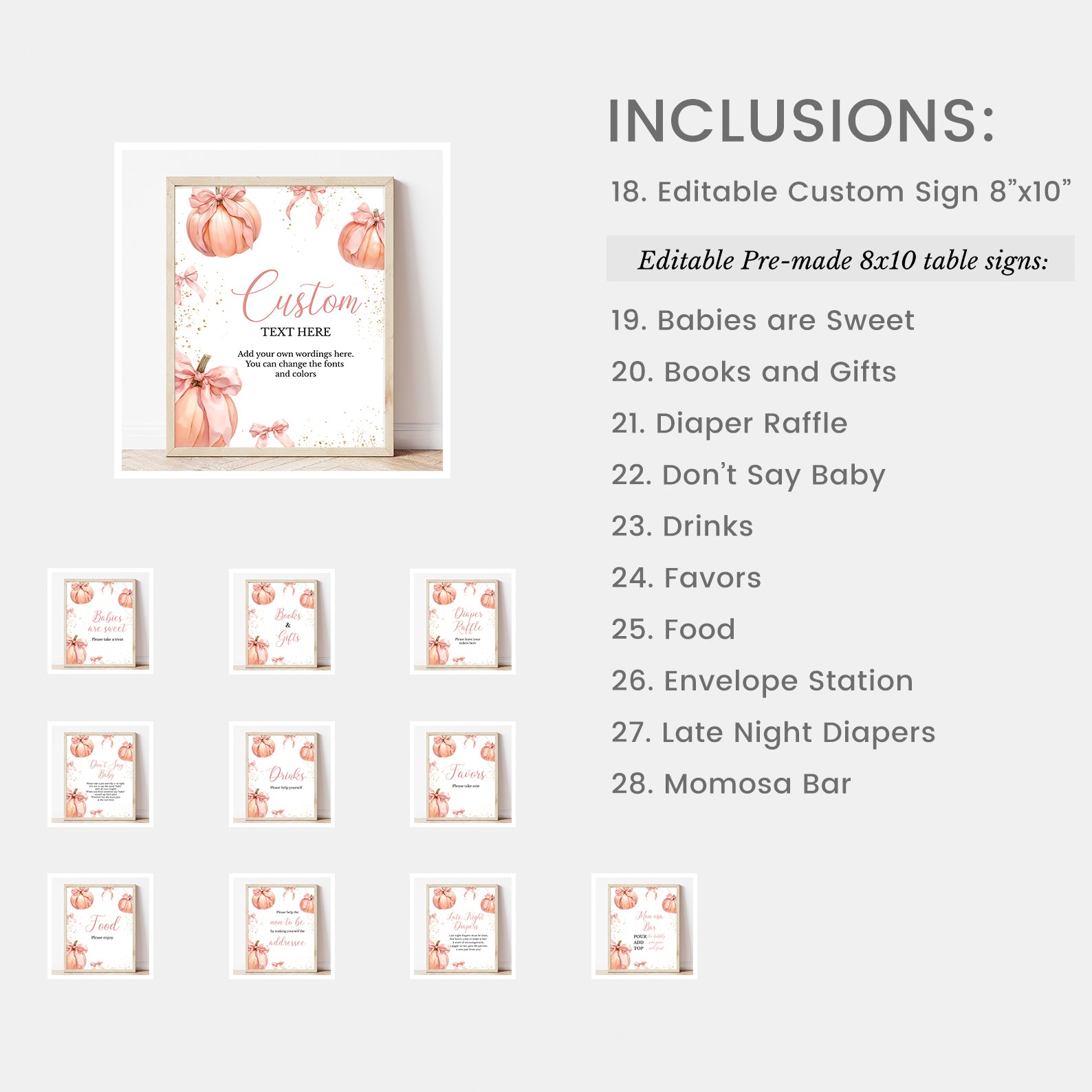 Celebrate your little pumpkin in style with this Fall Baby Shower Mega Bundle! Featuring 100 editable items, this all-in-one set includes everything you need from the invitation and matching mobile version to coordinating decor like a welcome sign, table signs, favor tags, food labels, and 60 fun baby shower games. Designed with peach pumpkins, pink ribbons, and gold accents, this soft pink autumn theme brings charm and warmth to your celebration.