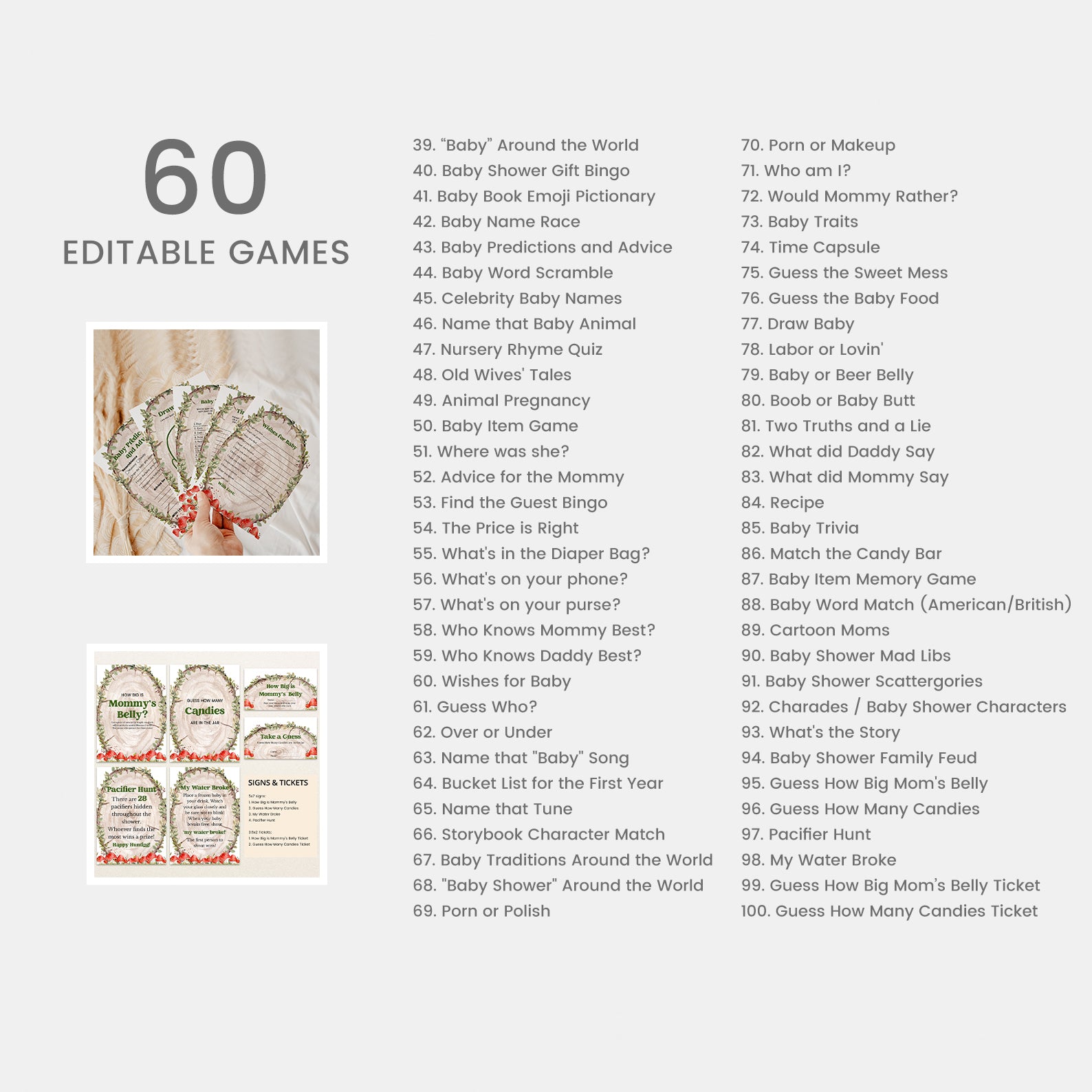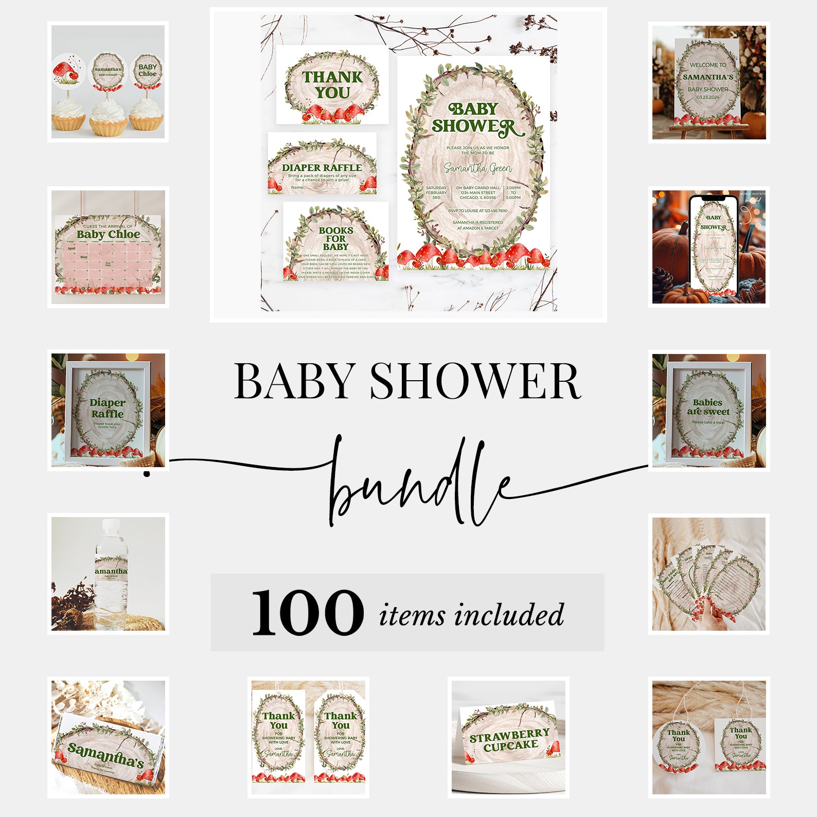 Celebrate your little one's arrival in style with this all-in-one fall baby shower mega bundle! Featuring 100 coordinated items from invitations and thank you cards to editable games and party decor. This collection has everything you need for a cohesive, beautifully themed event. Centered around a rustic log slice design with playful red mushrooms and vibrant greenery, each piece brings cozy woodland charm to your celebration. Fully editable and easy to customize for a truly personal touch!