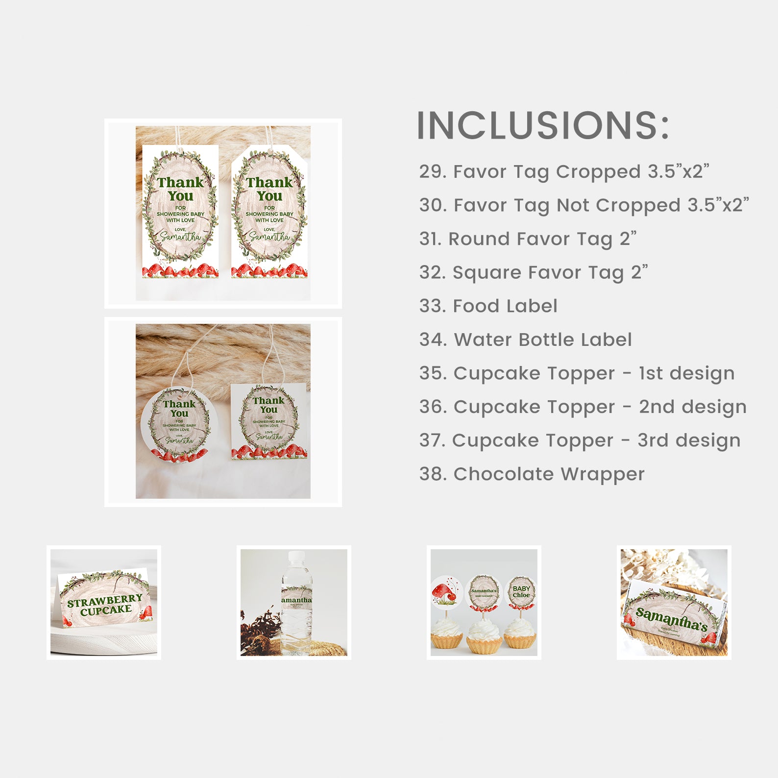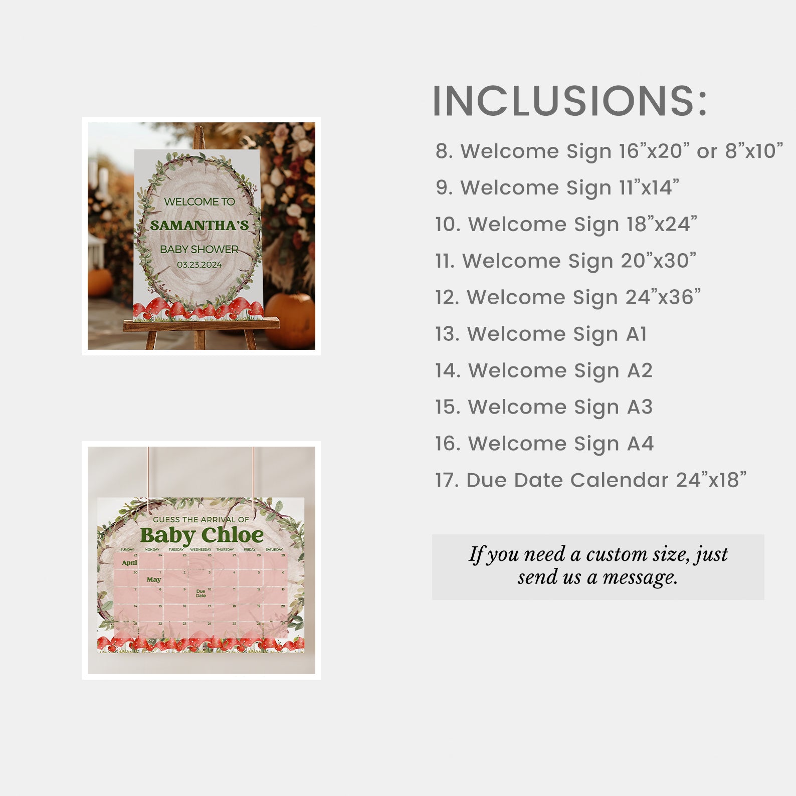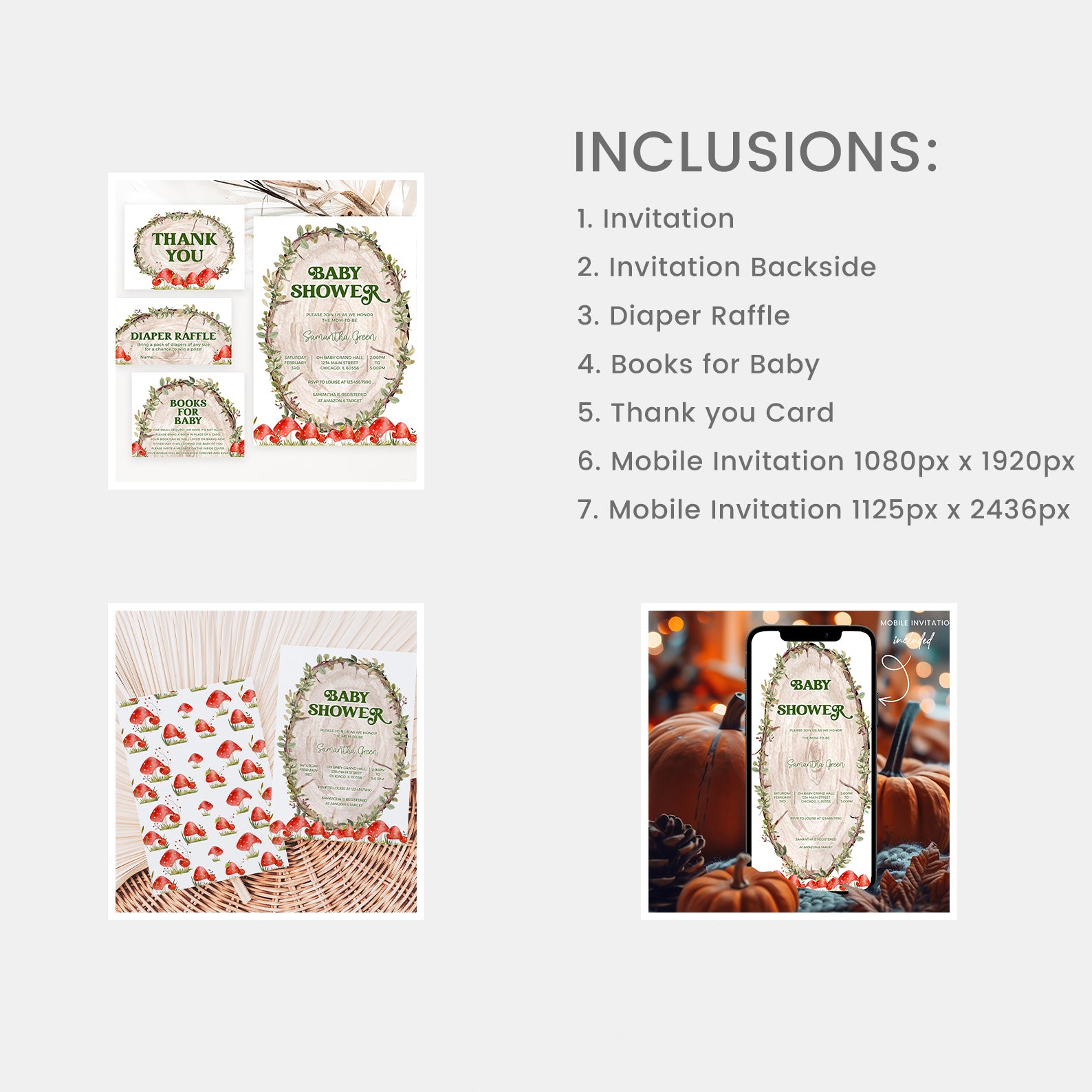 - Purchase this Rustic Log Slice Fall Baby Shower Mega Bundle with Mushrooms template