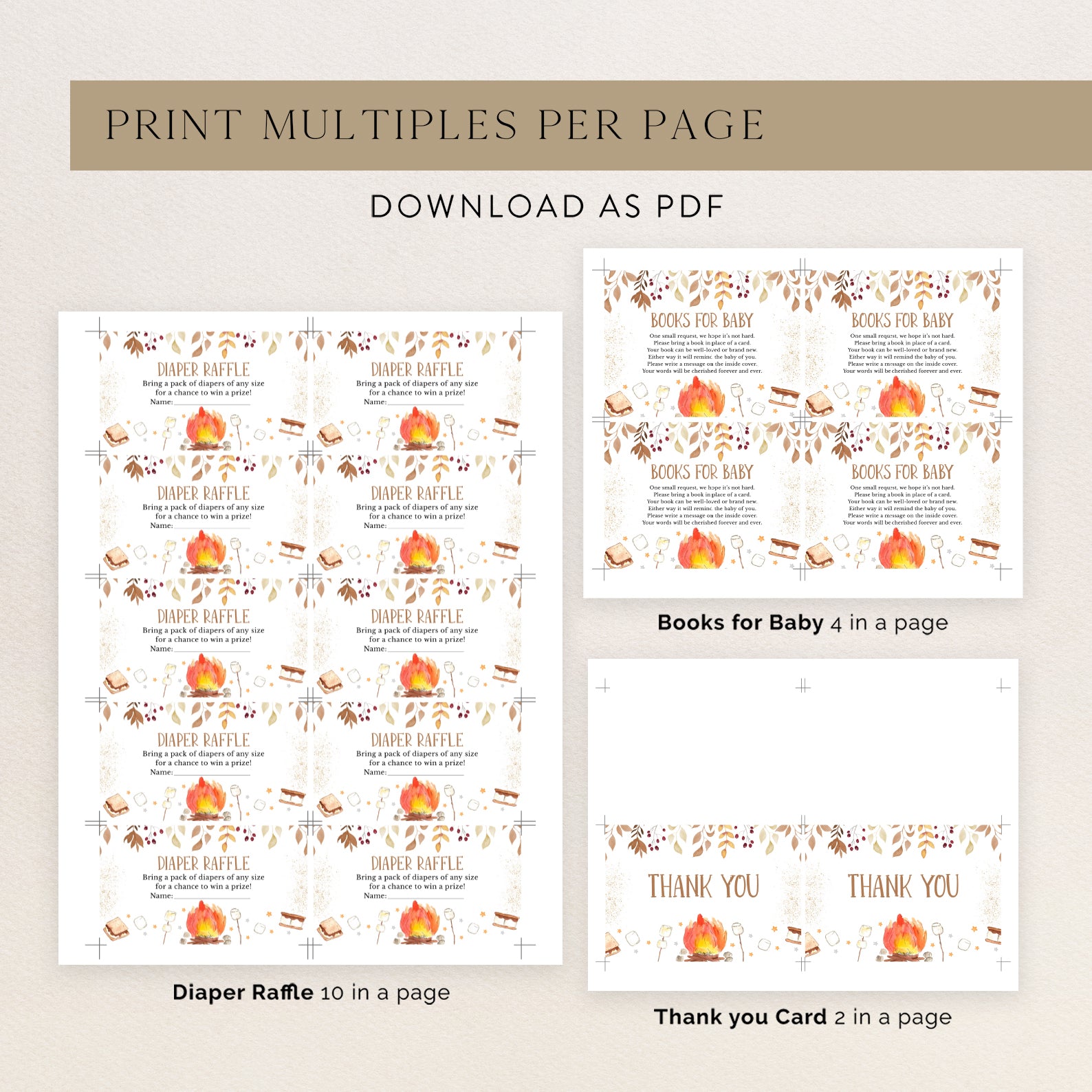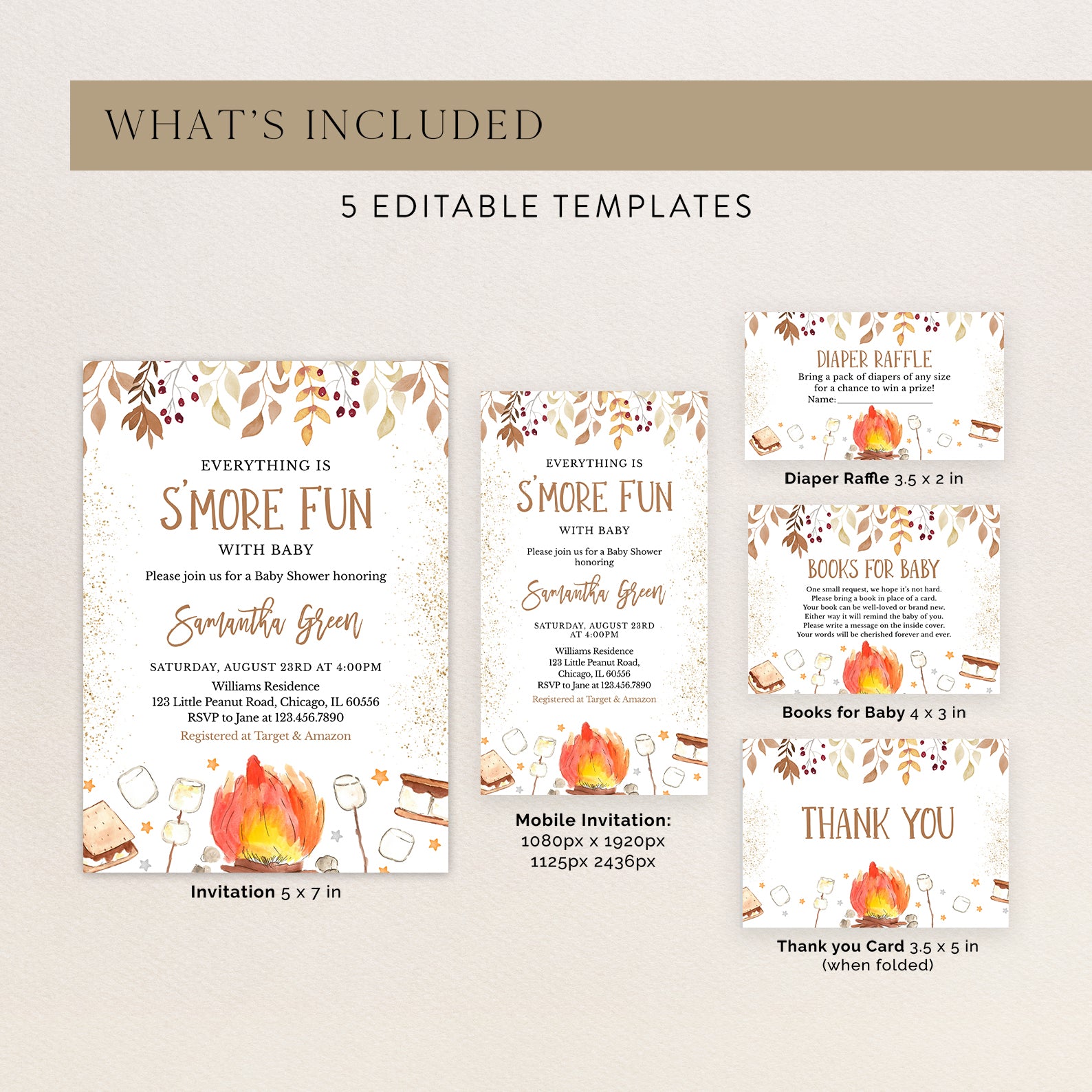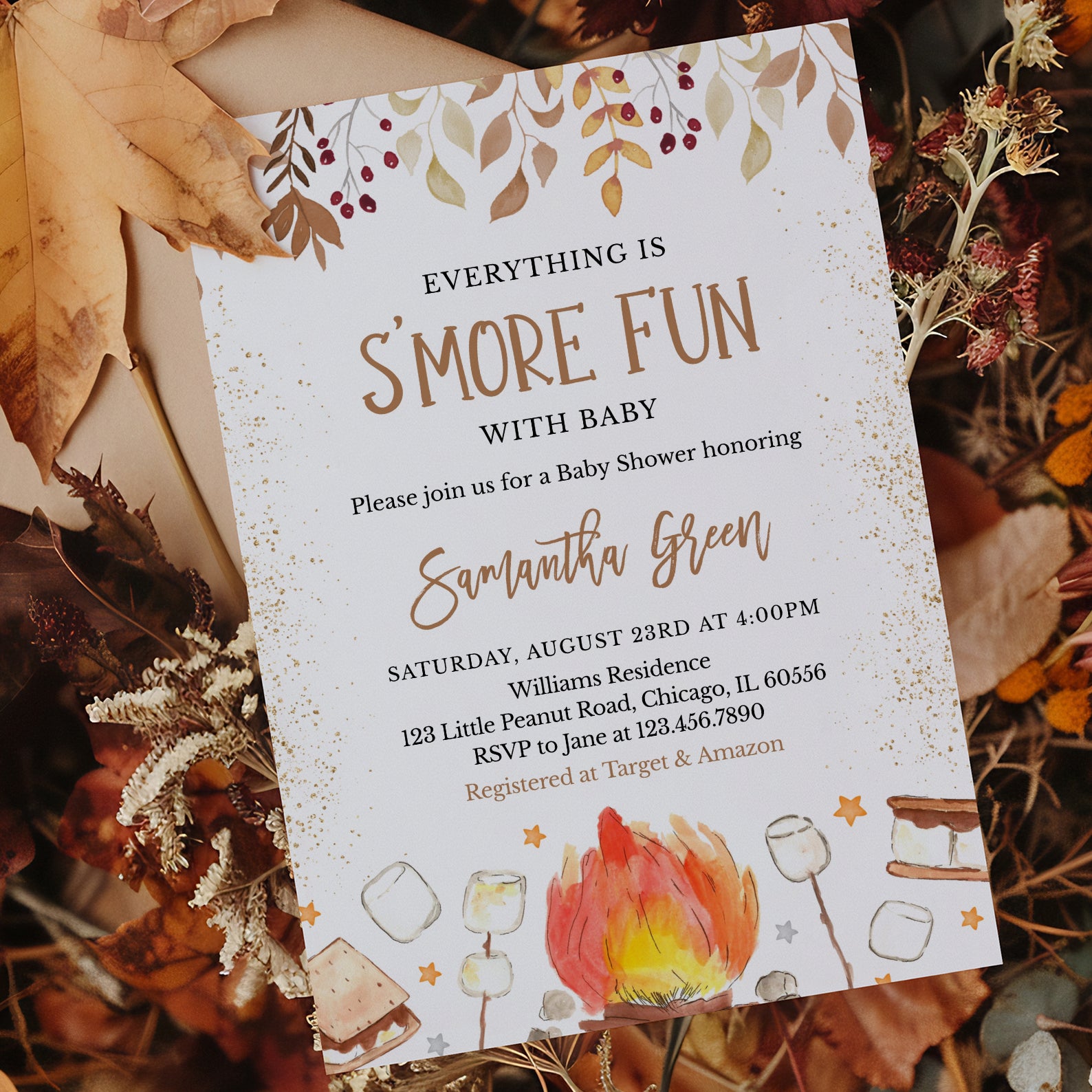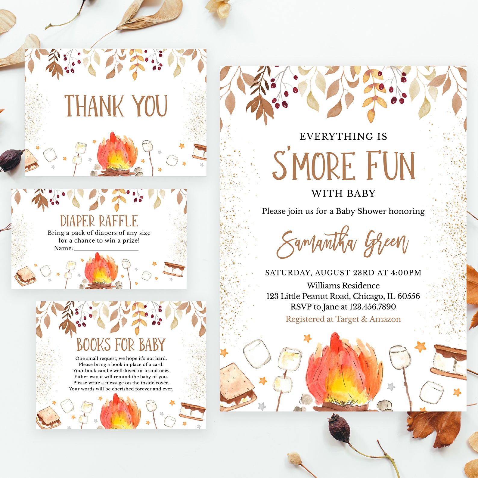 - Purchase this S'More Fun with Baby Fall Shower Invite Bundle with Campfire & Gold template