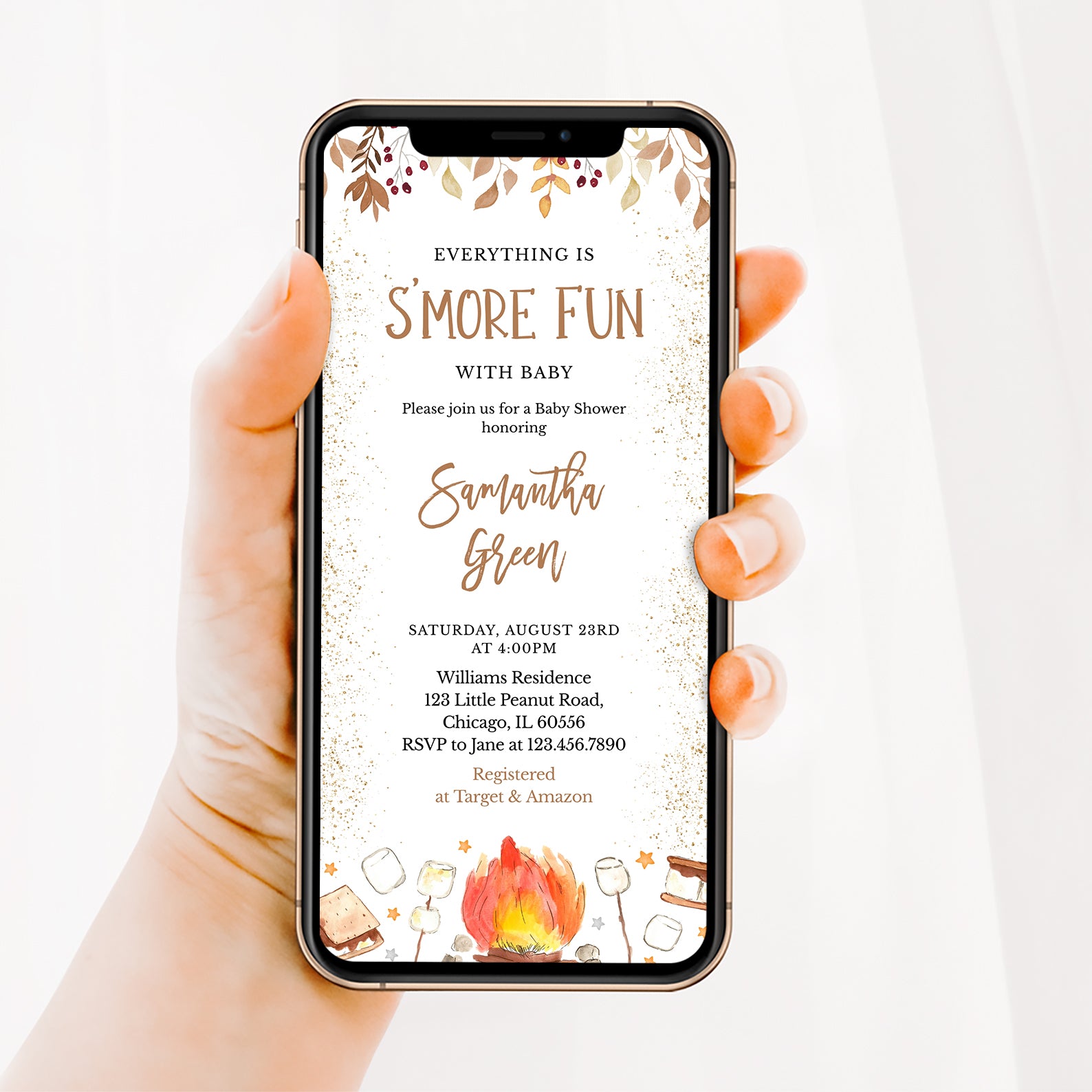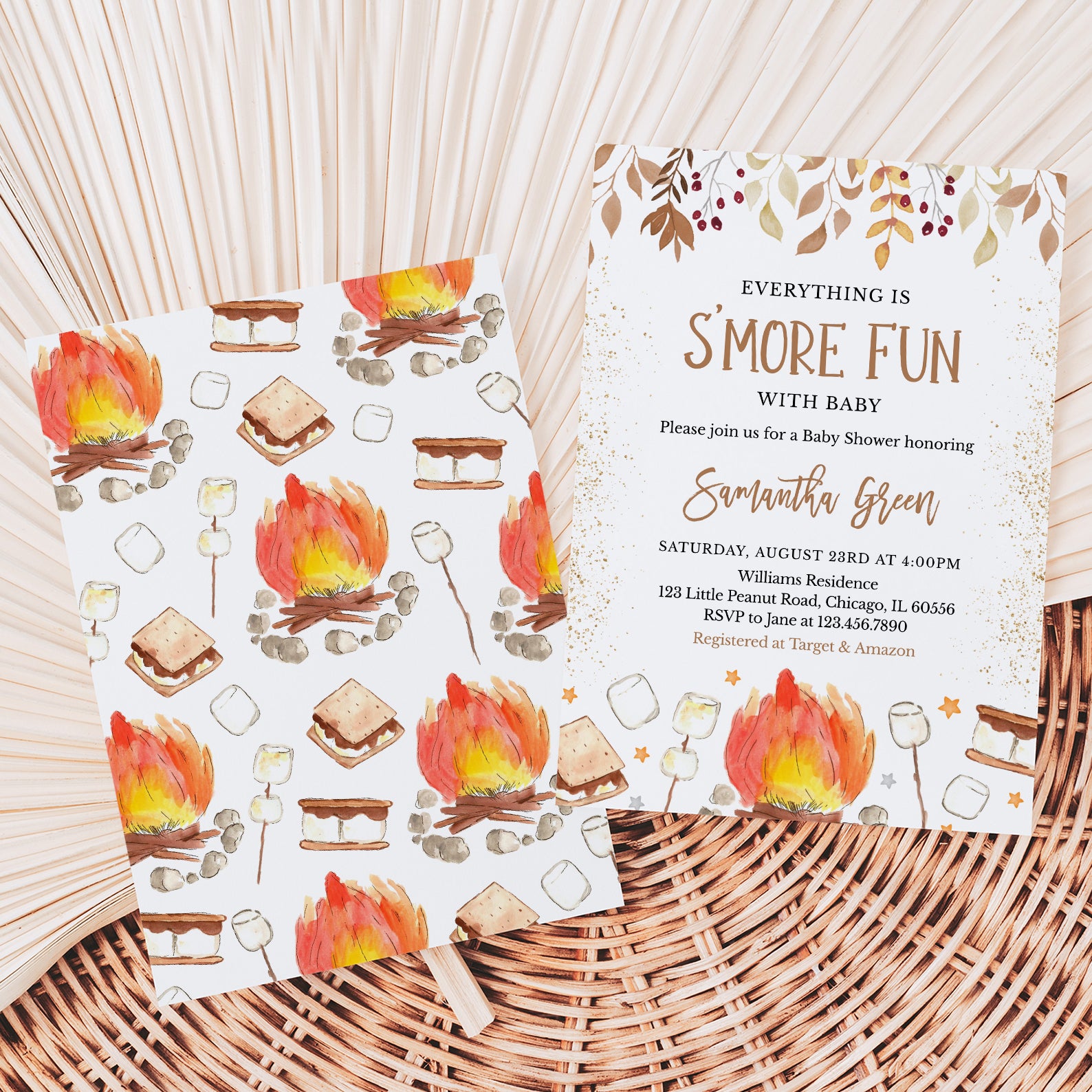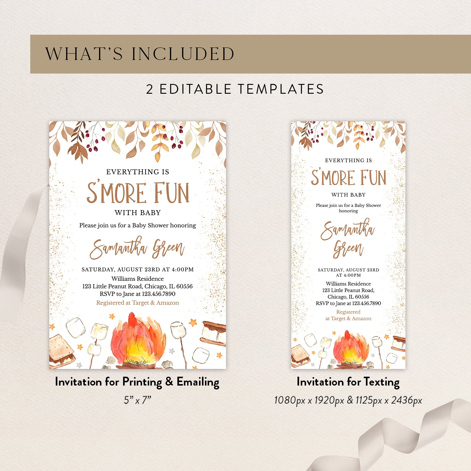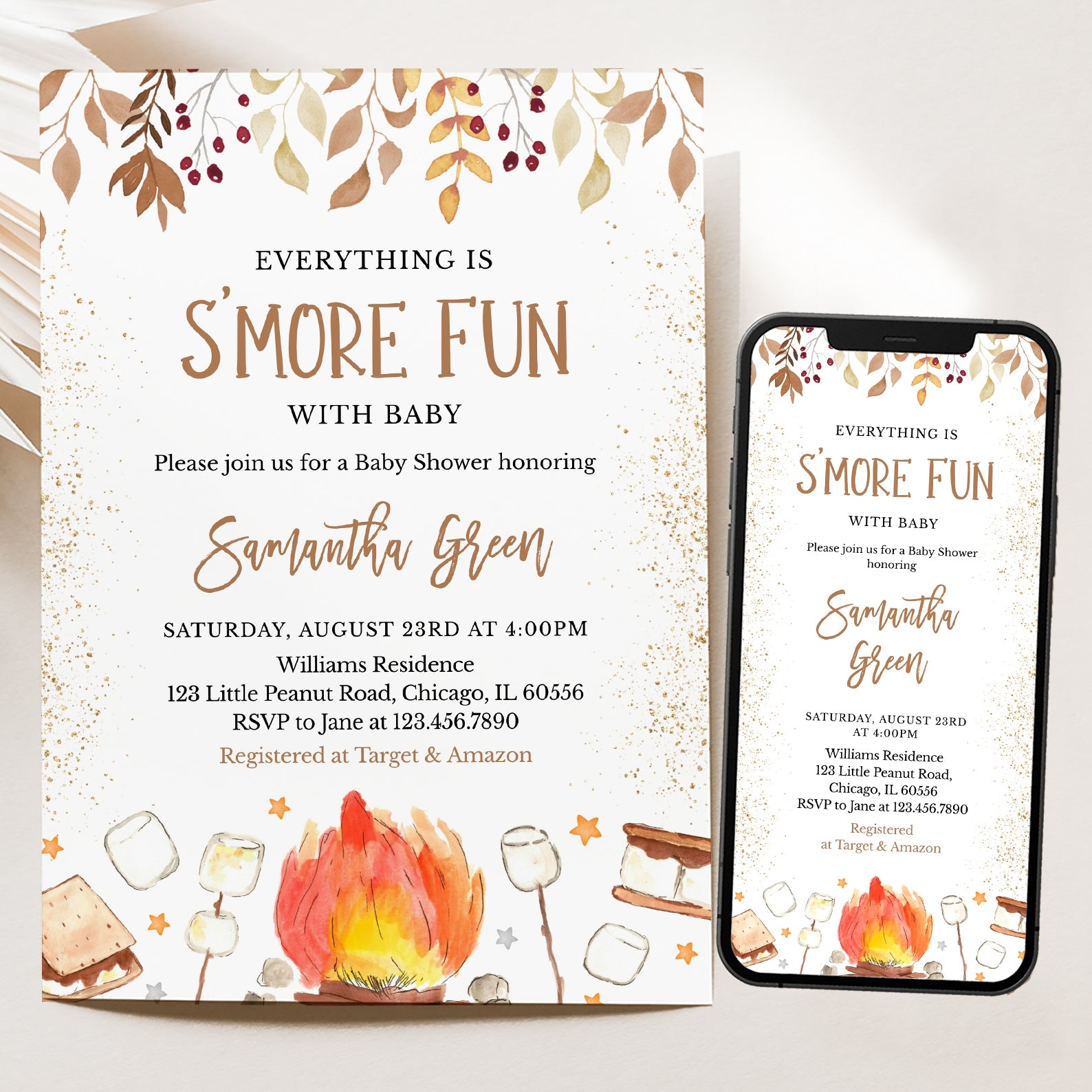 - Purchase this S'More Fun with Baby Fall Shower Invite Bundle with Campfire & Gold template