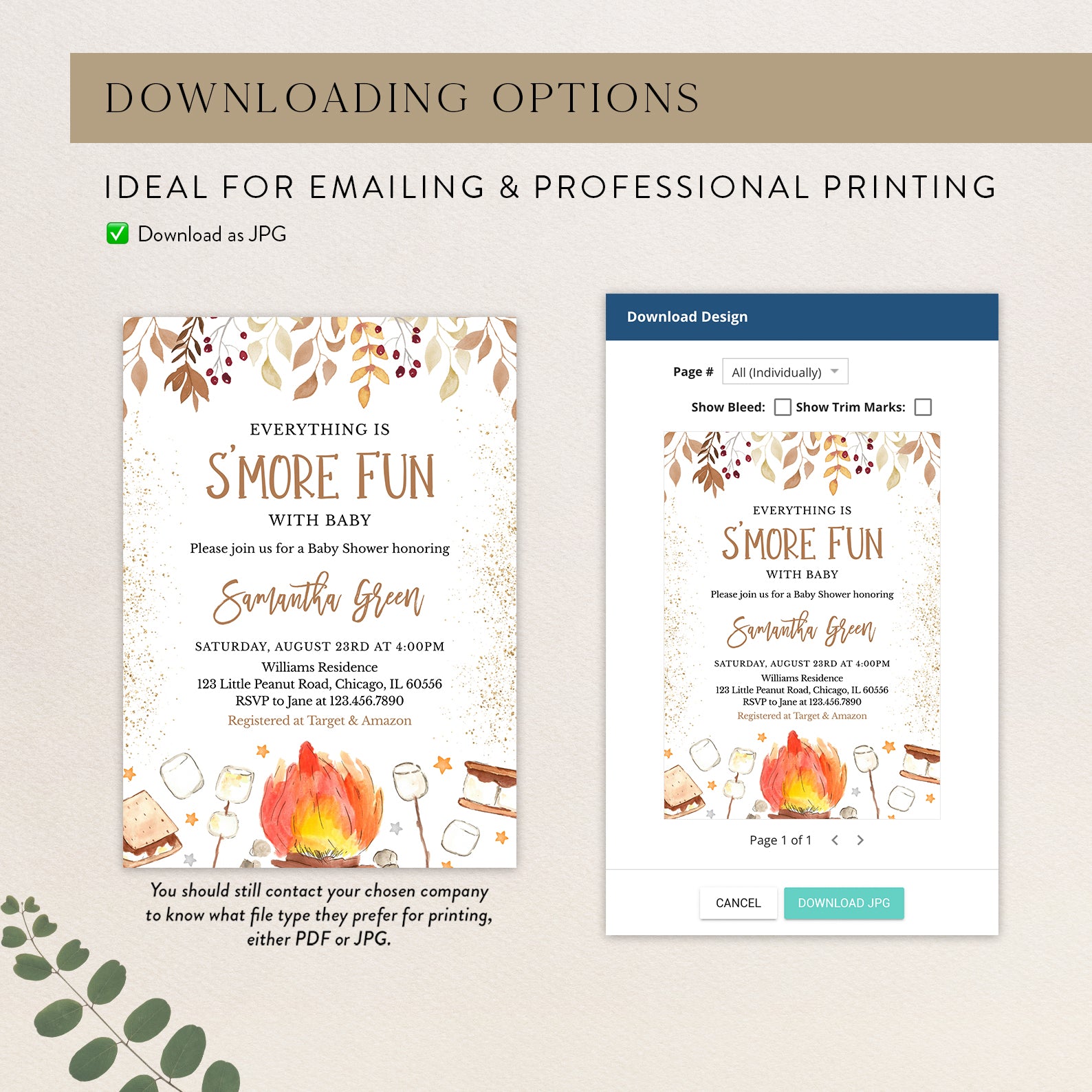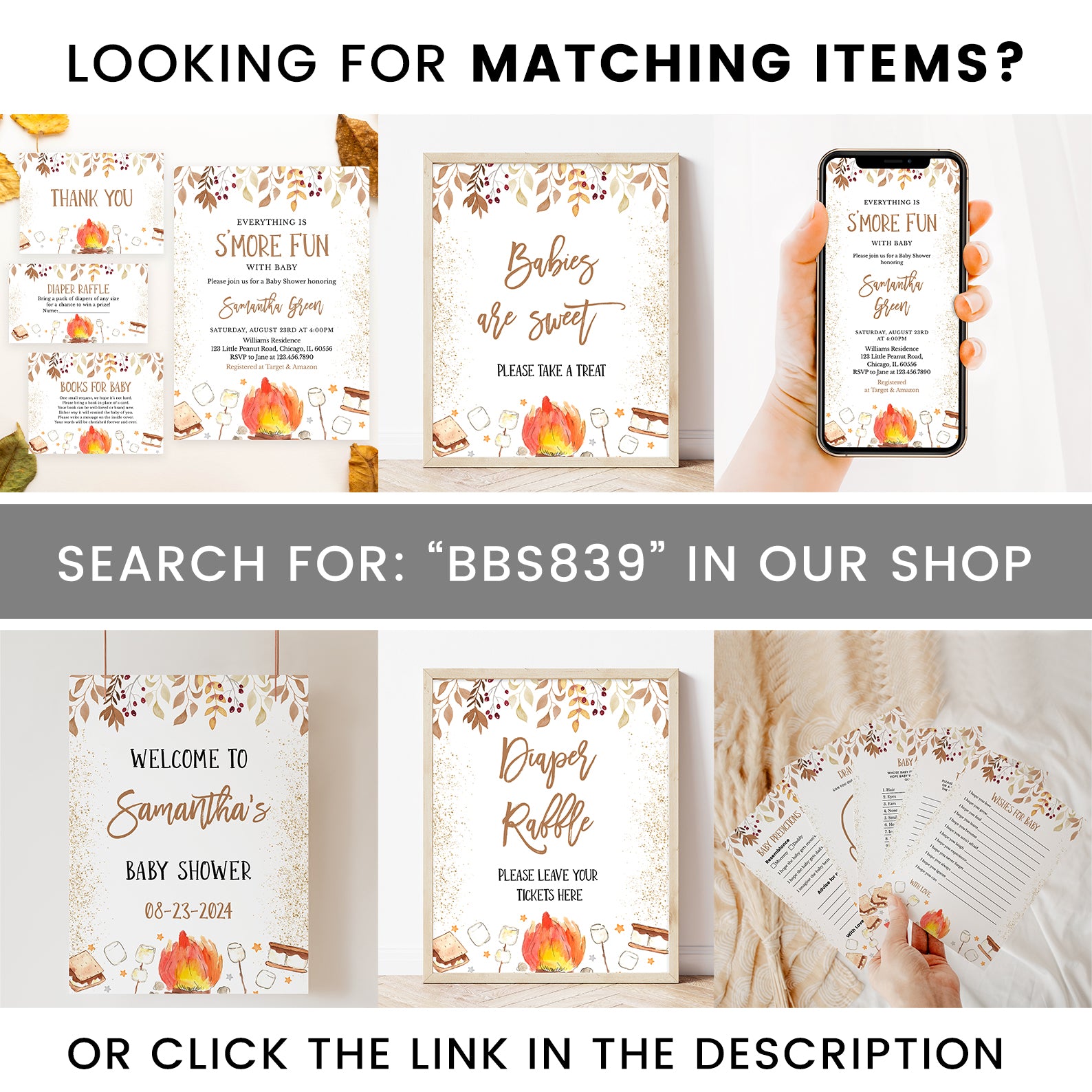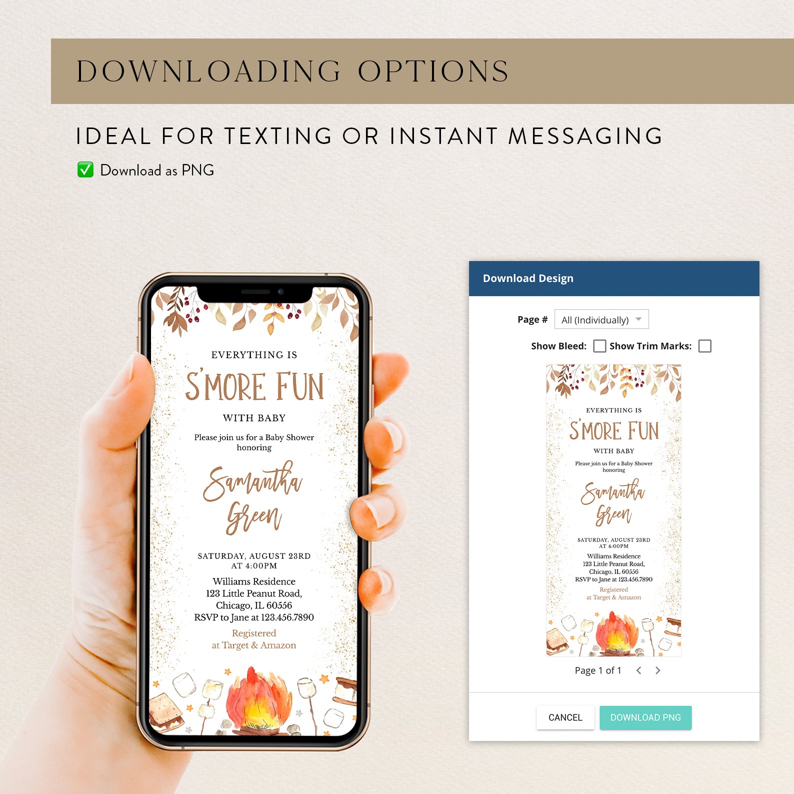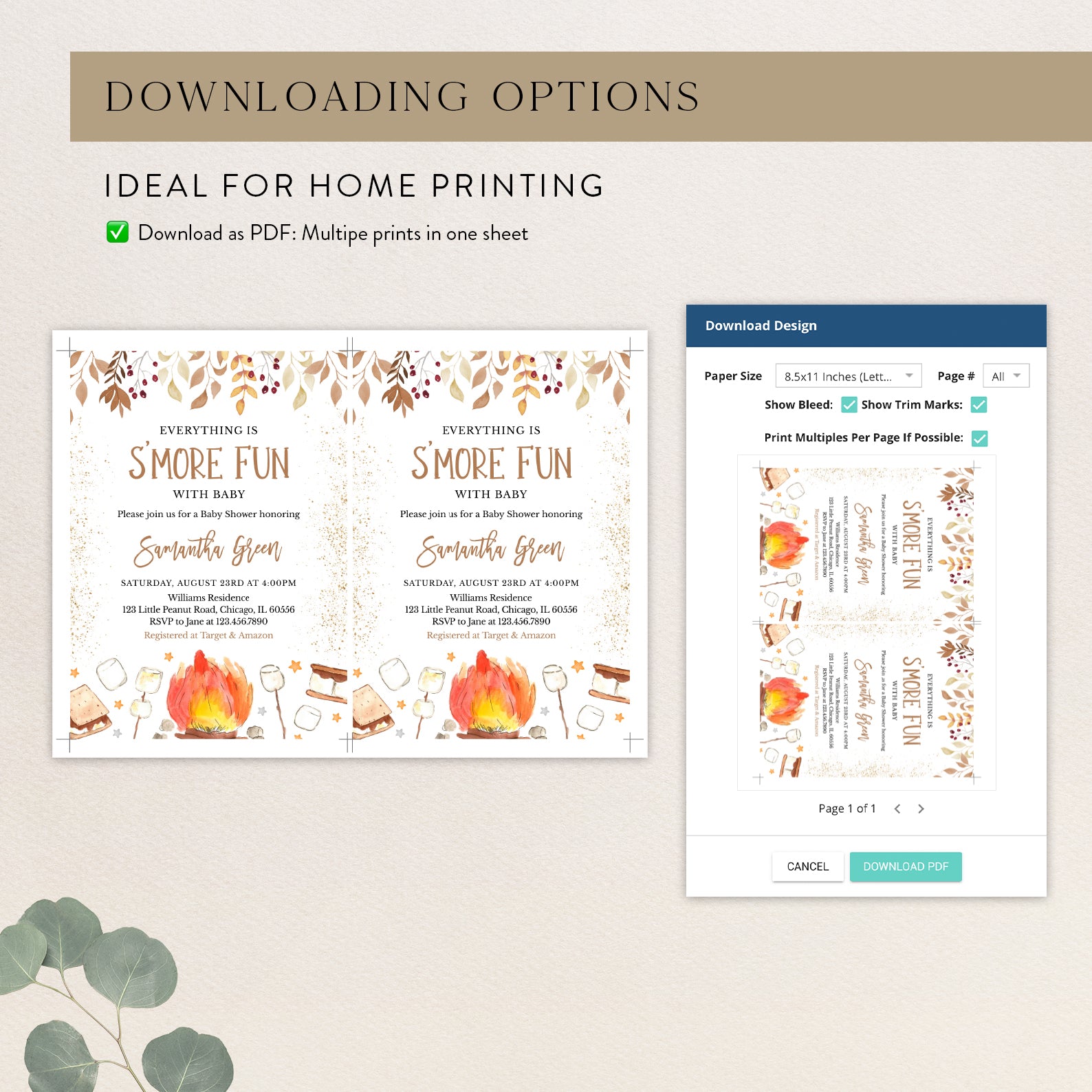 - Purchase this S'More Fun with Baby Fall Shower Invite Bundle with Campfire & Gold template