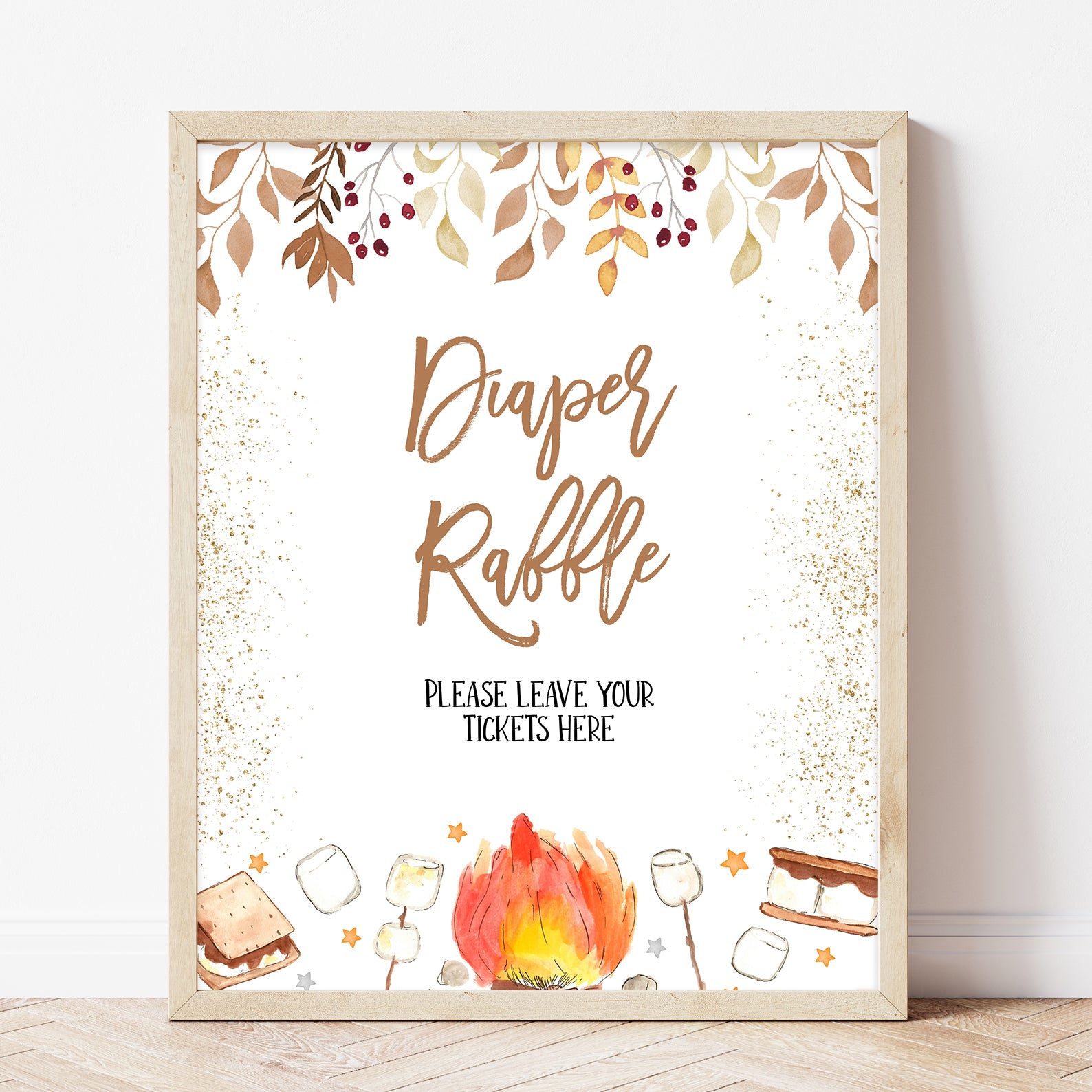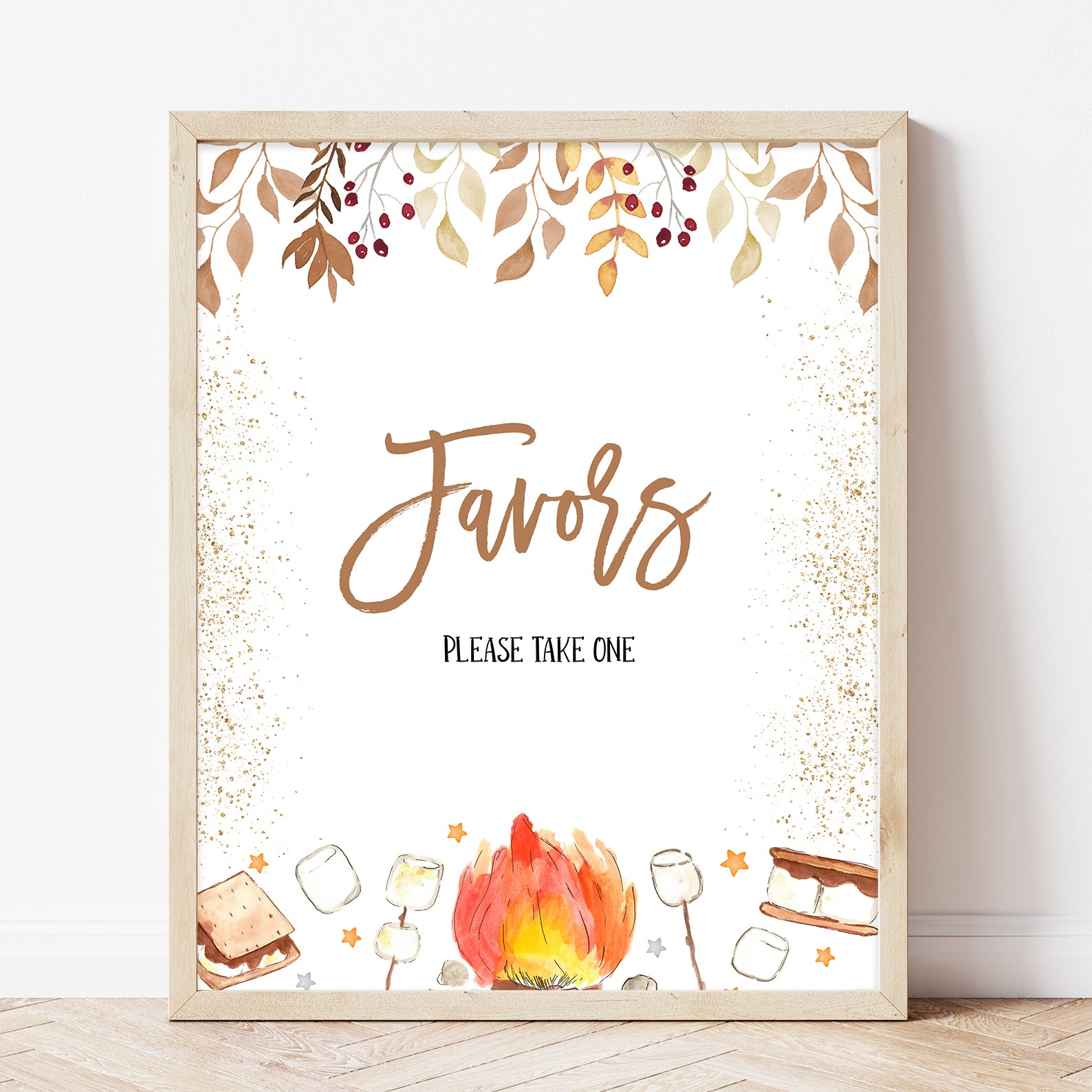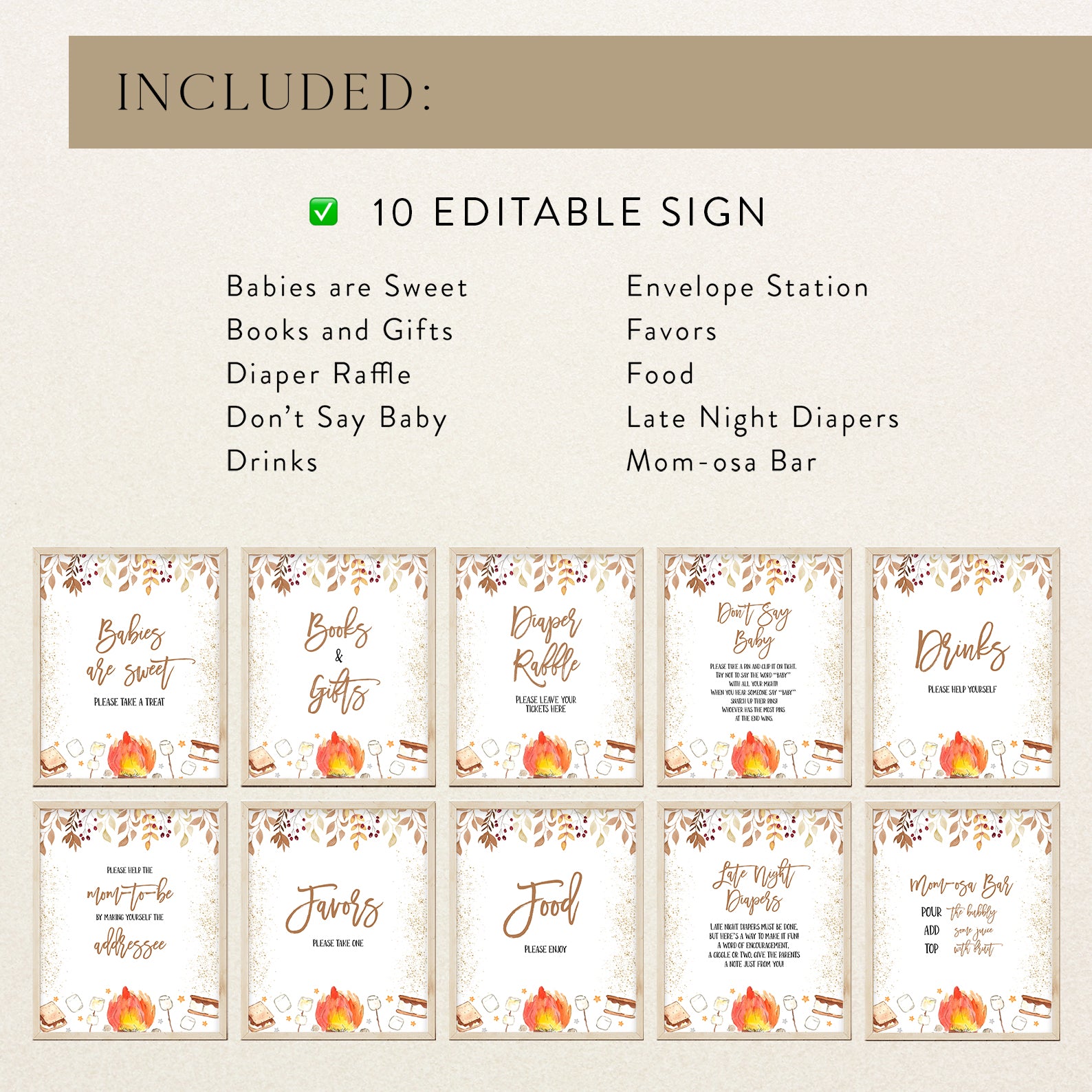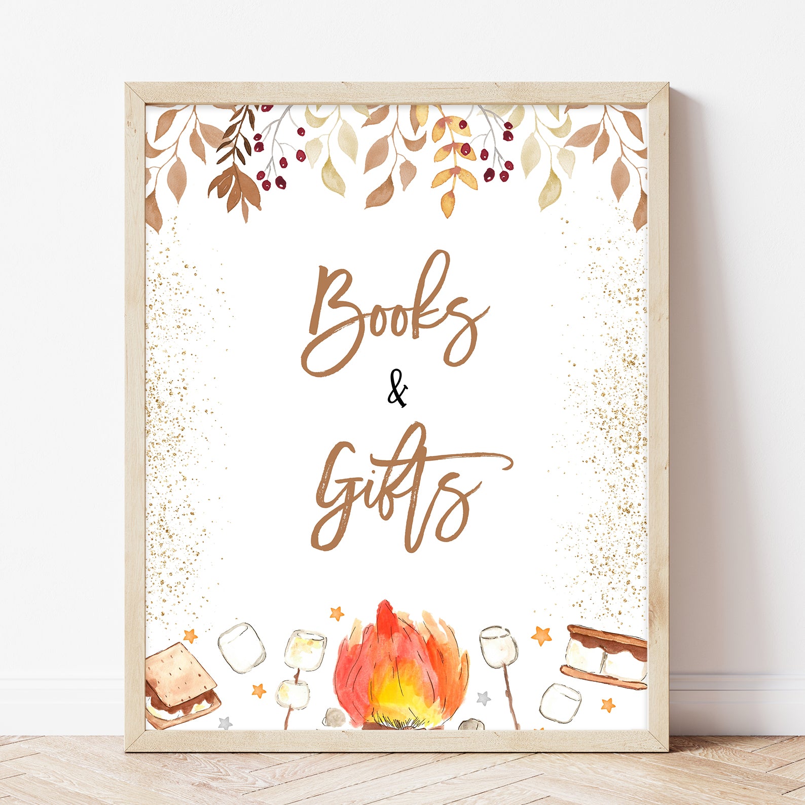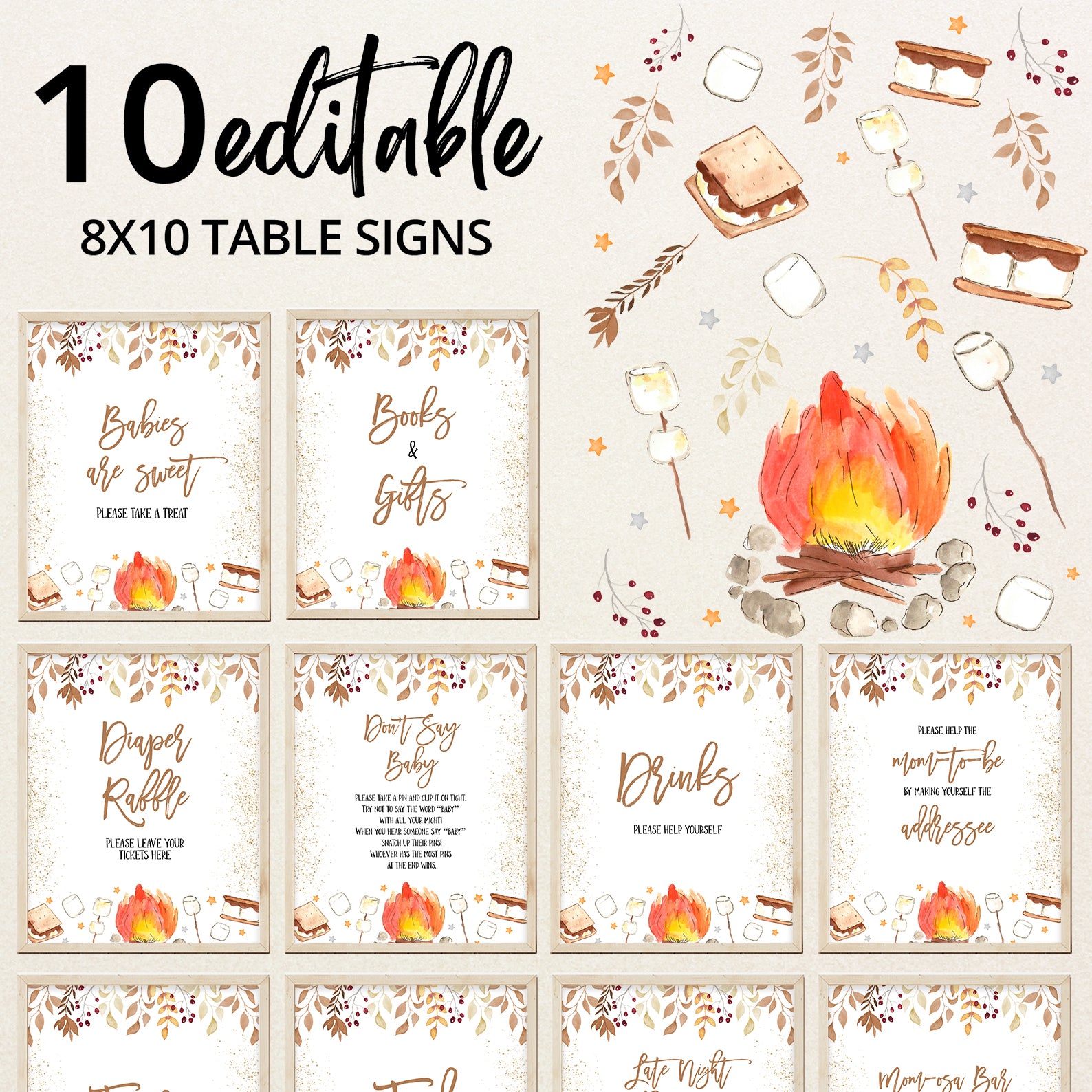 Bring warmth and whimsy to your autumn baby shower with these cozy table signs! Each of the ten editable signs features watercolor leaves, soft gold accents, and sweet s’mores illustrations nestled near twinkling stars. Whether marking the “Mom-osa Bar” or “Books and Gifts,” this set adds both charm and function to your celebration perfectly capturing the magic of fall gatherings and sweet baby moments.
