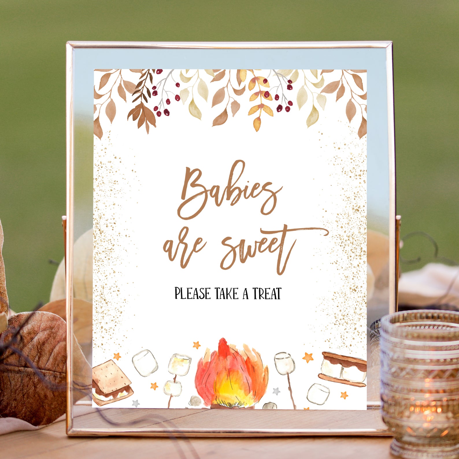 - Purchase this S'More Fun with Baby Fall Shower Table Sign with Campfire & Gold template