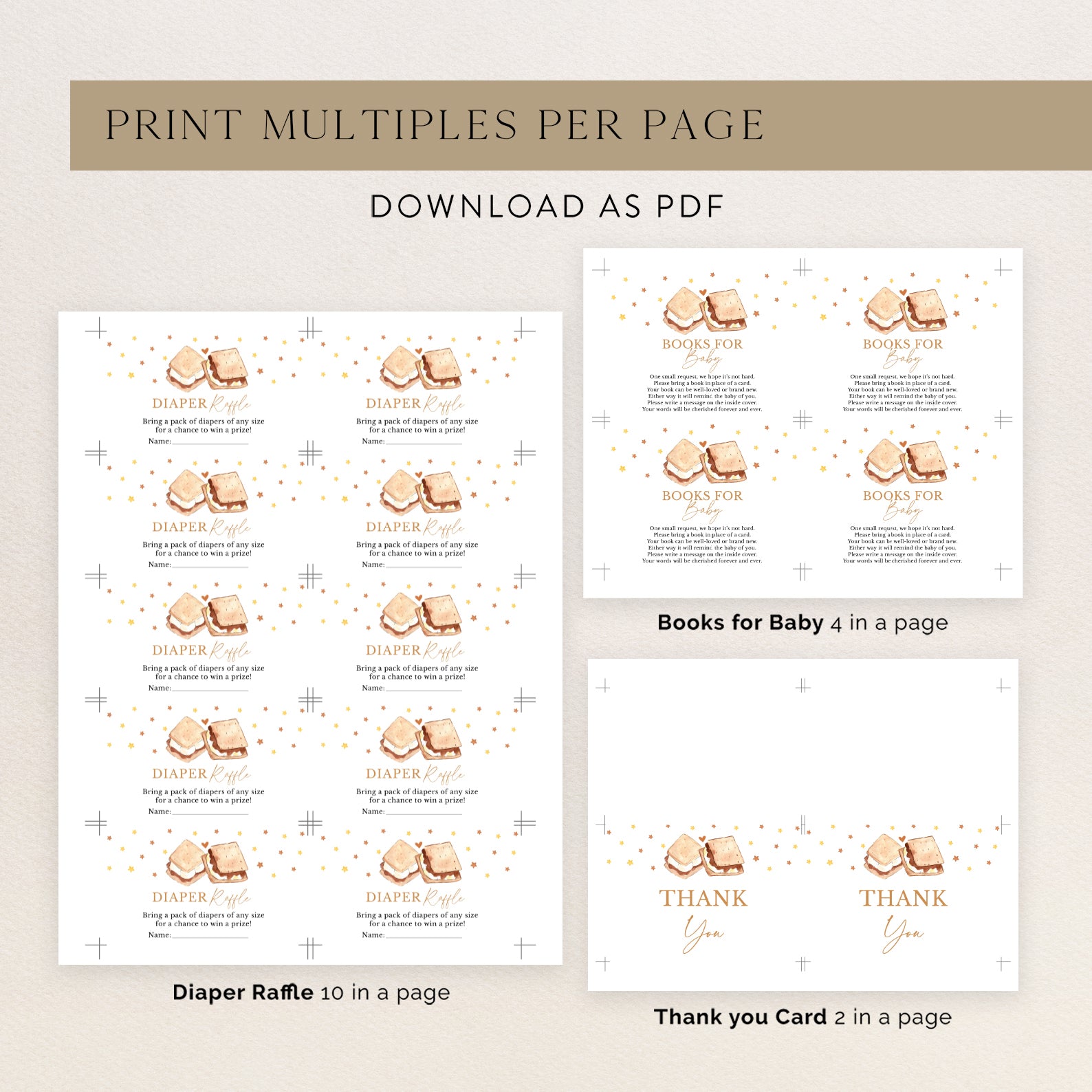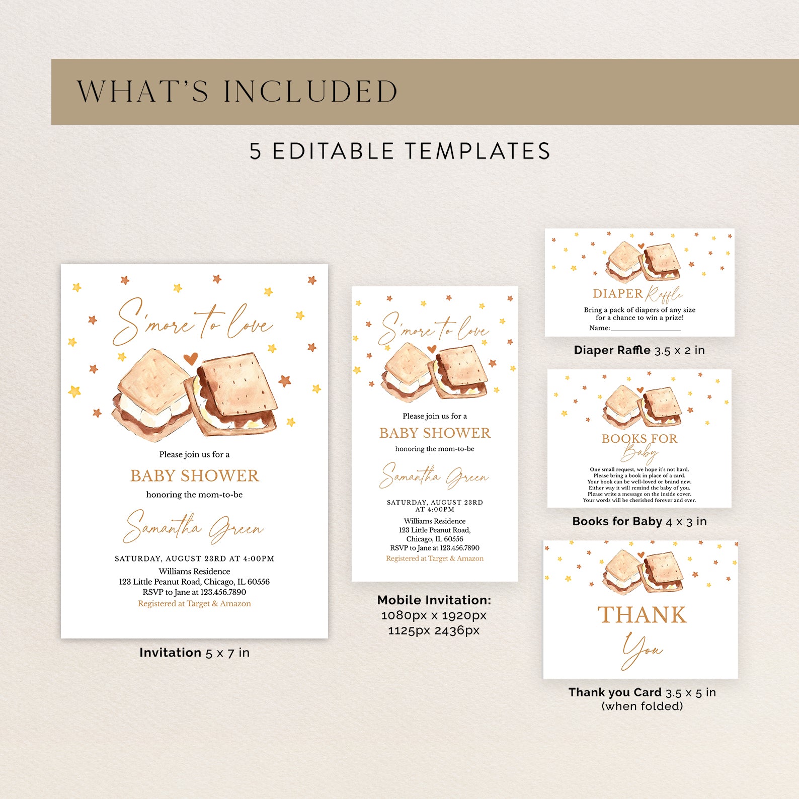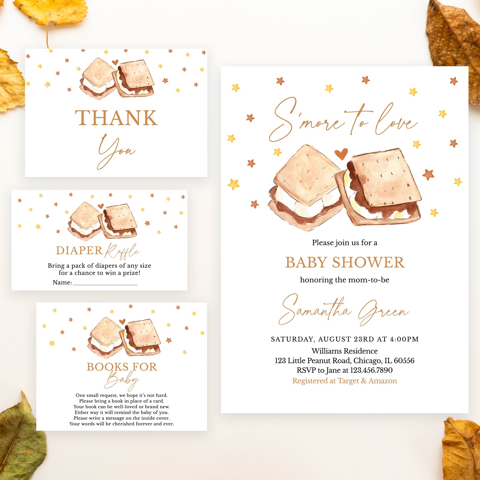 - Purchase this S'more to Love Fall Baby Shower Invitation Bundle with Heart & Stars template