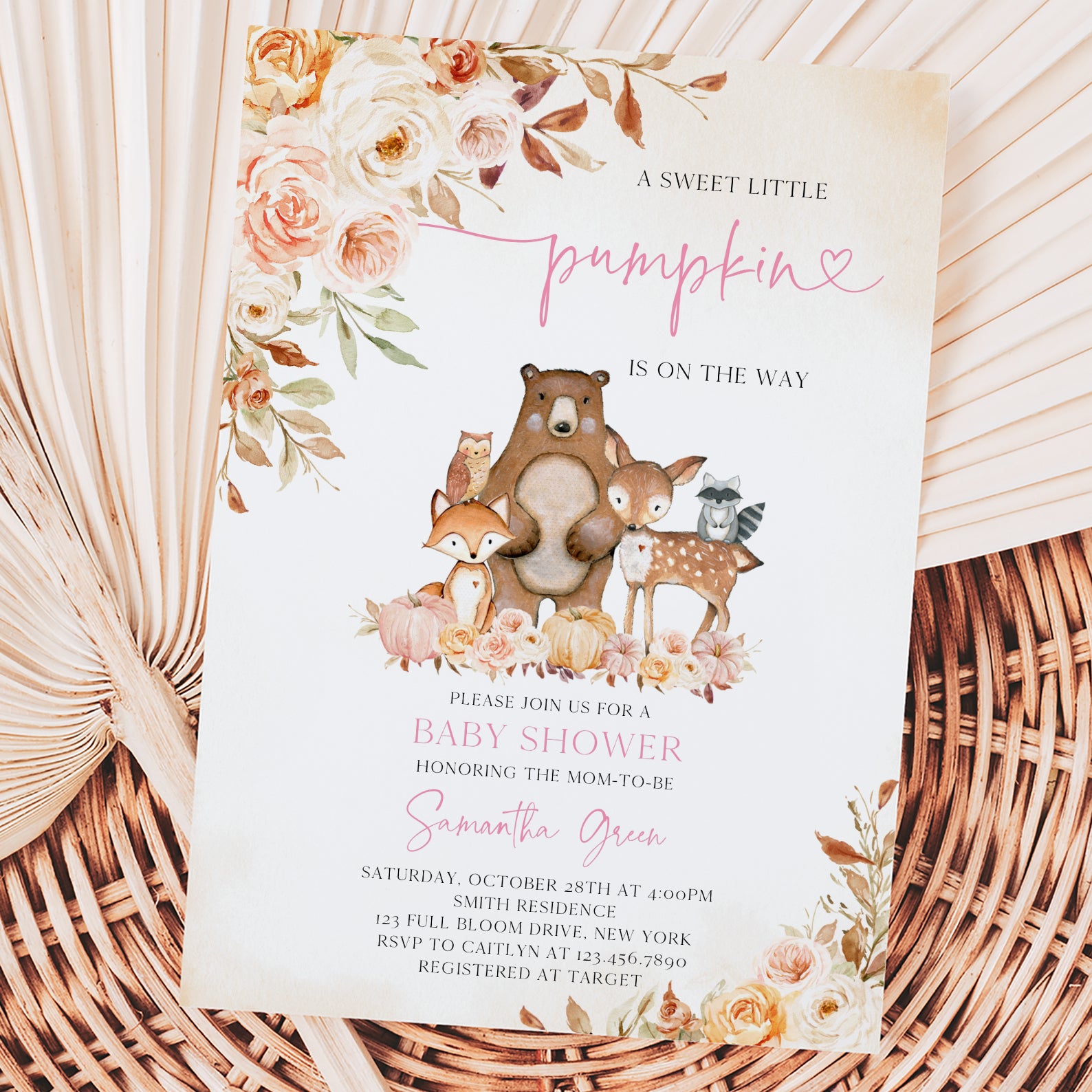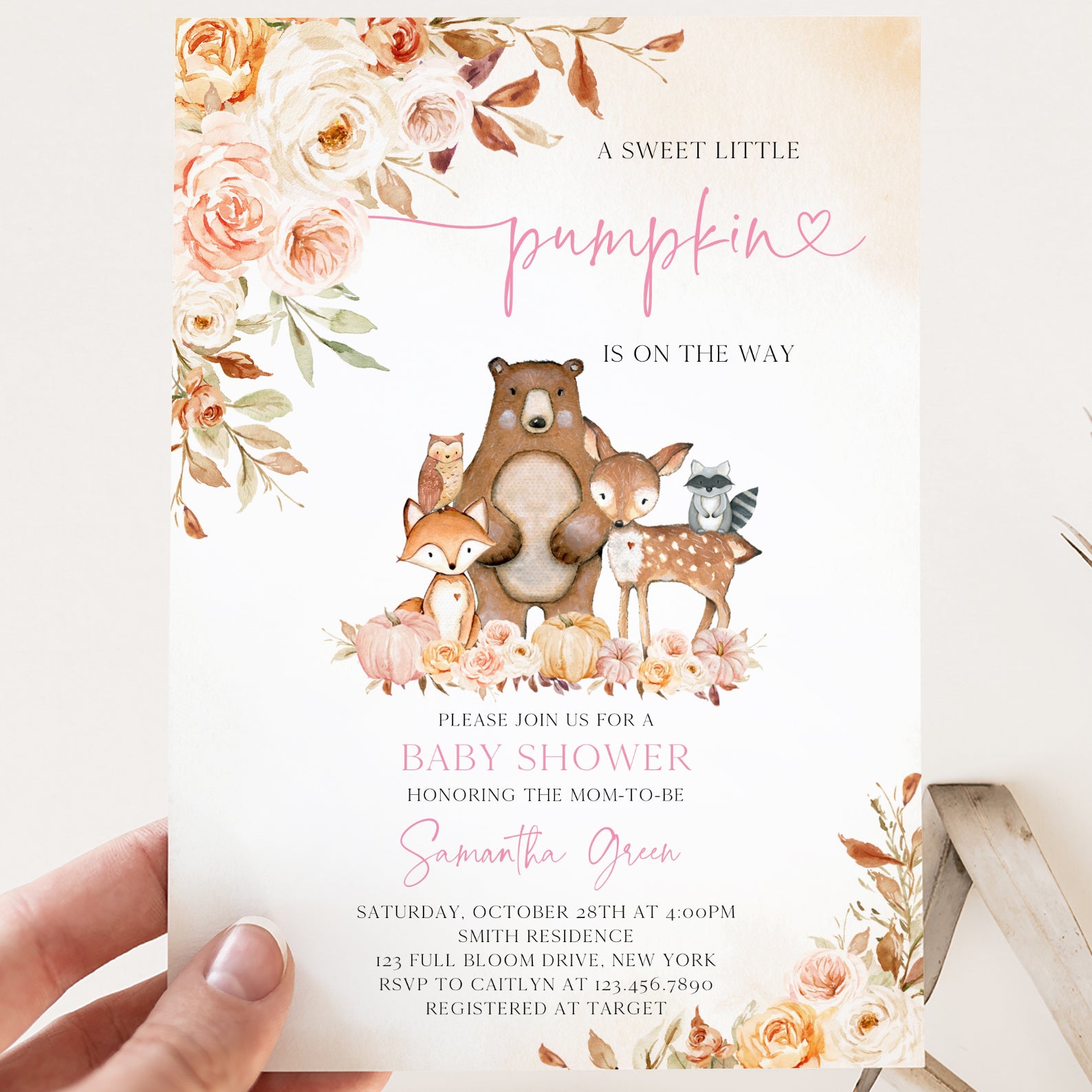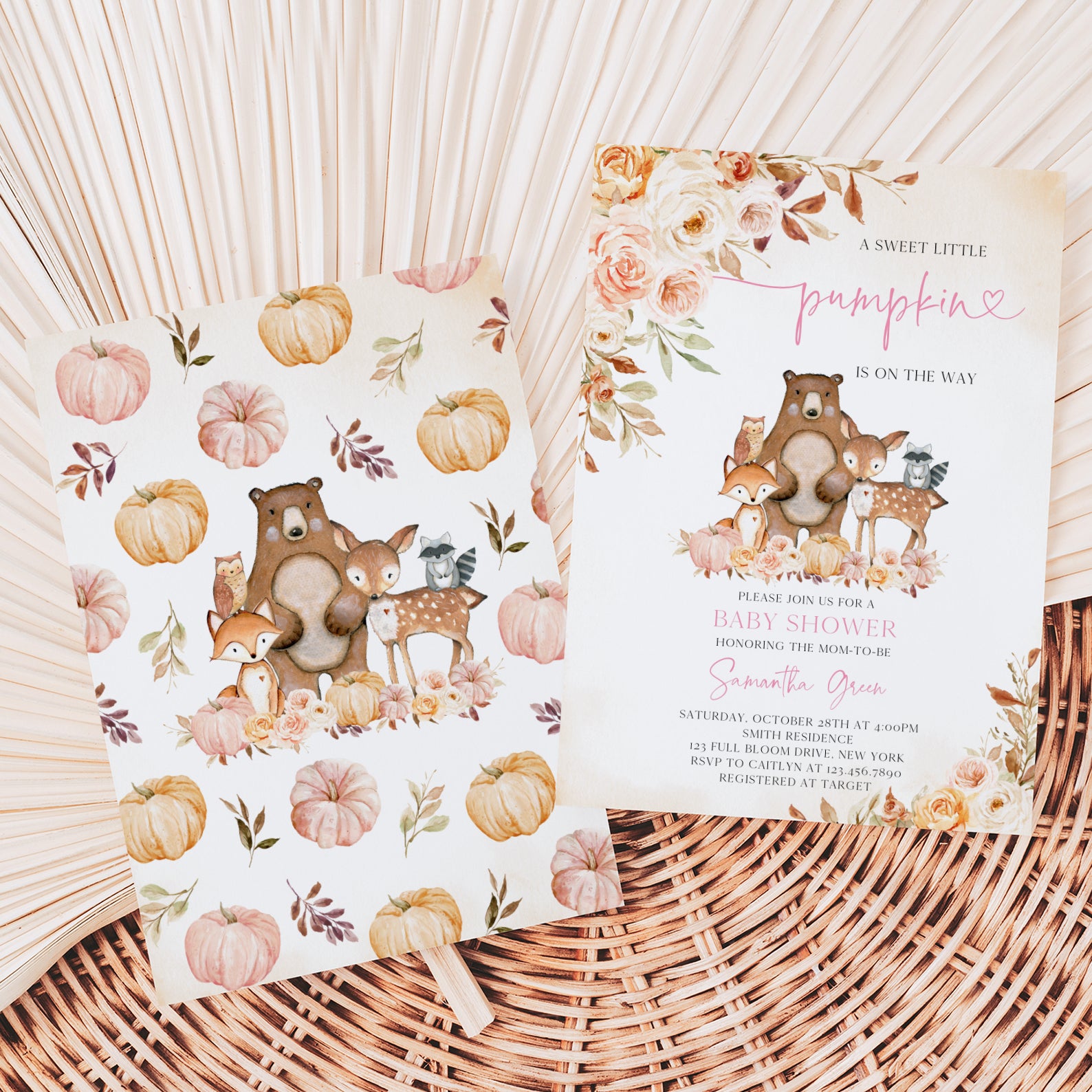 - Purchase this Sweet Little Pumpkin Baby Shower Invite with Woodland Animals template