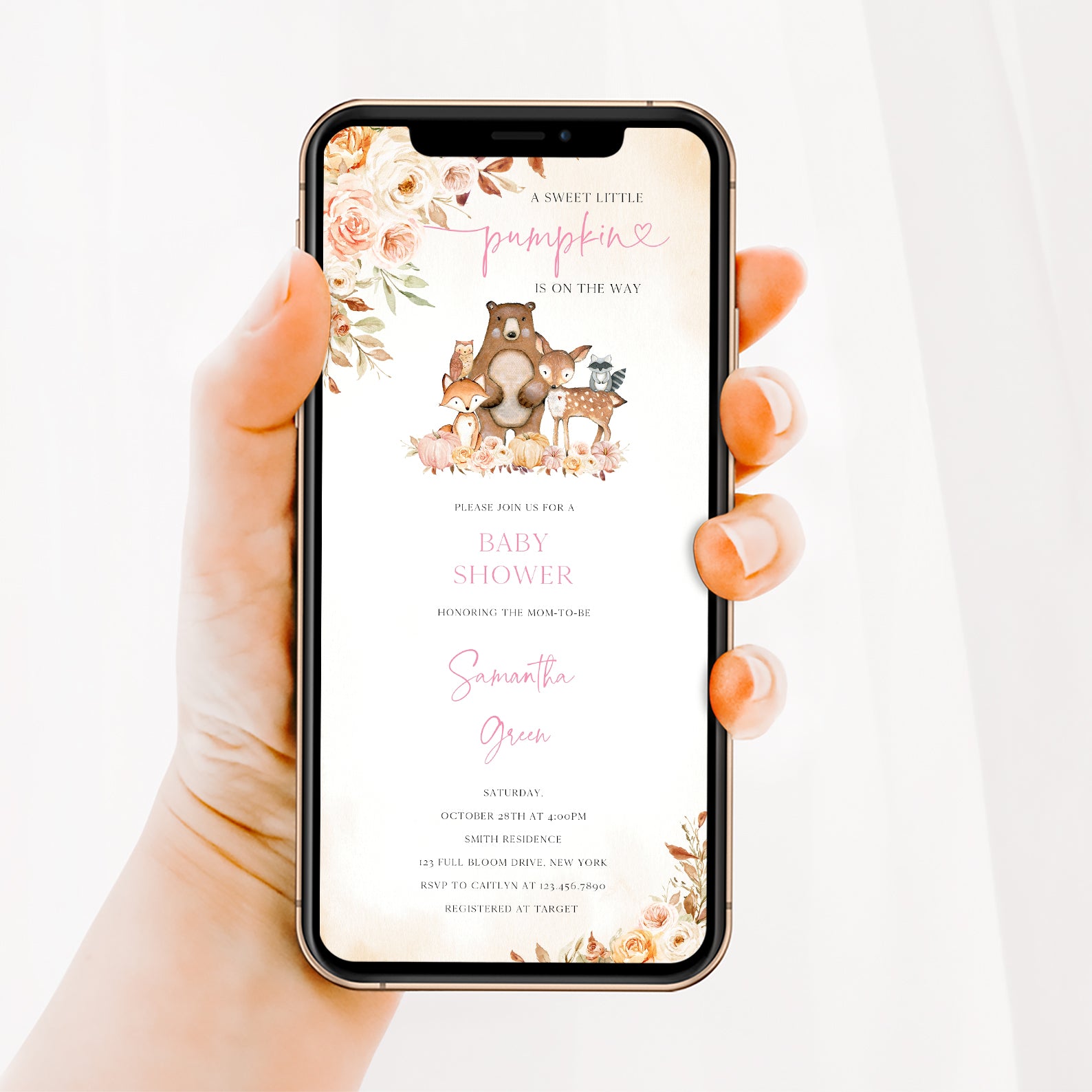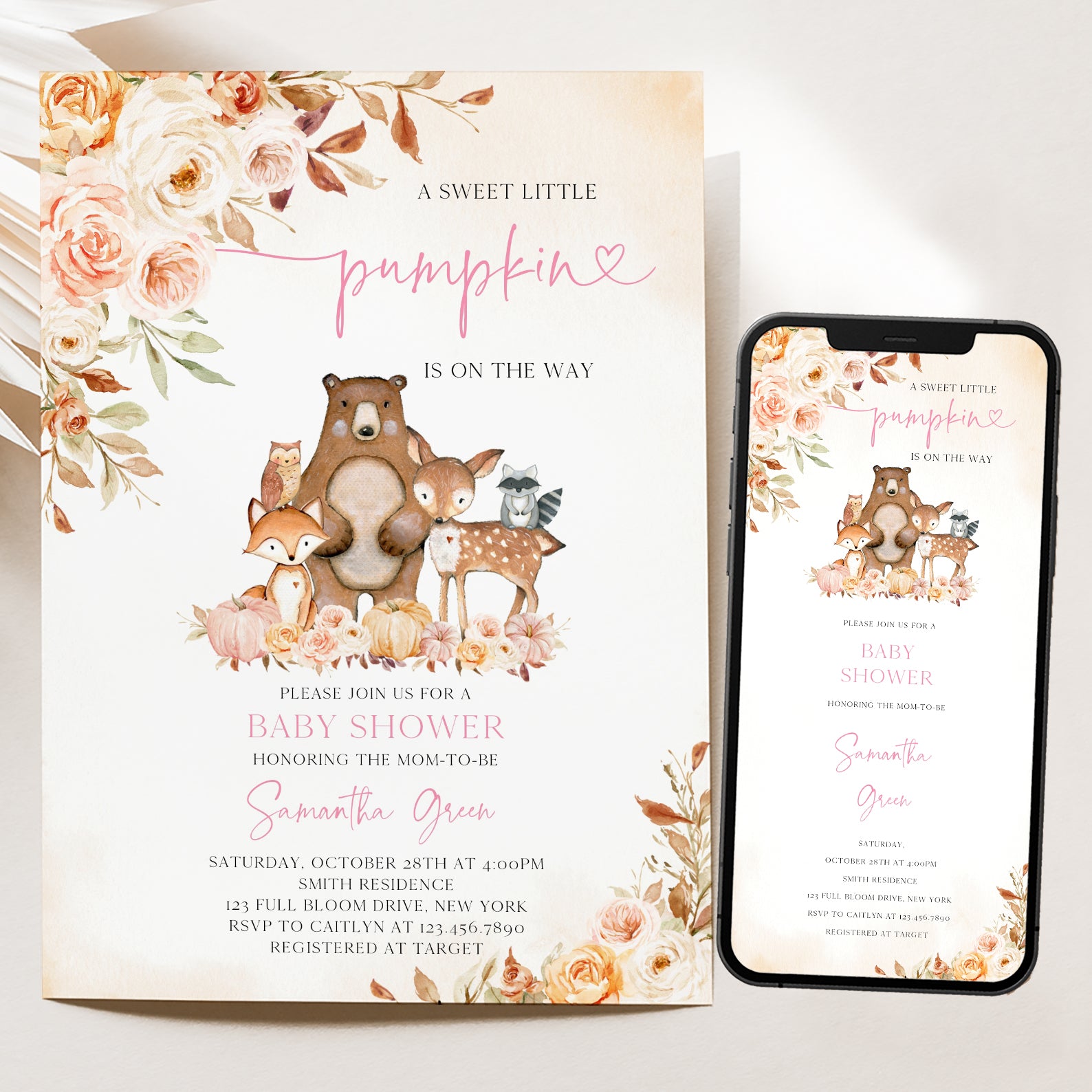 Celebrate the upcoming arrival of your little one with our charming fall baby shower digital invitation! Featuring an adorable sweet little pumpkin with delightful woodland animals, this invitation captures the essence of autumn. The design is beautifully accented with pumpkins and roses, complemented by a floral border that adds a touch of elegance. Choose from a lovely palette of pink, blue, or orange to perfectly match your theme and set the tone for a memorable celebration.