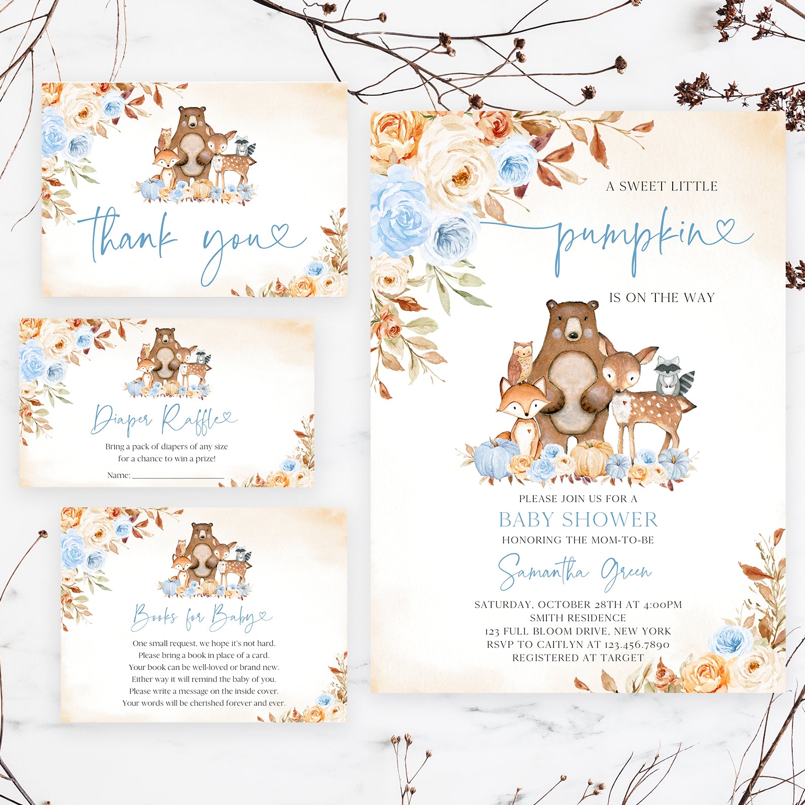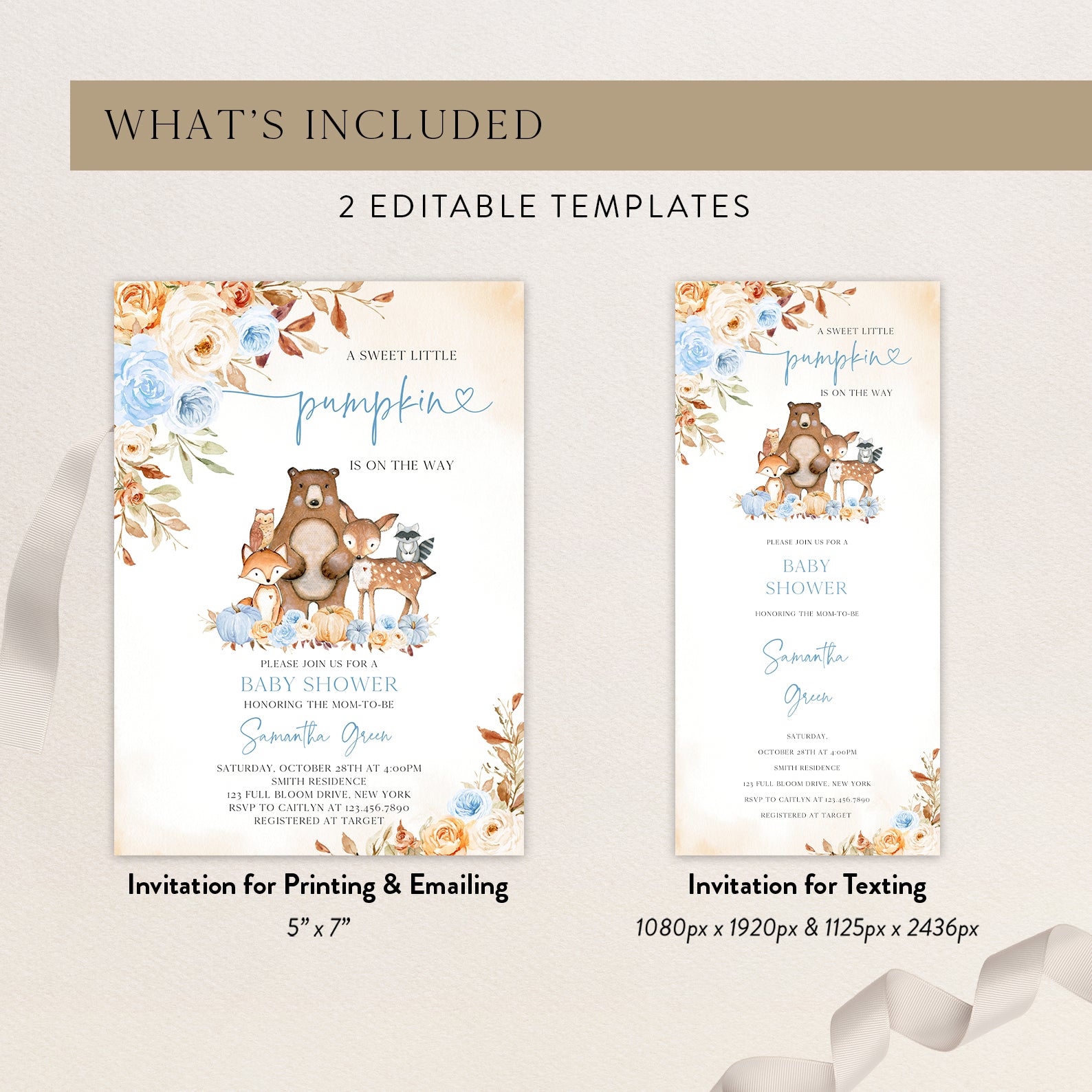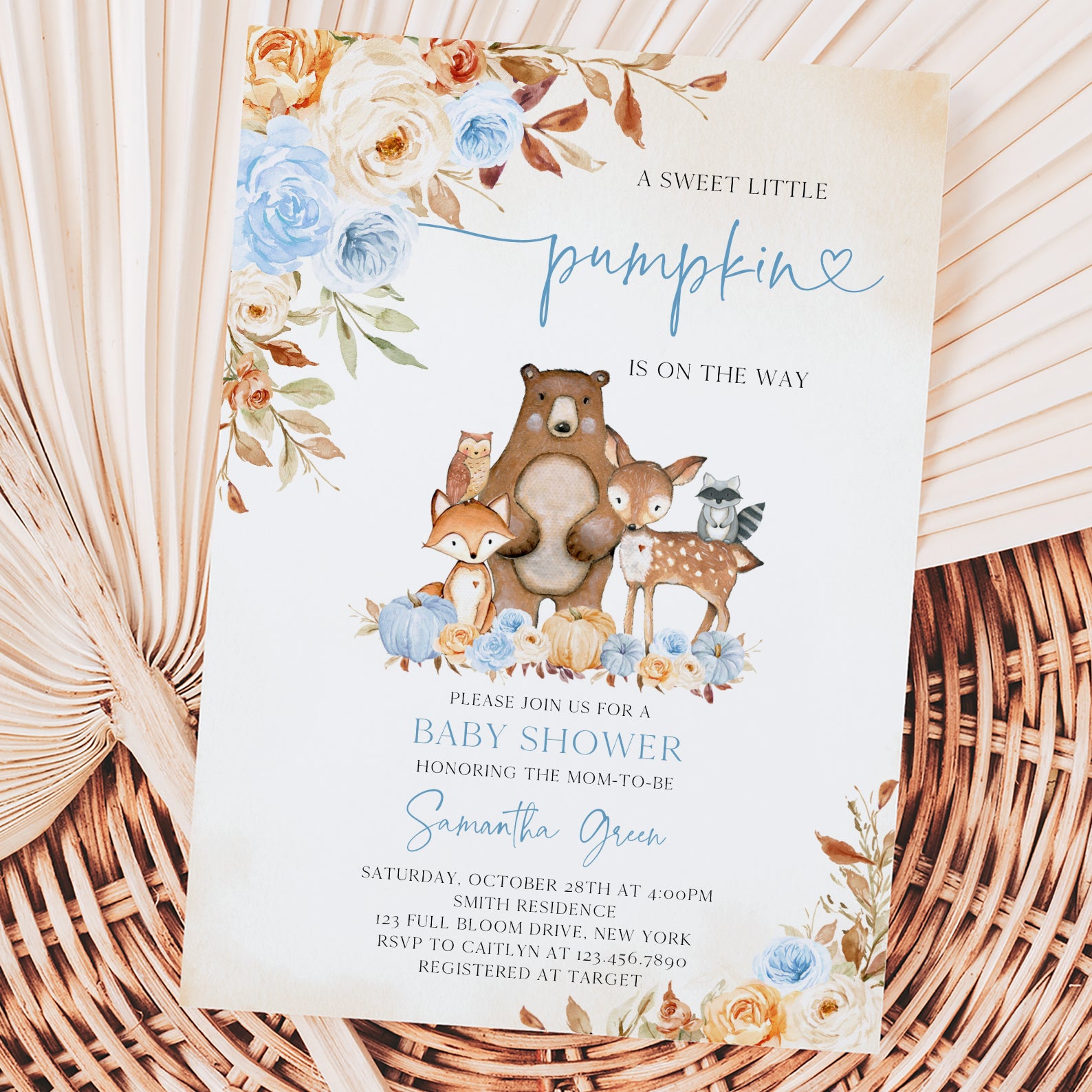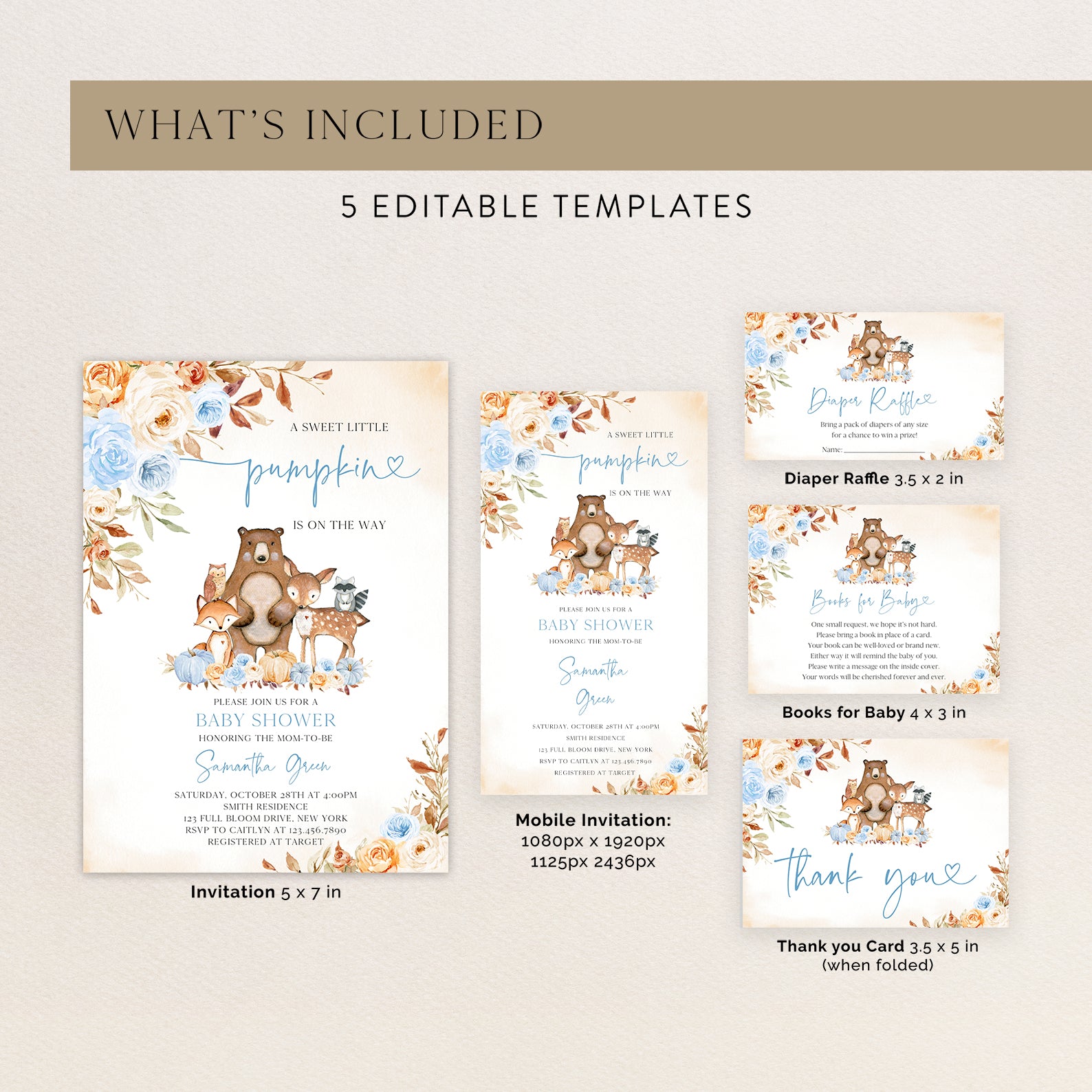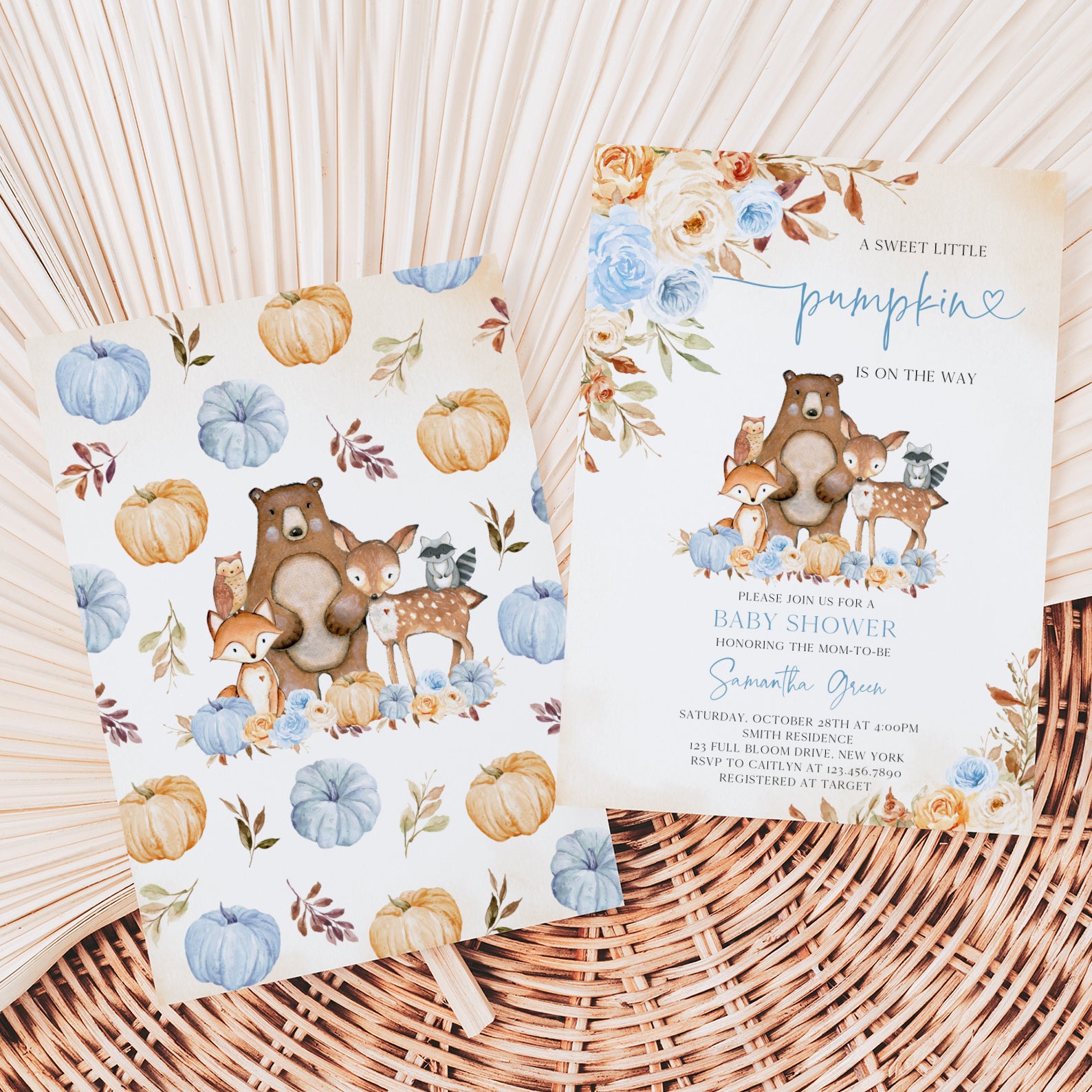 - Purchase this Sweet Little Pumpkin Blue Baby Shower Invite Bundle with Woodland Animals template