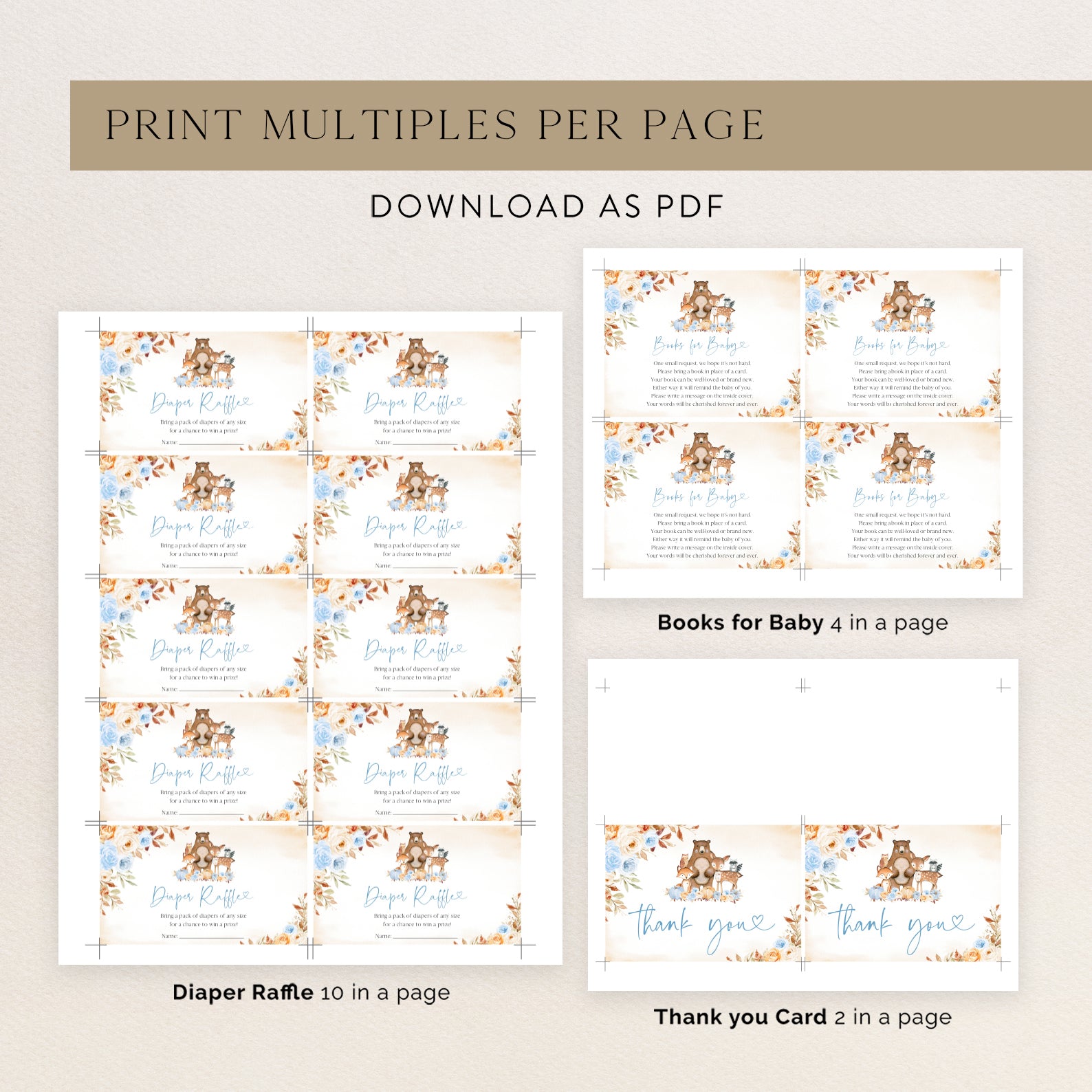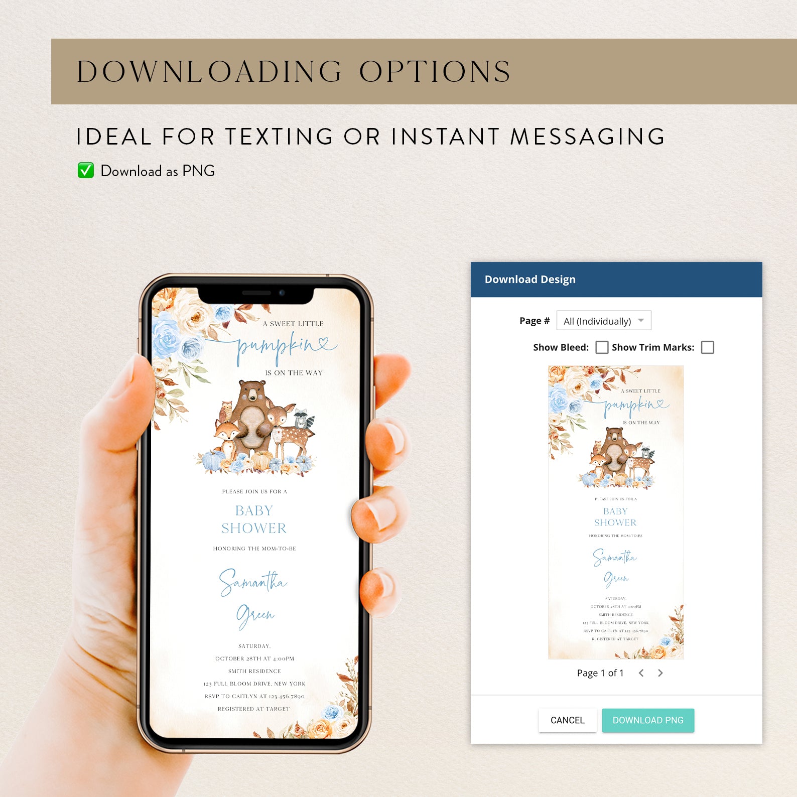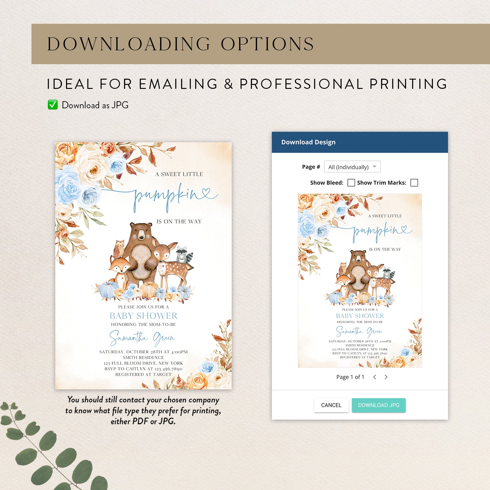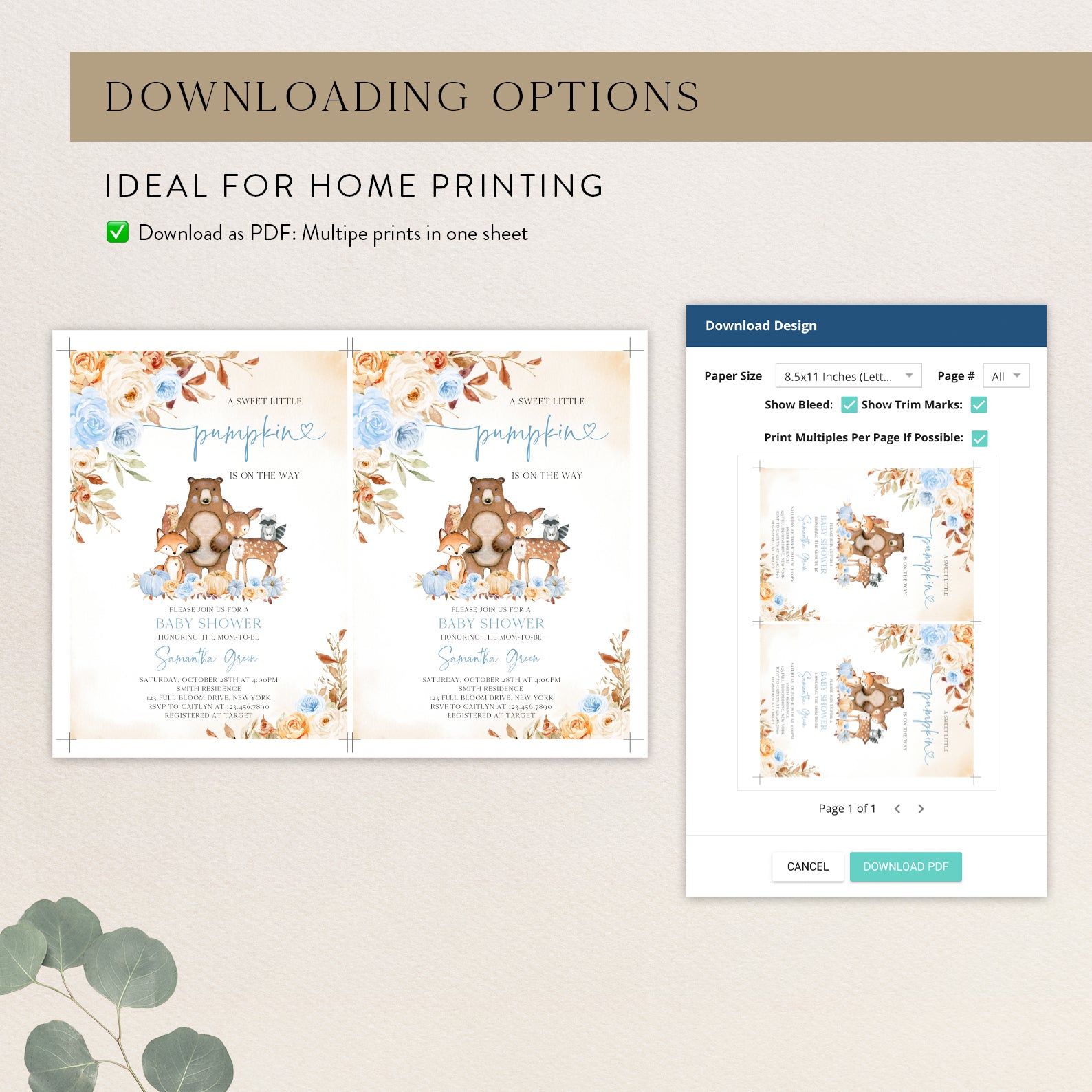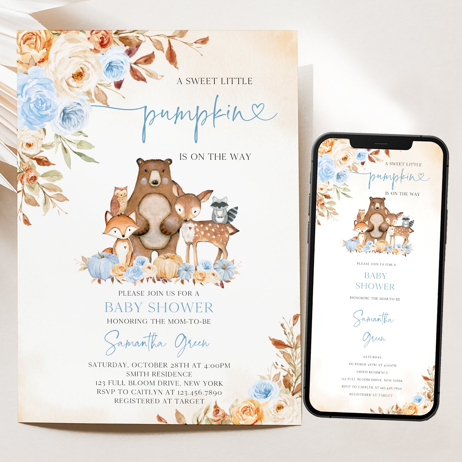 - Purchase this Sweet Little Pumpkin Blue Baby Shower Invite Bundle with Woodland Animals template