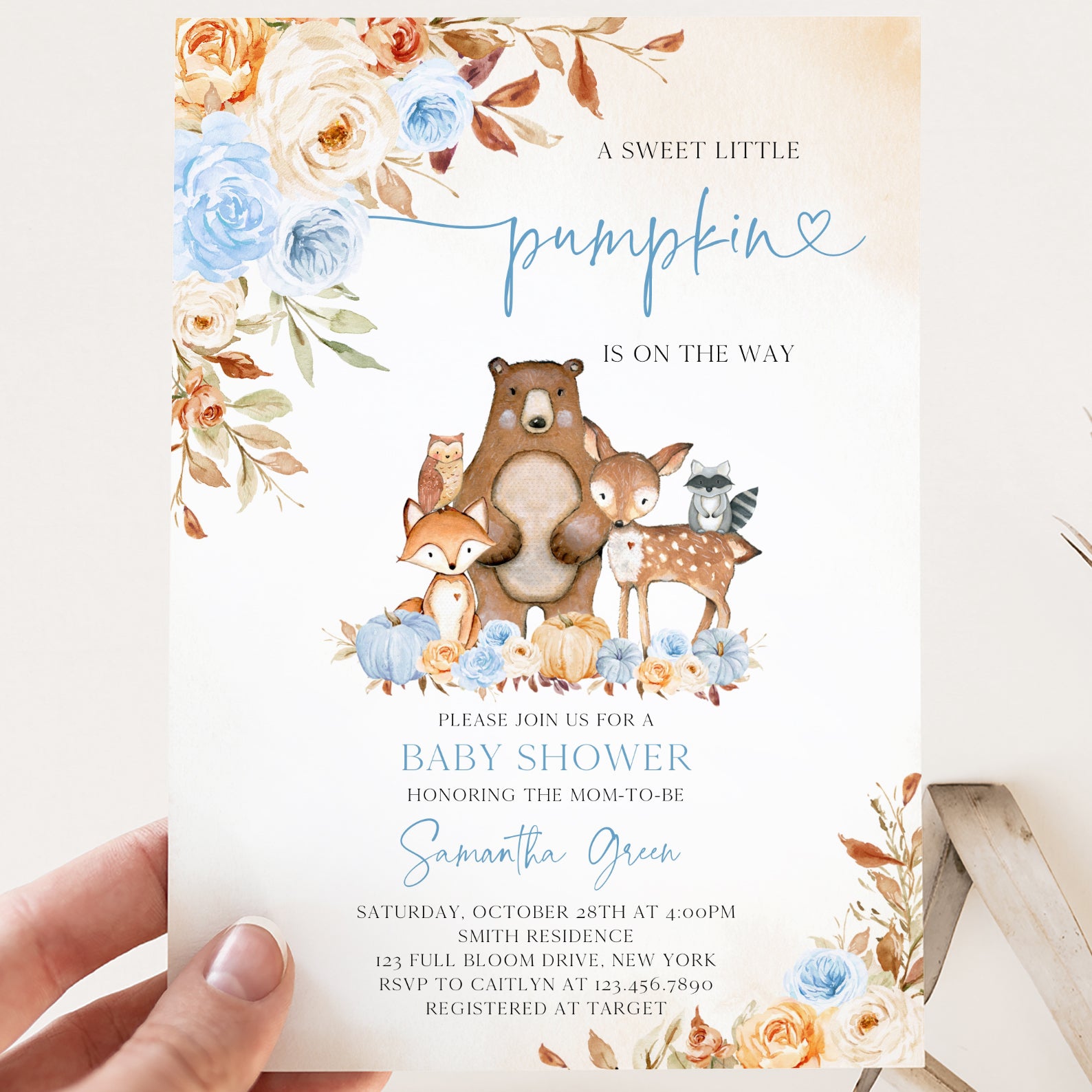 Sweet Little Pumpkin Blue Baby Shower Invite with Woodland Animals