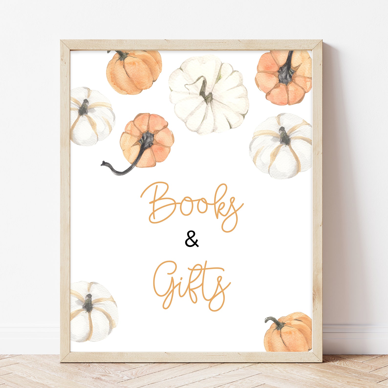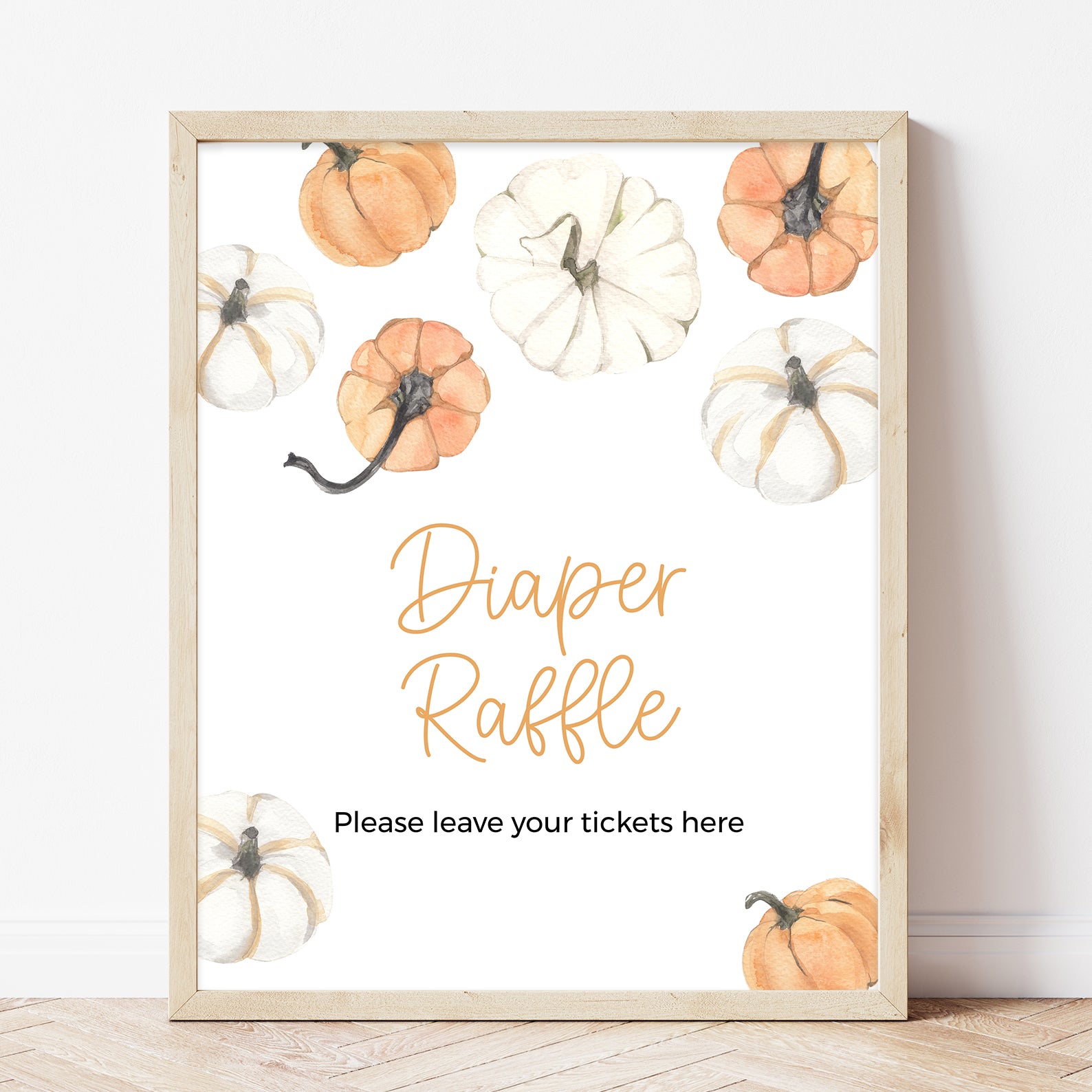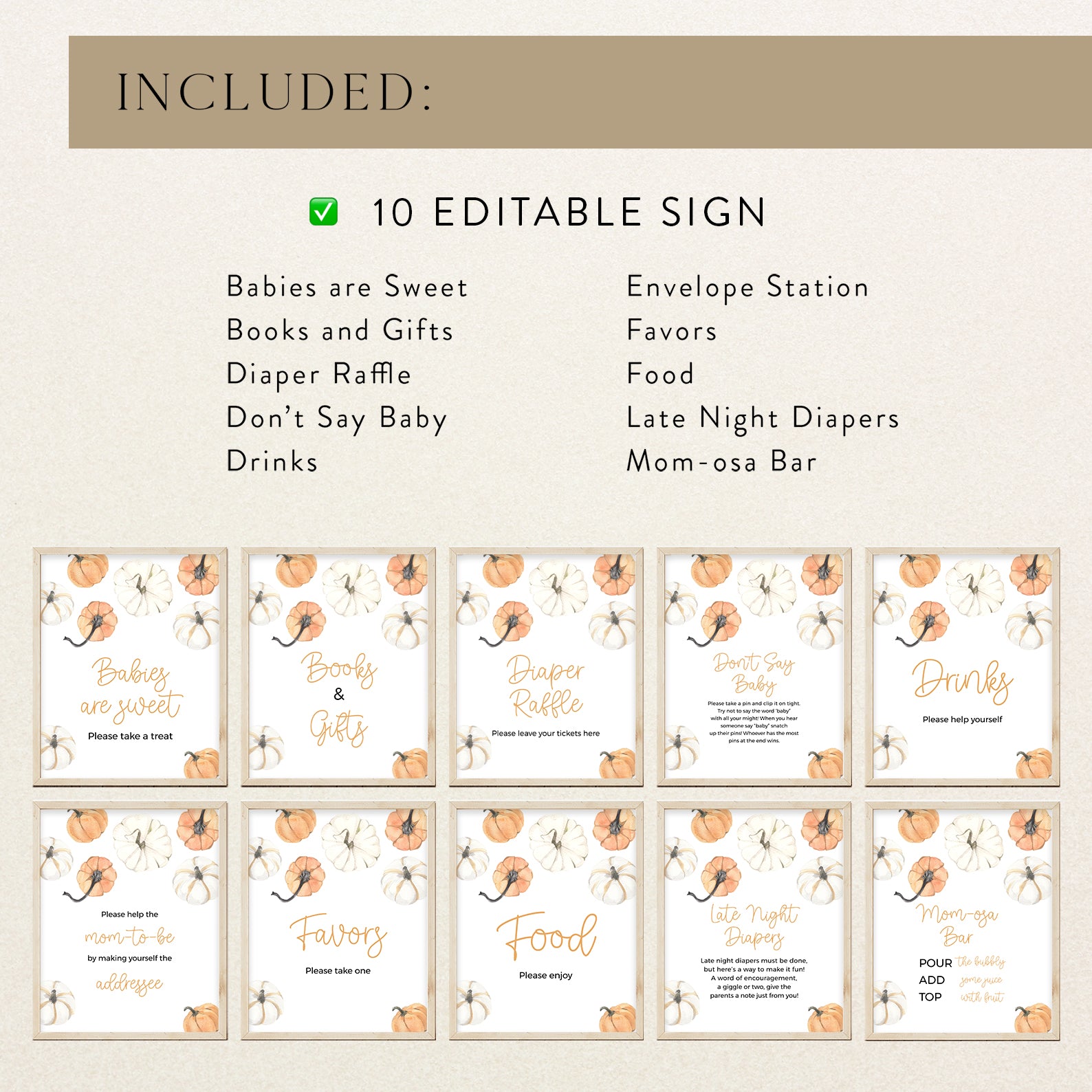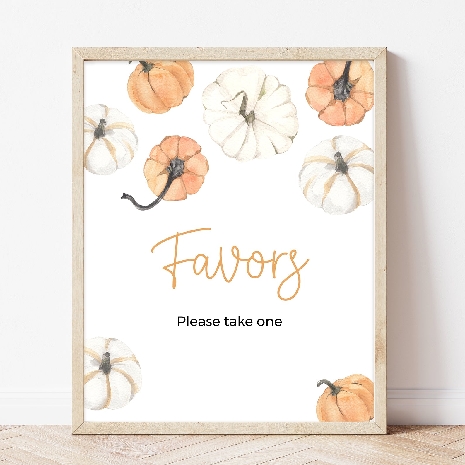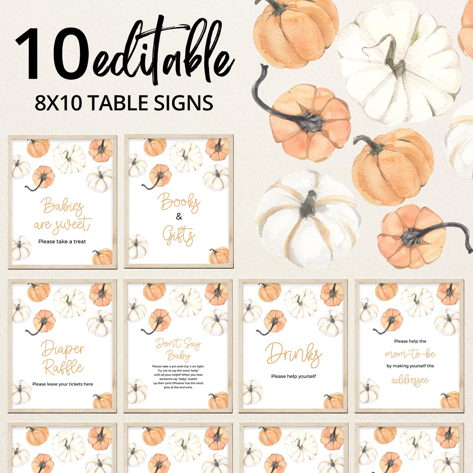 Add a festive touch to your fall baby shower with our editable table sign set, featuring orange and white watercolor pumpkins and soft autumn foliage. This charming bundle includes ten signs: Babies Are Sweet, Books and Gifts, Diaper Raffle, Don’t Say Baby, Drinks, Envelope Station, Favors, Food, Late Night Diapers, and Mom-osa Bar perfect for coordinating your party with cozy seasonal flair.