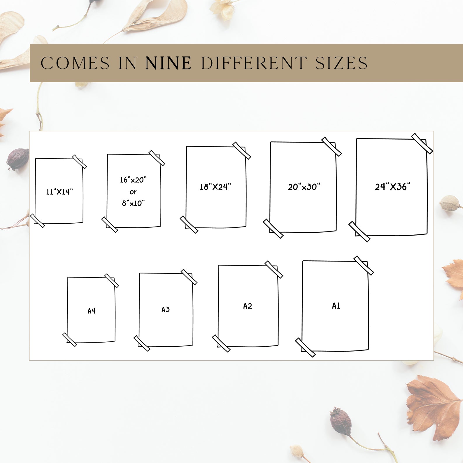 • US Standard Poster Sizes: 11"x14", 16"x20", 18"x24", 20"x30", 24"x36"