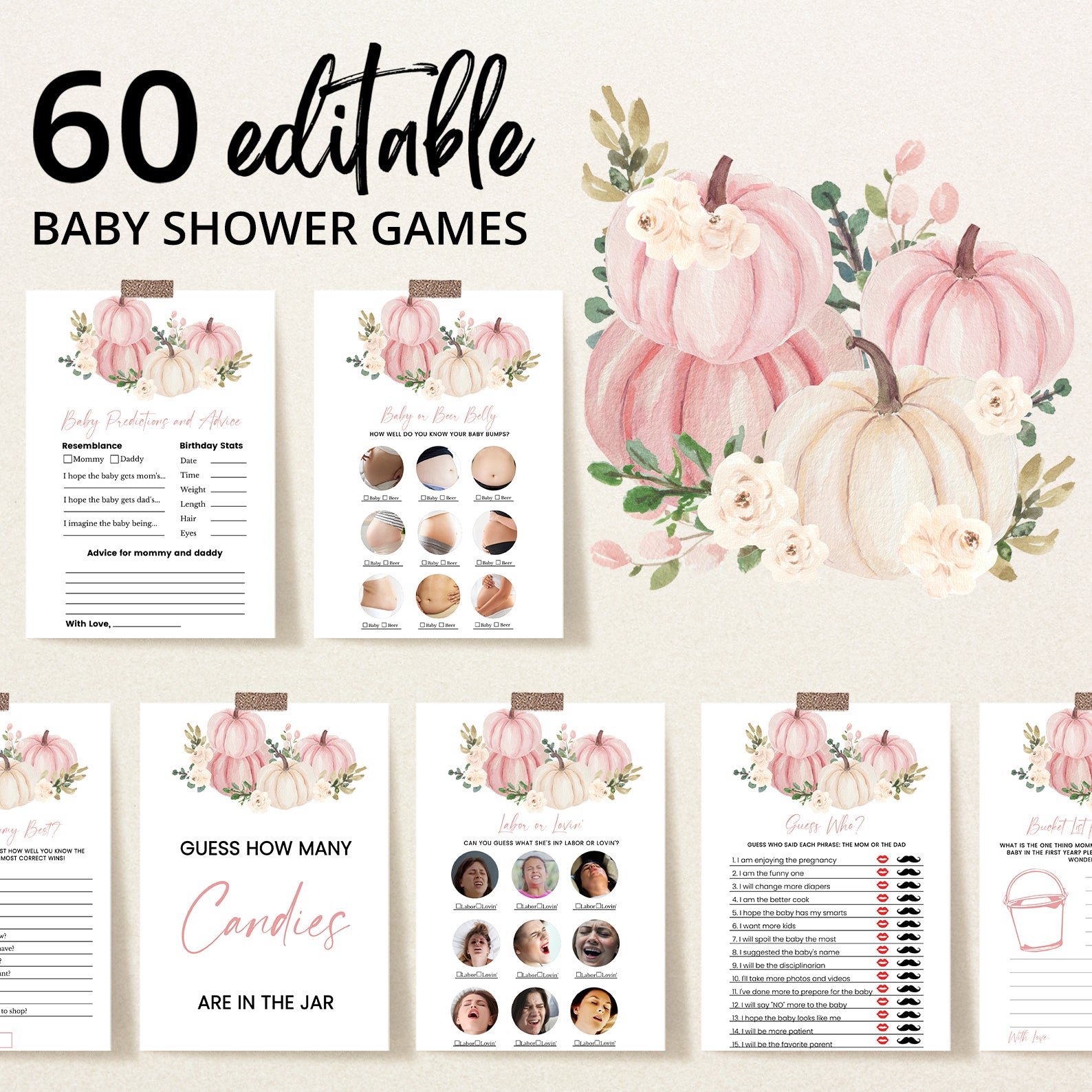 Make your baby shower extra fun with this bundle of 60 editable games, all wrapped in a sweet fall design. Adorned with pink and white pumpkins, watercolor florals, and soft greenery, these games offer entertainment and elegance. From guessing games to baby-themed trivia, they’re easy to personalize and perfect for adding laughter and connection to your cozy autumn gathering.