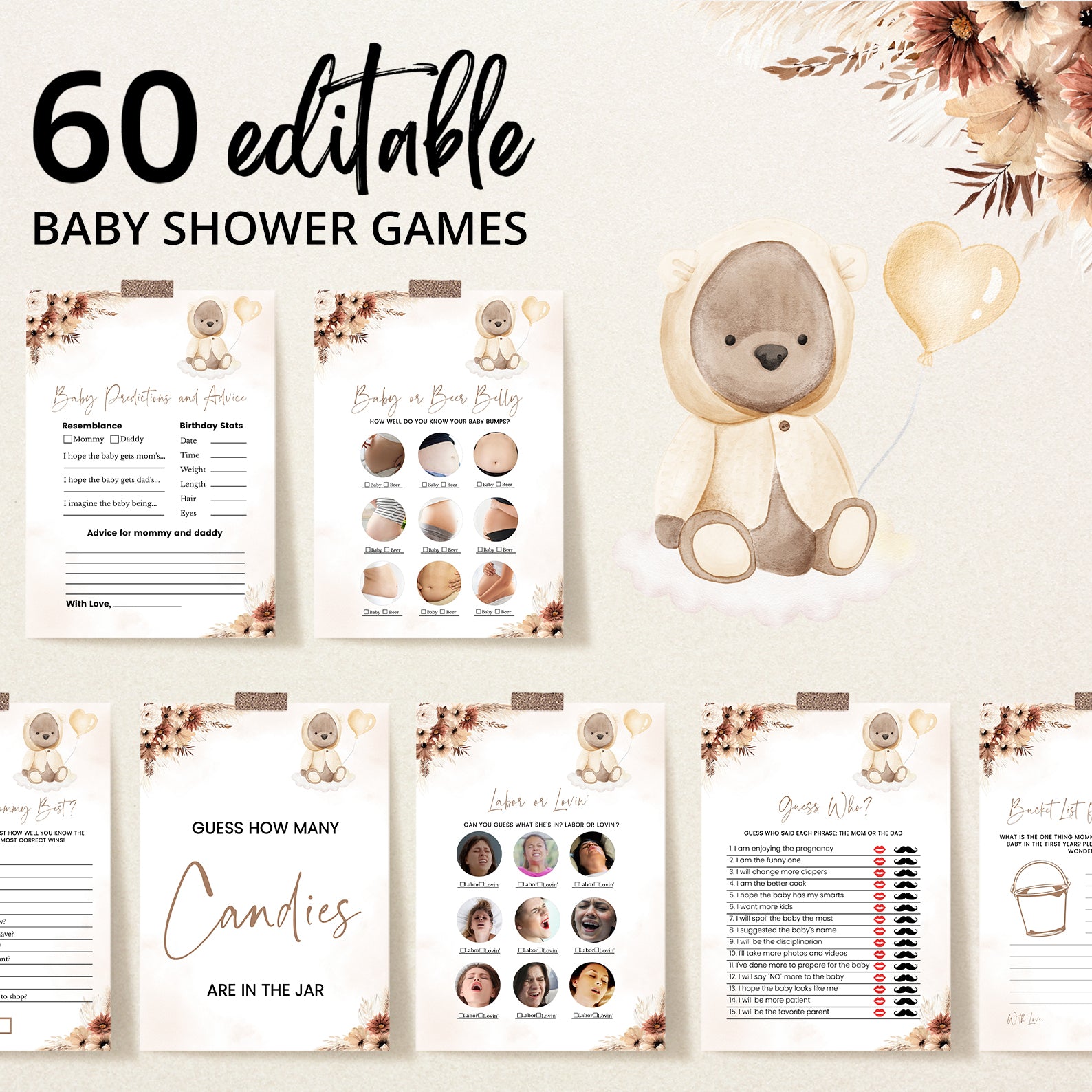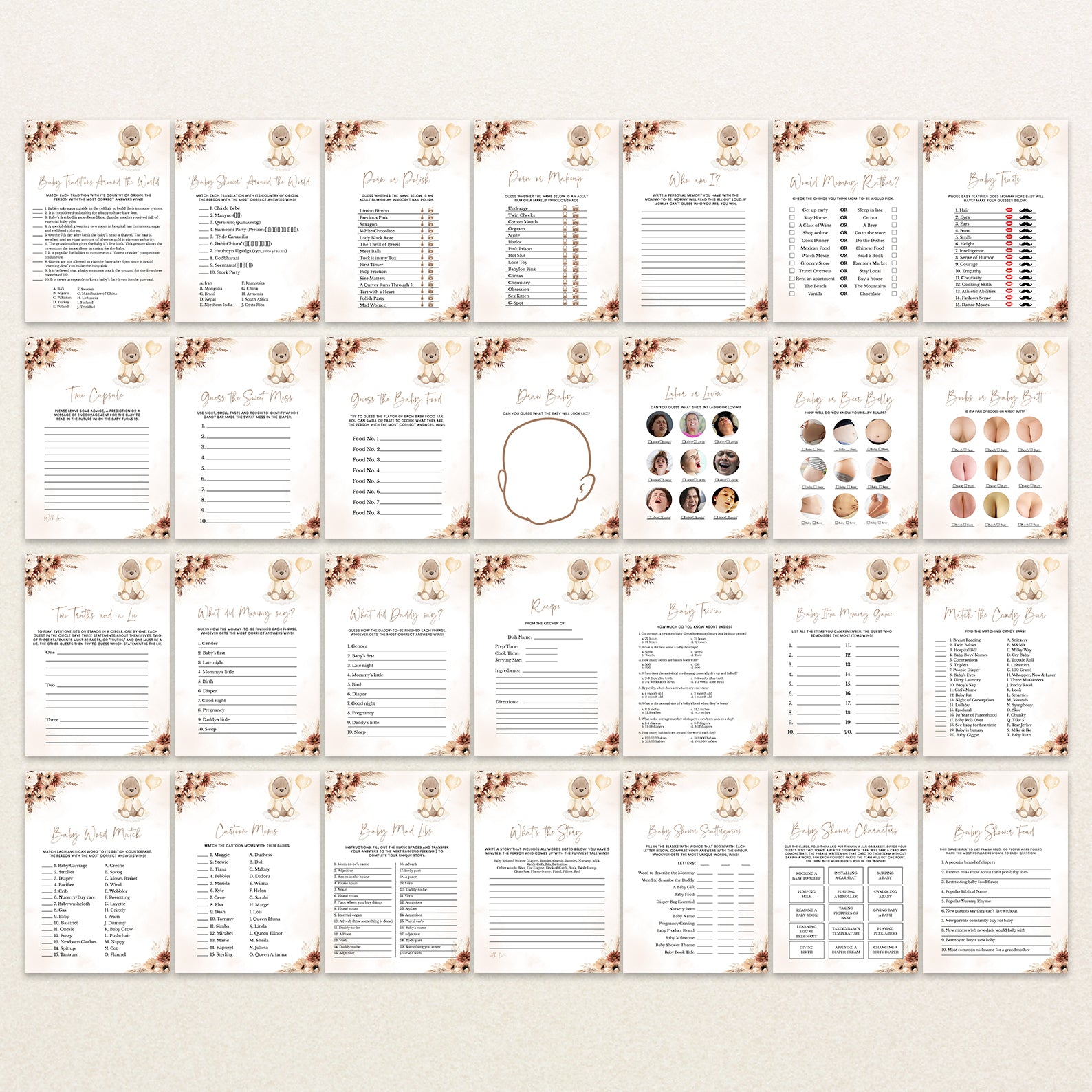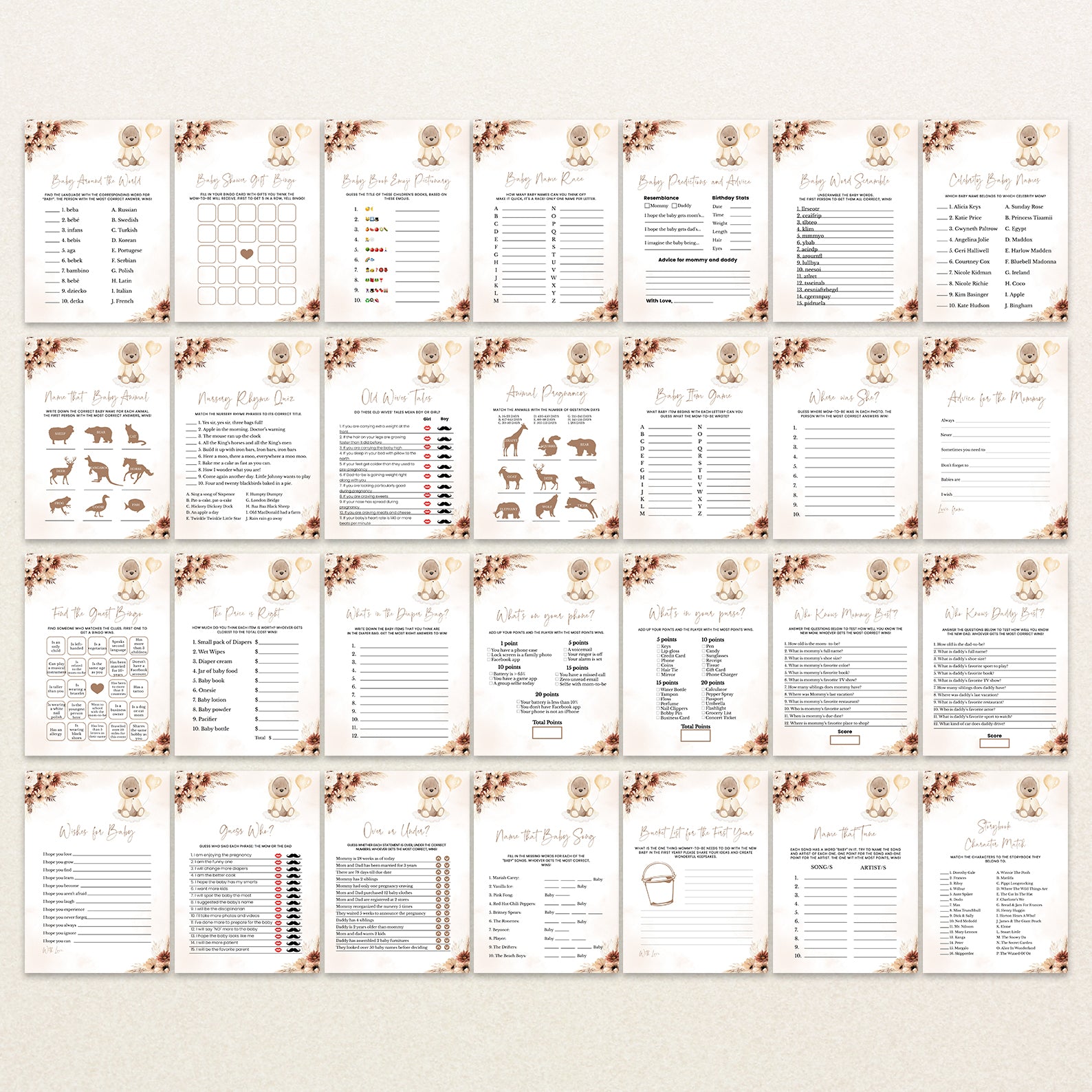 This fall-themed baby shower game bundle features 60 editable games, all styled with muted florals, pampas accents, and a touch of playful teddy bear charm. Perfect for keeping guests engaged and entertained, the bundle includes both classics and modern crowd-pleasers. Each design complements your cozy autumn palette and adds personality to your celebration with its gentle, boho-inspired aesthetic.