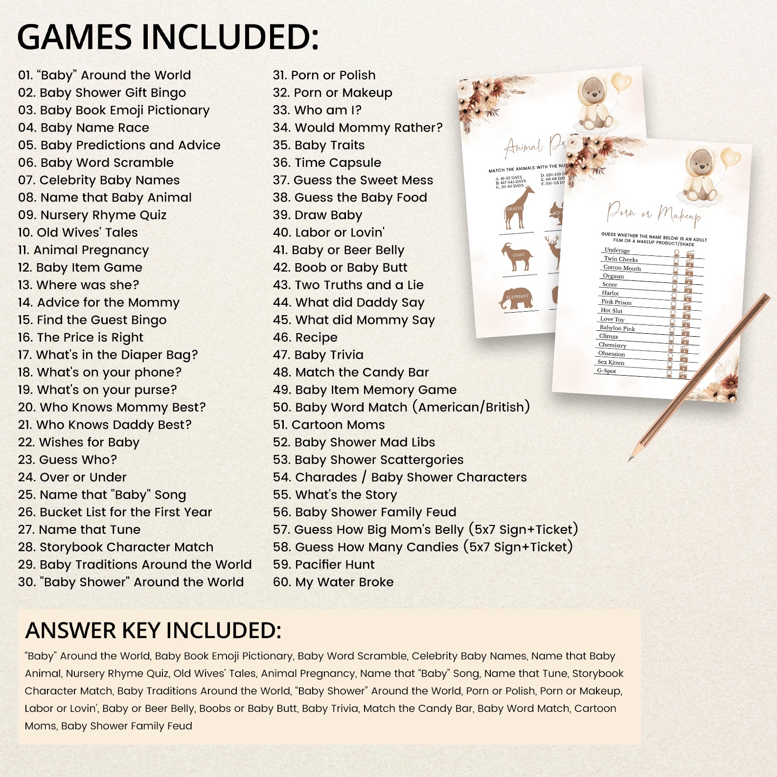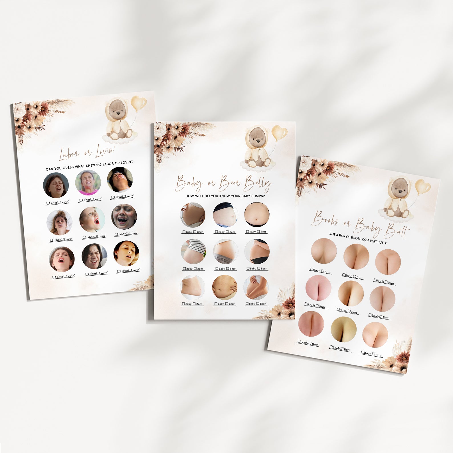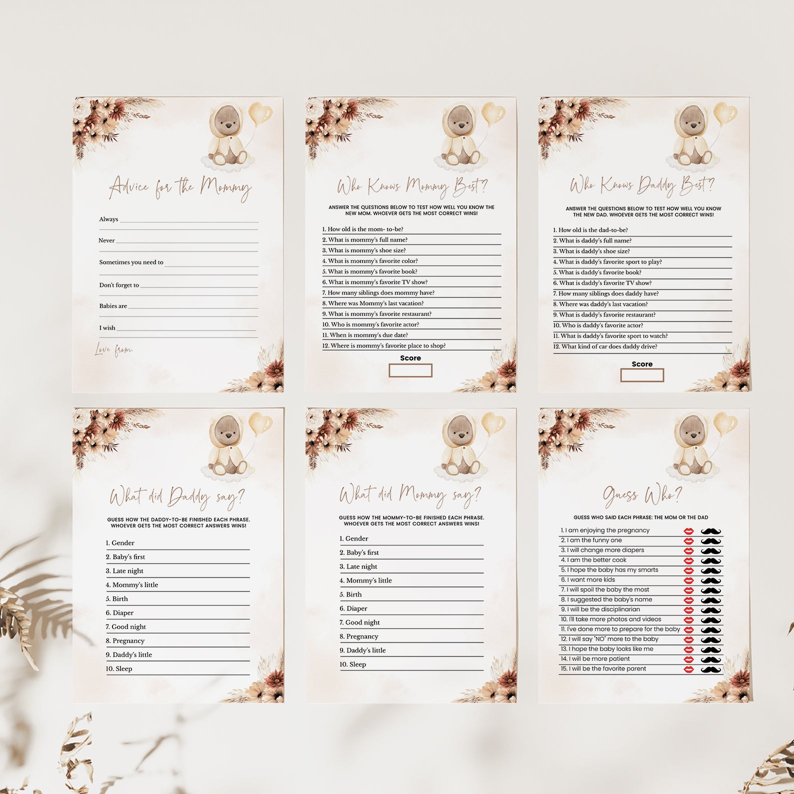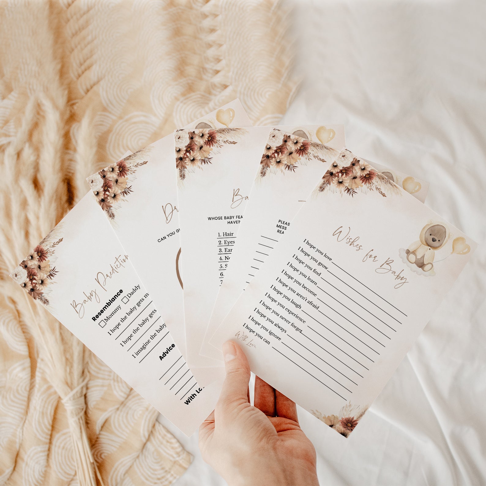 This fall-themed baby shower game bundle features 60 editable games, all styled with muted florals, pampas accents, and a touch of playful teddy bear charm. Perfect for keeping guests engaged and entertained, the bundle includes both classics and modern crowd-pleasers. Each design complements your cozy autumn palette and adds personality to your celebration with its gentle, boho-inspired aesthetic.