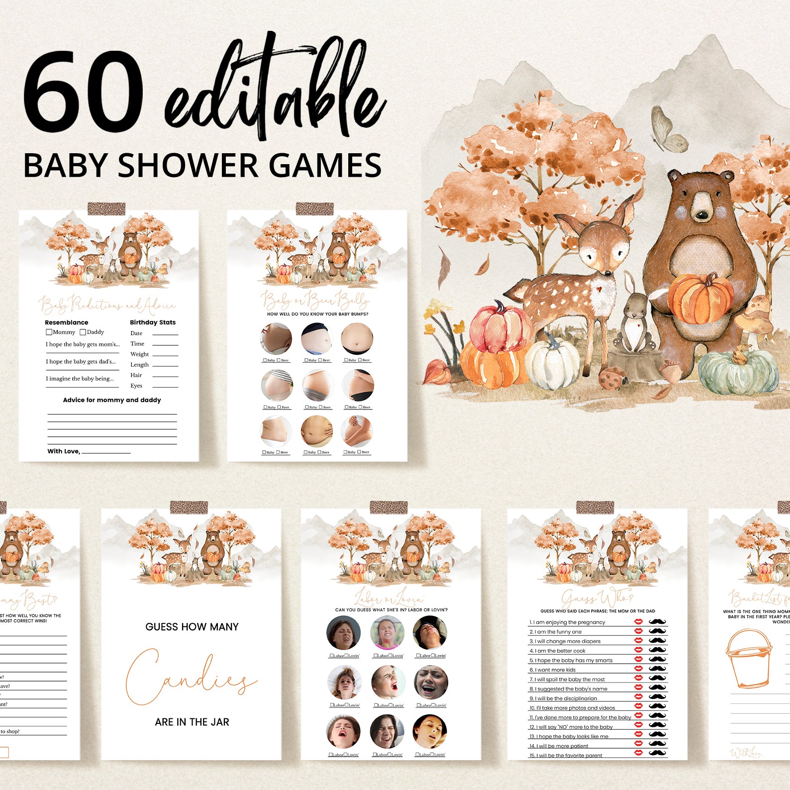 Make your baby shower extra fun with this ultimate bundle of 60 editable baby shower games! Perfect for a fall-themed or woodland celebration, this collection features charming watercolor details like forest animals, soft foliage, and cozy autumn hues. From classics like Baby Bingo and Who Knows Mommy Best to fun icebreakers and trivia, each game is easy to customize and print perfect for creating laughter and memories at your special event.