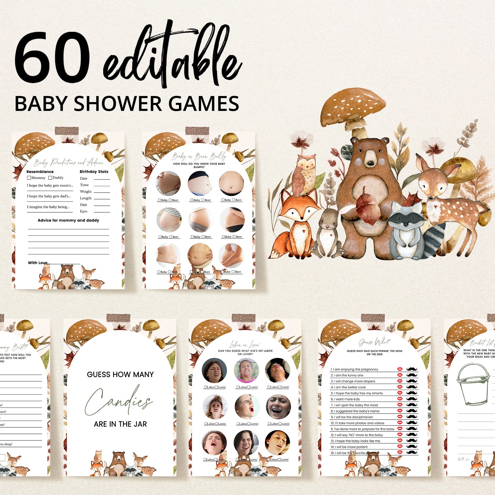 Get ready to celebrate with our fun and festive bundle of 60 editable baby shower games! Perfectly themed for fall, these games feature charming woodland animals, colorful mushrooms, and autumn leaves to bring warmth and joy to your gathering. Easy to personalize and play, this collection will keep your guests entertained while adding a cozy, seasonal touch to your special day.