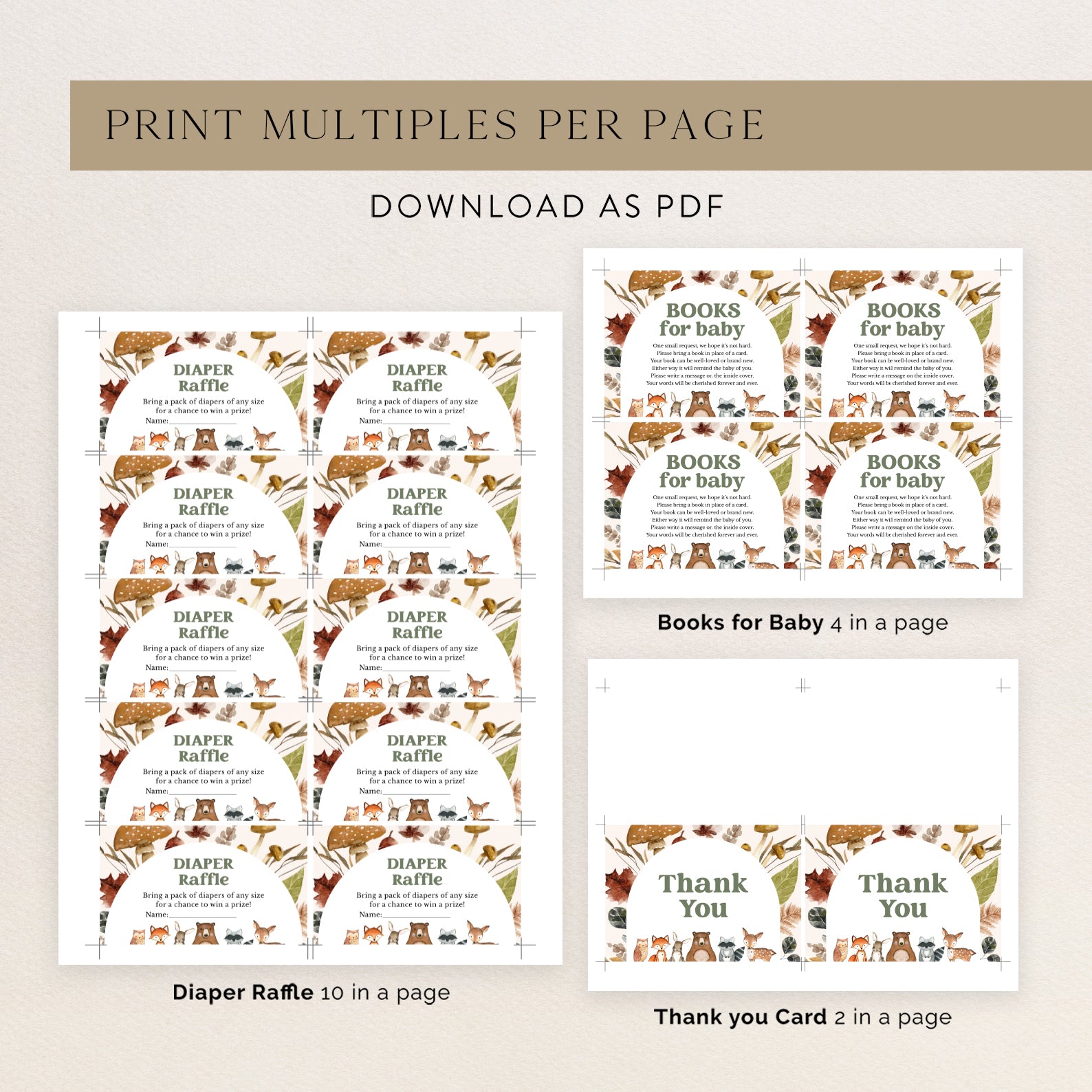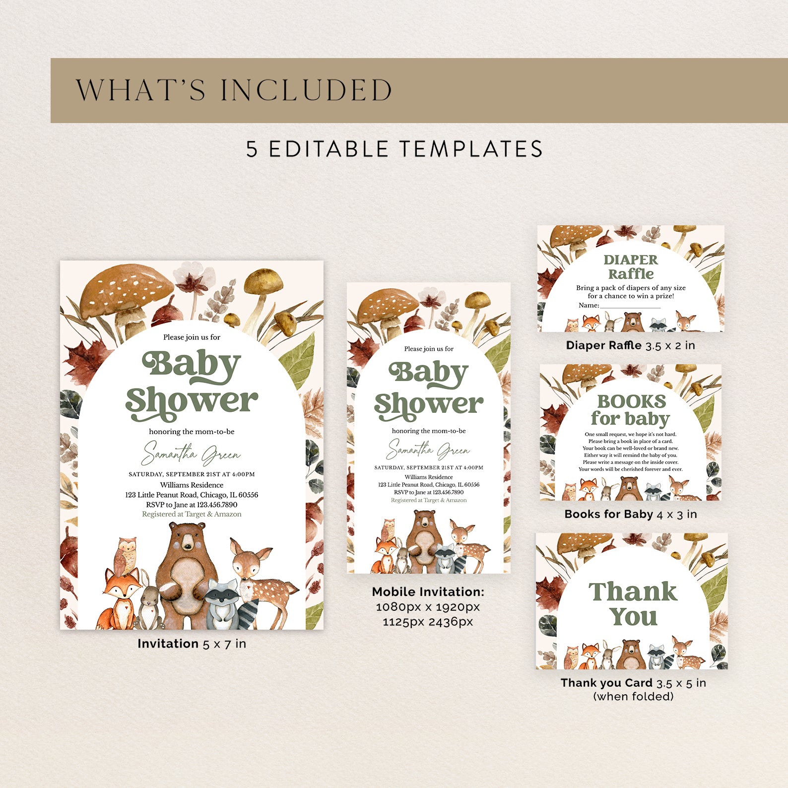 Welcome your little one with our Fall Baby Shower Bundle. This set, featuring a woodland animal arch with vibrant mushrooms and leaves, includes an invitation, mobile invite, diaper raffle, books for baby card, and thank you card. Perfect for a cozy, nature-inspired celebration!