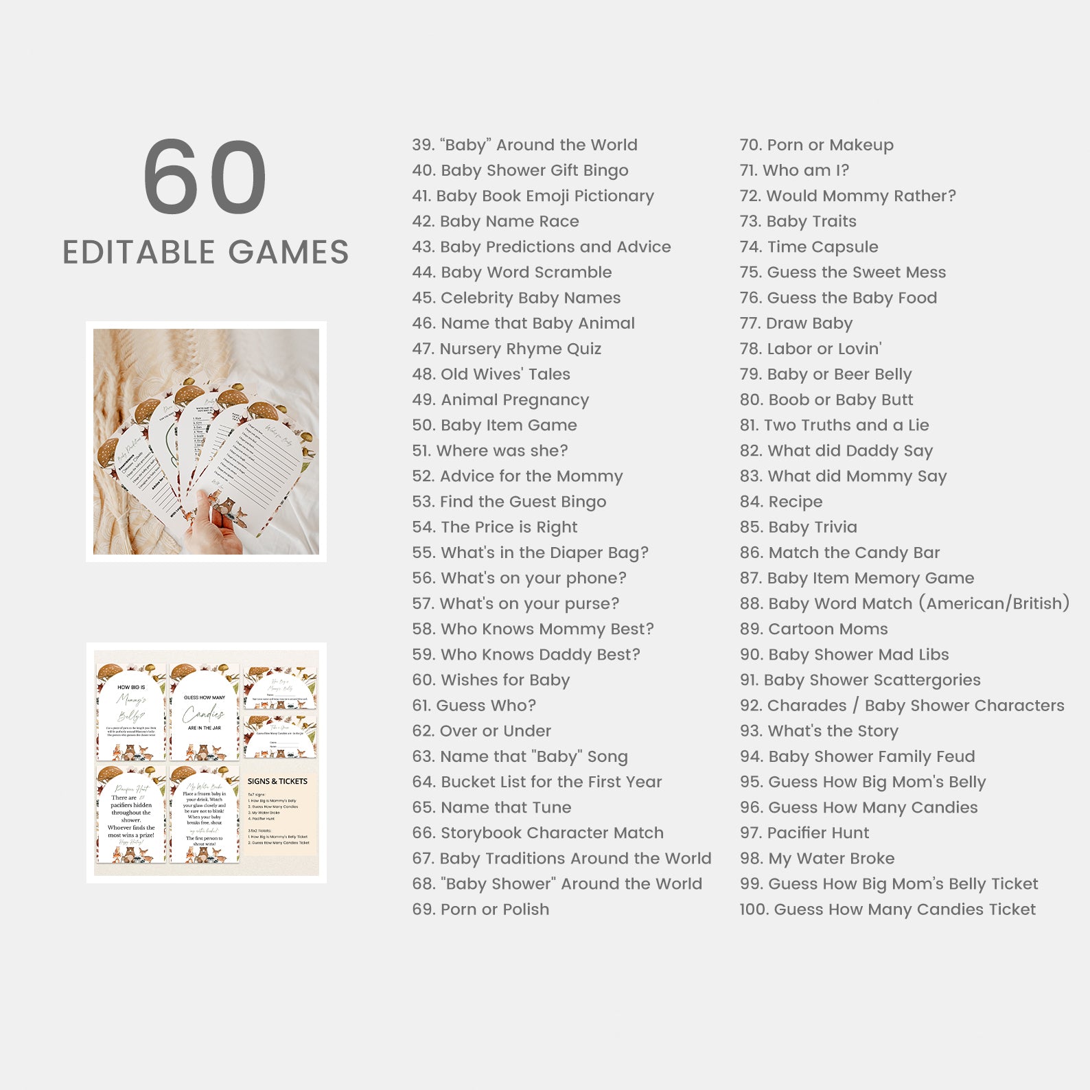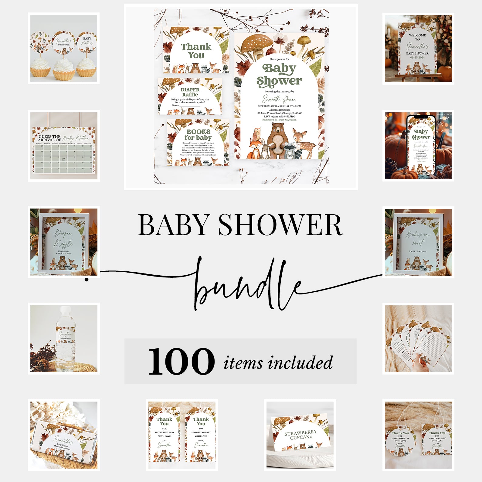 Celebrate the upcoming arrival of your little one with our all-in-one fall baby shower mega bundle! This collection includes 100 beautifully designed items from invitations and thank you cards to diaper raffles, table signs, favor tags, and editable games. Featuring a charming woodland theme with colorful mushrooms, playful animals, and autumn leaves, this bundle brings cozy seasonal warmth and joyful elegance to every aspect of your celebration. Easy to customize and perfect for making lasting memories!