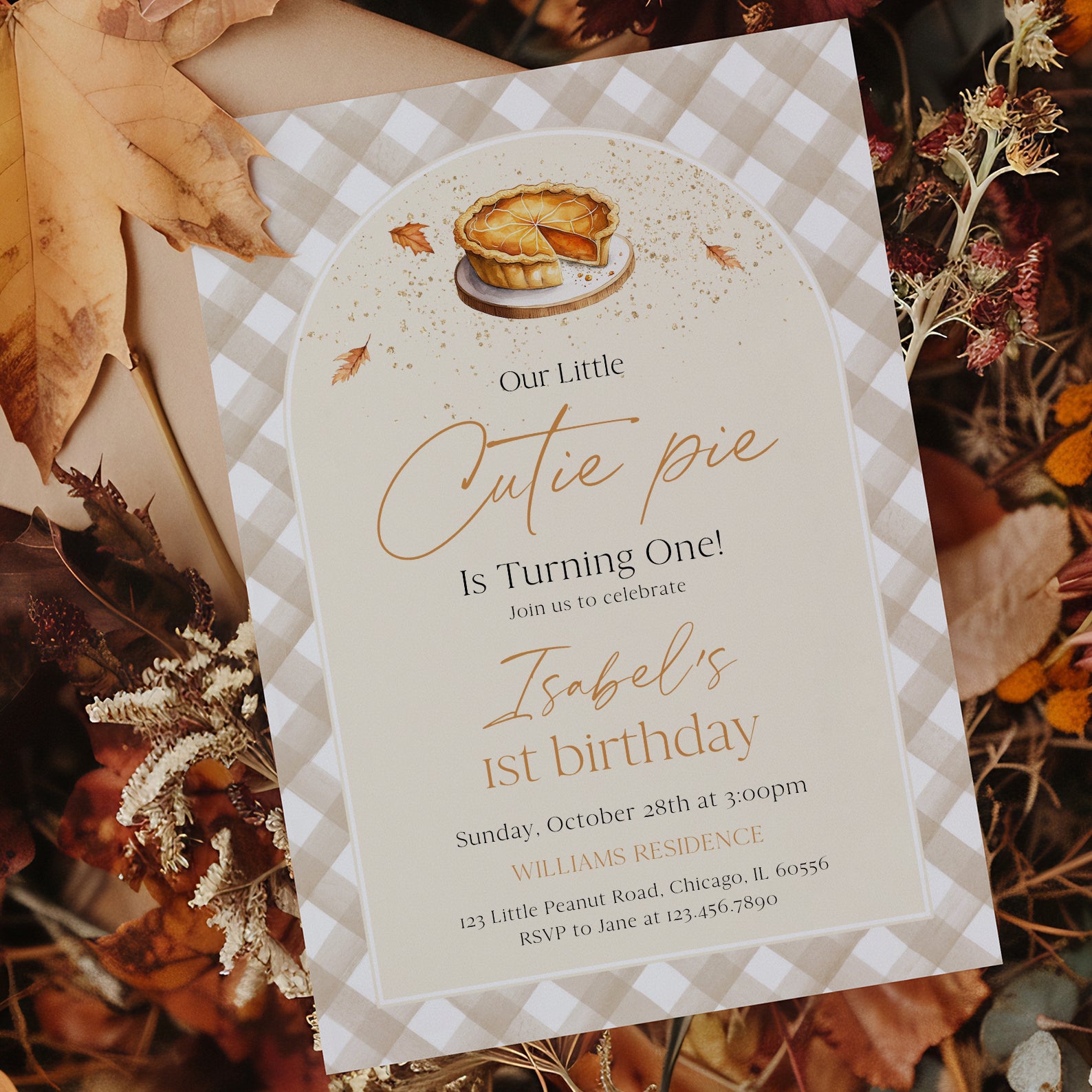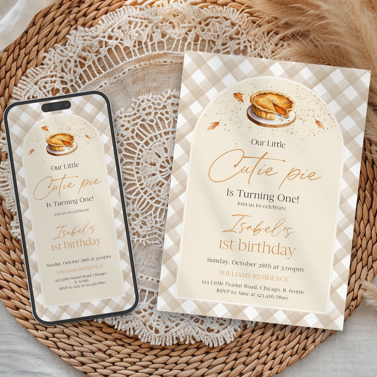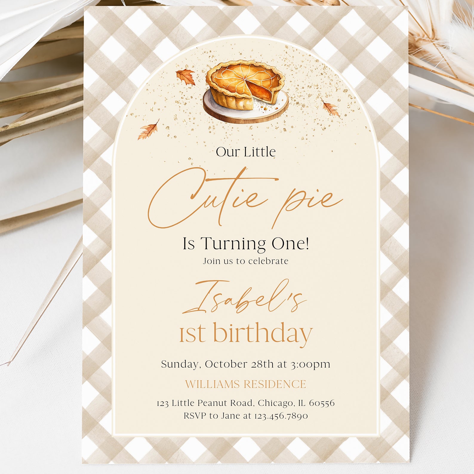 Celebrate your little cutie pie's first birthday with our charming fall-themed digital invitation! Featuring a cozy brown plaid background, this delightful design showcases a light peach arch that beautifully frames the details of your event. Adorned with a mouthwatering baked pie, elegant gold accents, and whimsical fall leaves, this invitation captures the essence of autumn festivities. Perfect for inviting friends and family to join in the celebration, it's a sweet way to mark this special milestone. Make your child's birthday unforgettable with this enchanting invitation!