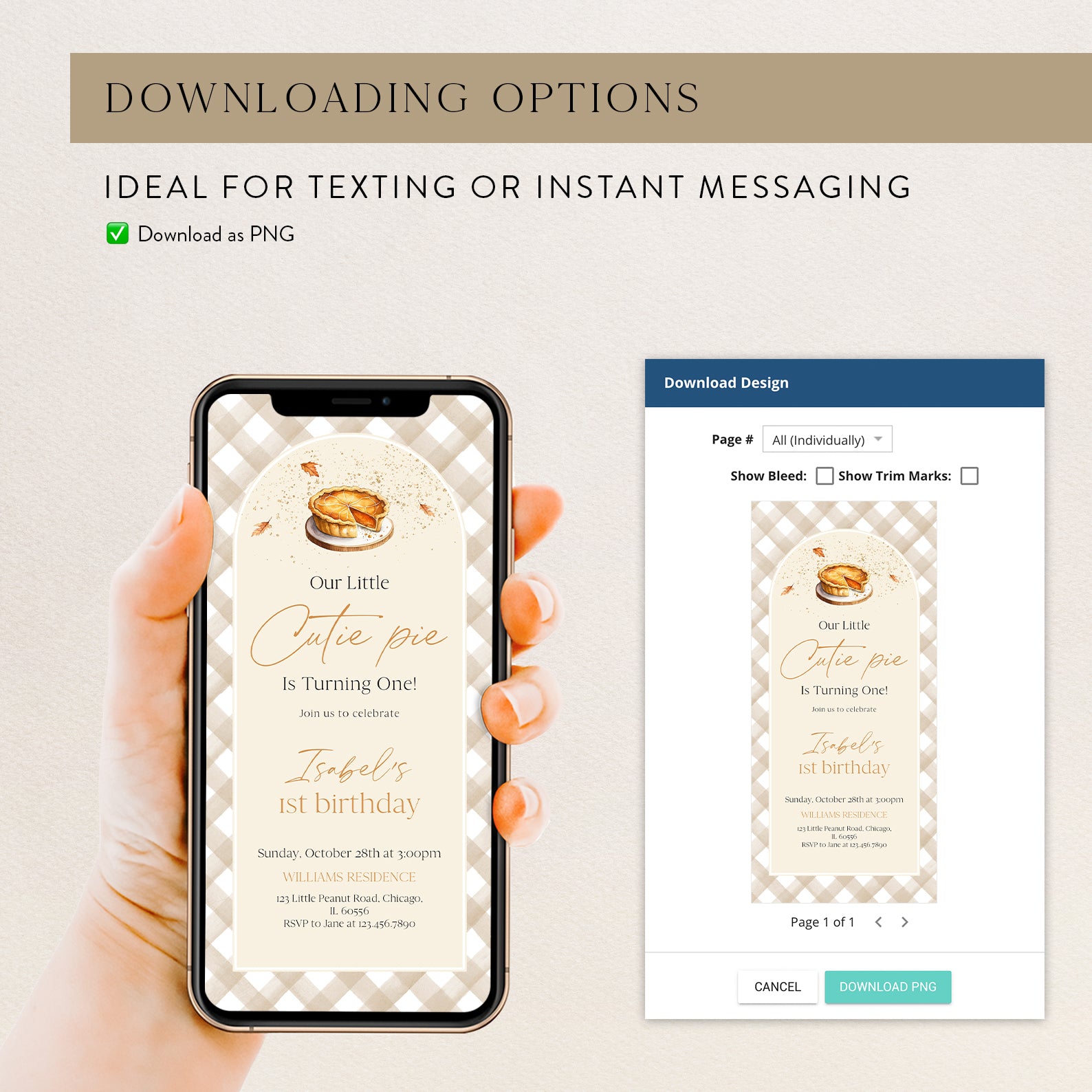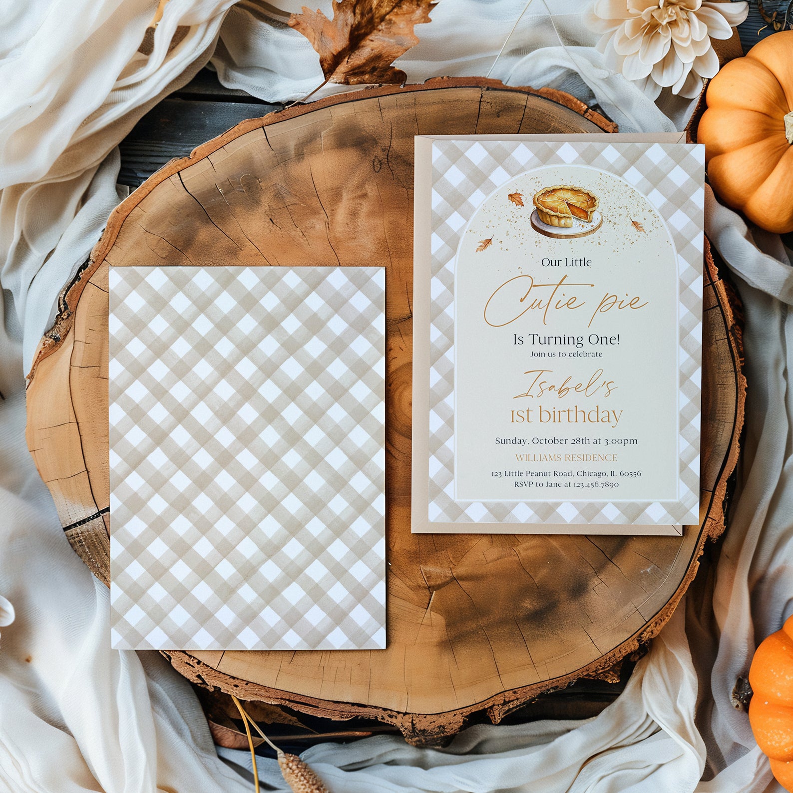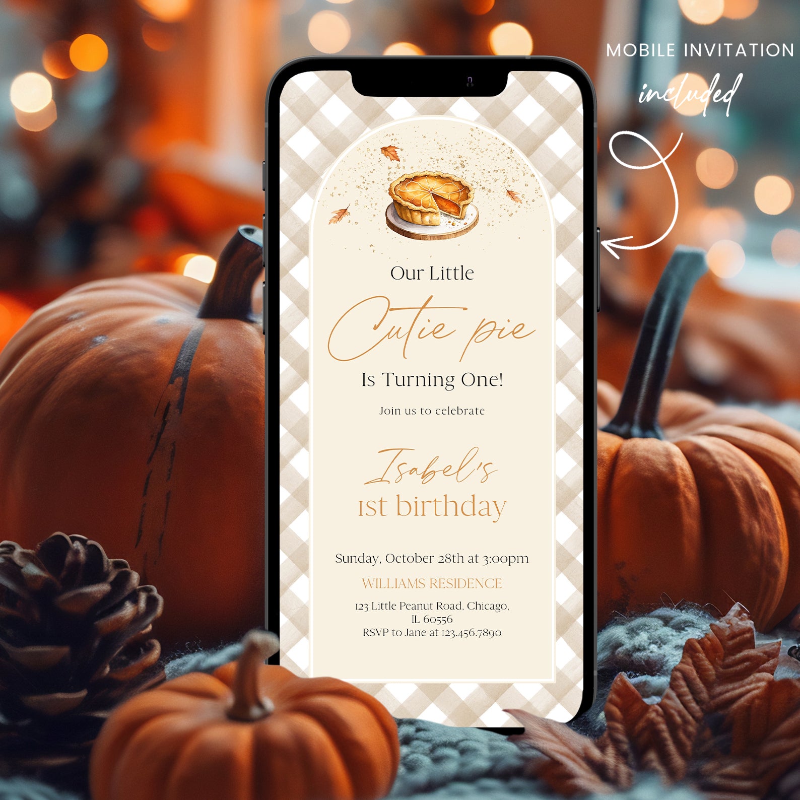 Celebrate your little cutie pie's first birthday with our charming fall-themed digital invitation! Featuring a cozy brown plaid background, this delightful design showcases a light peach arch that beautifully frames the details of your event. Adorned with a mouthwatering baked pie, elegant gold accents, and whimsical fall leaves, this invitation captures the essence of autumn festivities. Perfect for inviting friends and family to join in the celebration, it's a sweet way to mark this special milestone. Make your child's birthday unforgettable with this enchanting invitation!